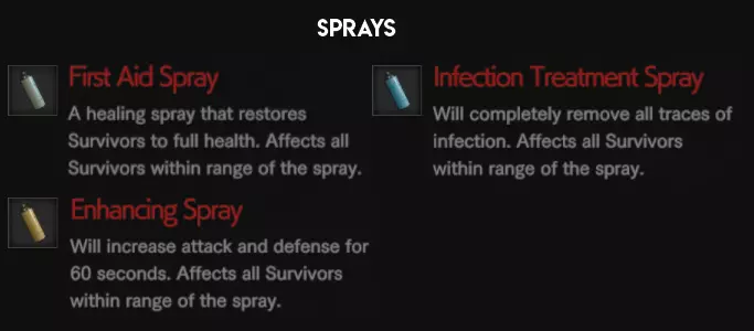 与草药类道具类似,喷雾具有相同效果,但作用对象为整个队伍而非单个玩家。 喷雾持续时间约为4秒。 你可以使用【一月网络星期一 - 药房】购买喷雾。 弹药