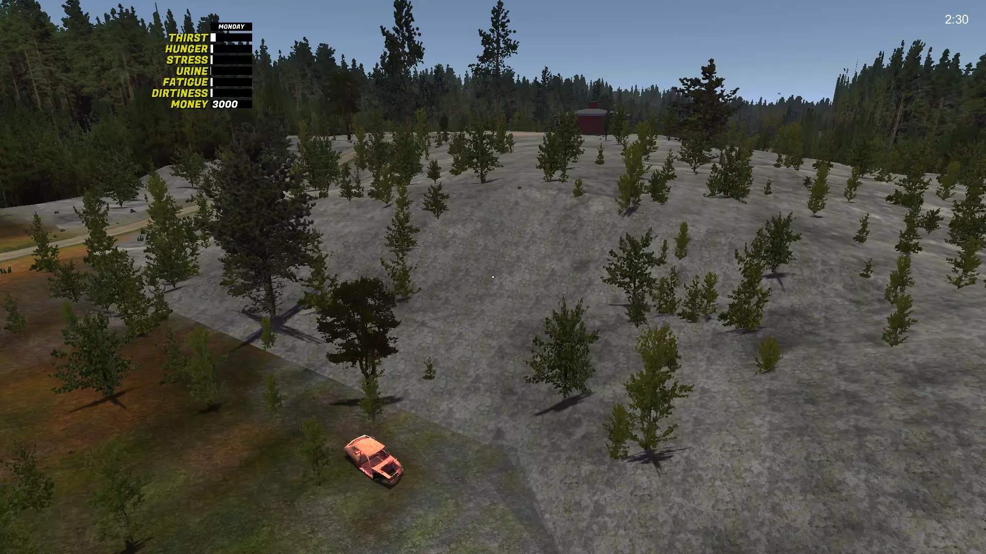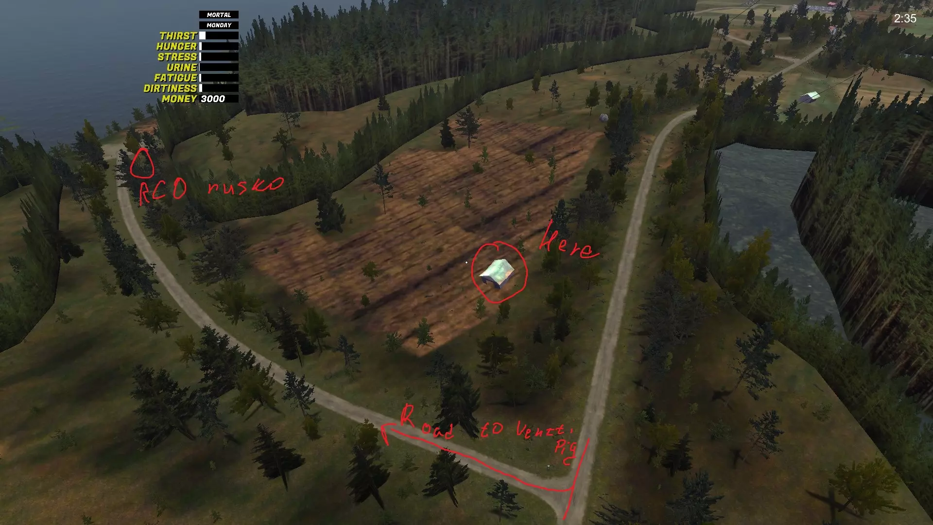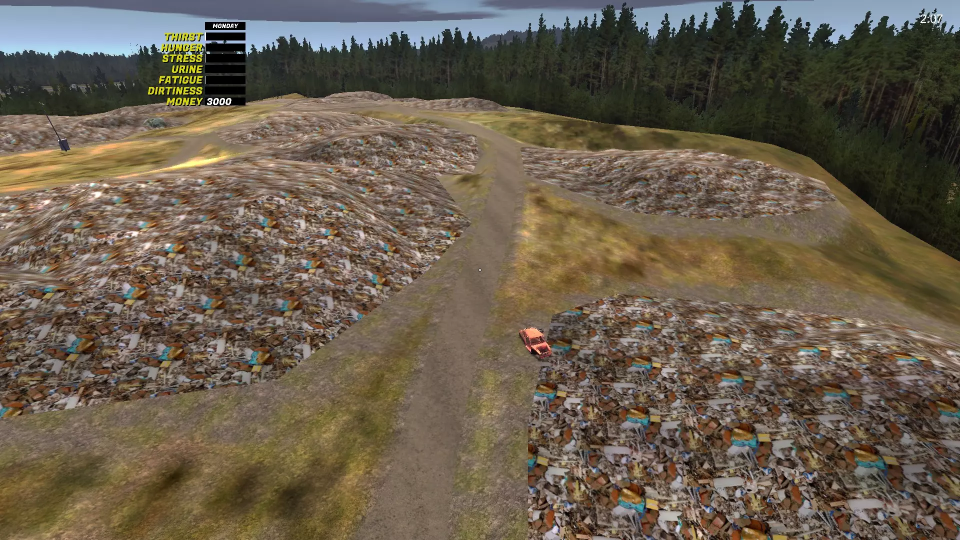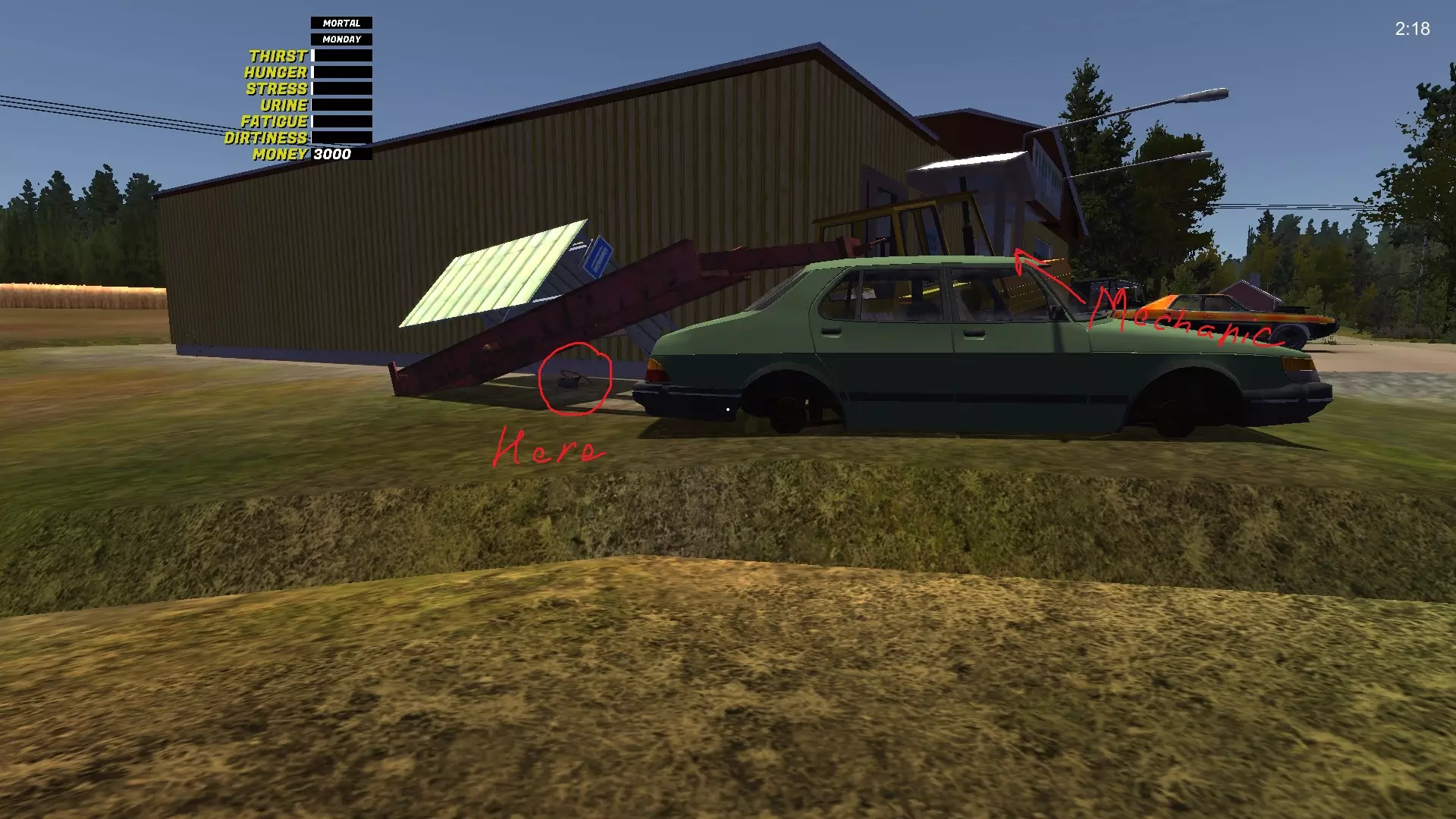 变速箱 变速箱是最难找到的GT零件。它位于生锈的萨博车附近,萨博车会刷新在8个不同的位置(我自己找到了8个位置,但可能还有更多),旁边还放着第五个备用轮胎。 变速箱-1 位于城市出口处,右侧,在沟渠里,树后面: