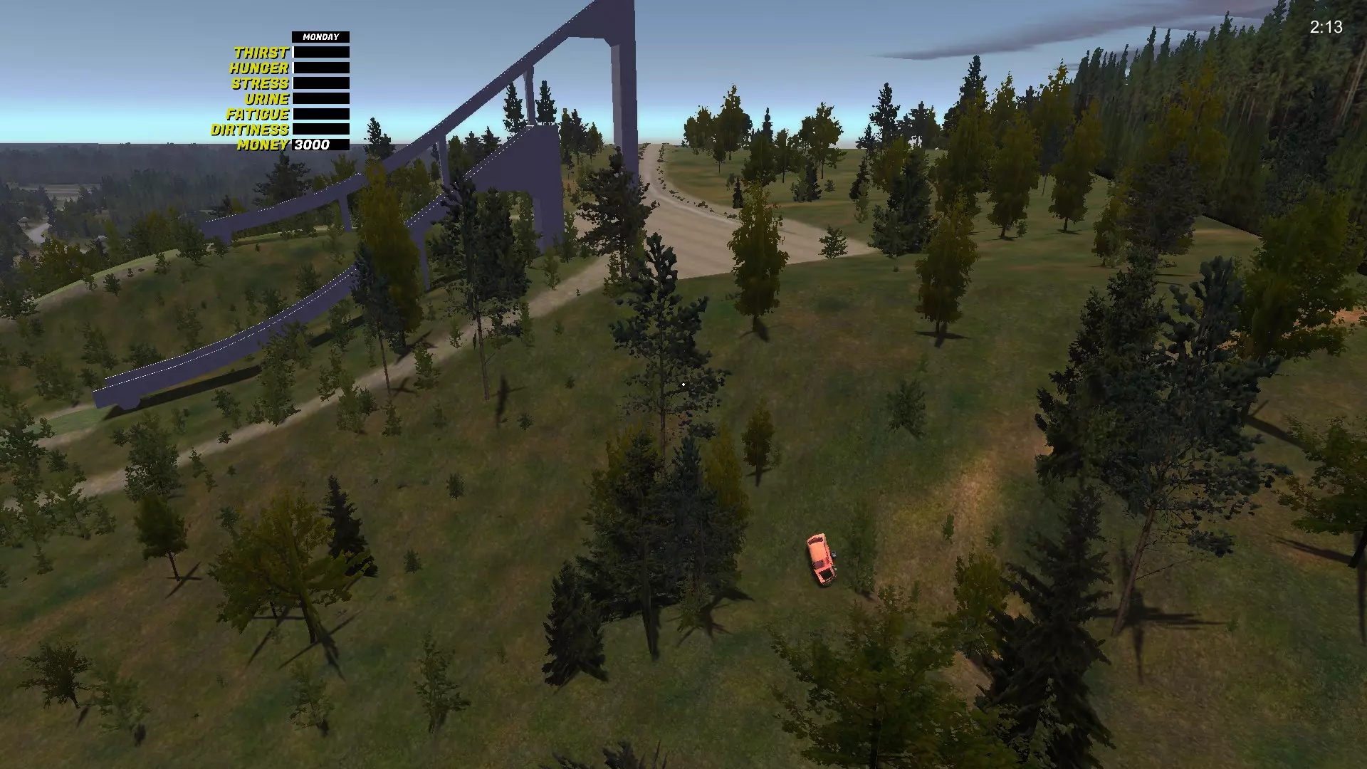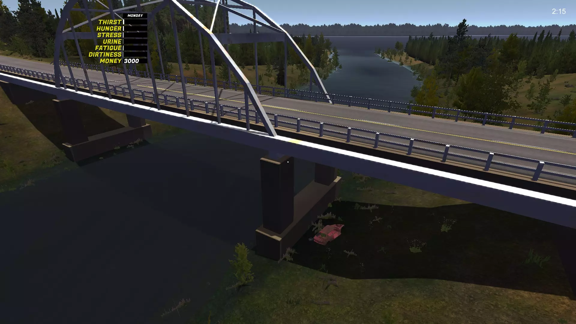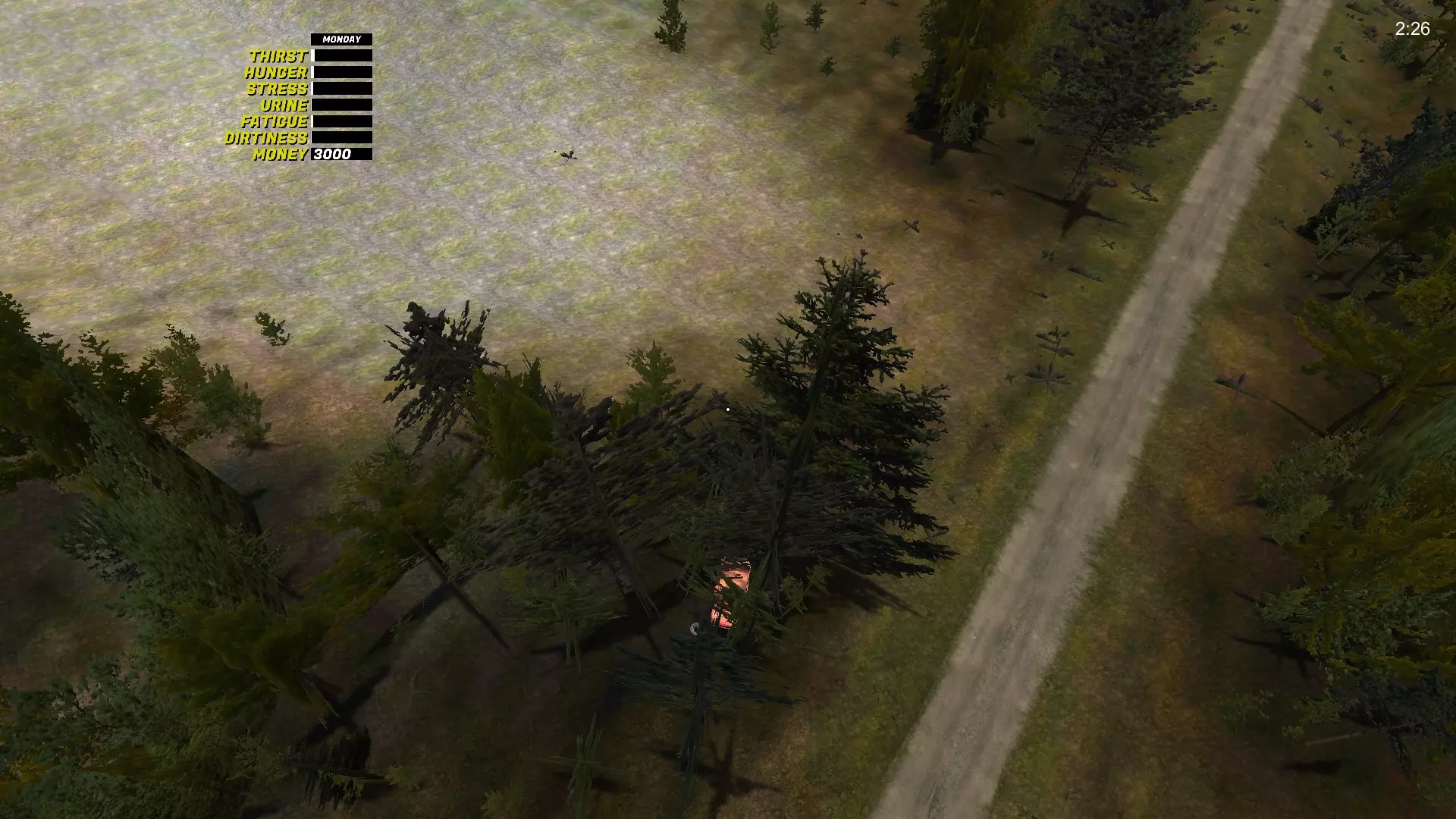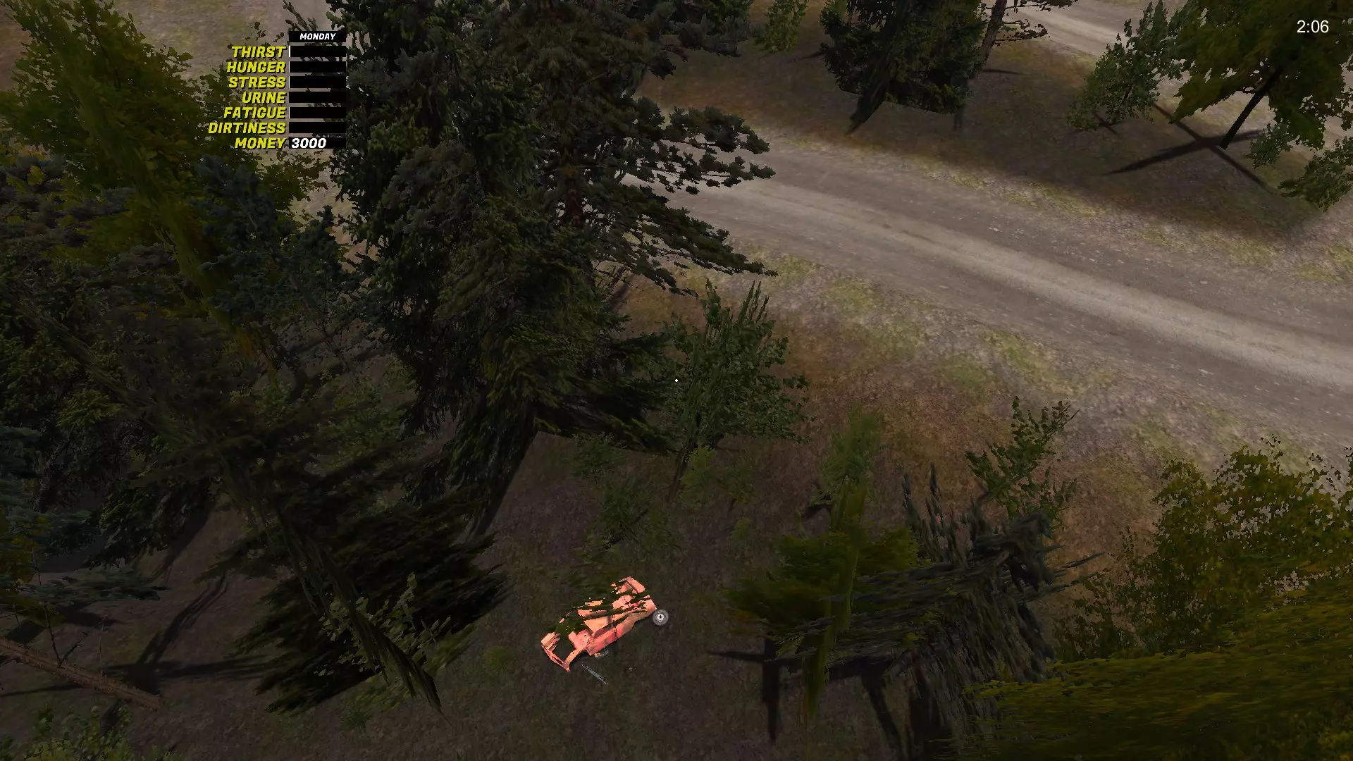 变速箱 变速箱是最难找到的GT零件。它位于生锈的萨博车附近,萨博车会刷新在8个不同的位置(我自己找到了8个位置,但可能还有更多),旁边还放着第五个备用轮胎。 变速箱-1 位于城市出口处,右侧,在沟渠里,树后面: