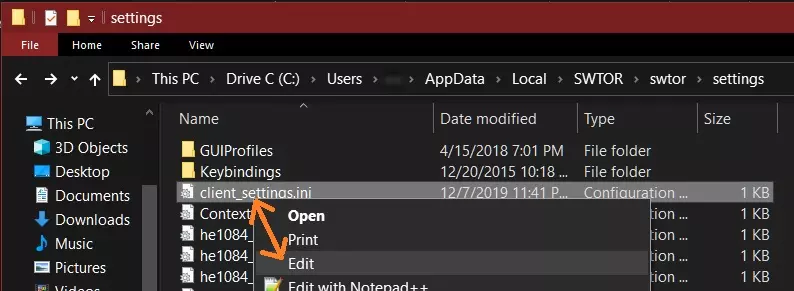 可选操作:若未来意外删除此文件,或因游戏卸载/重装导致文件丢失,建议对此文件进行备份,尤其是当你不希望在未来使用原生《星球大战:旧共和国》启动器时。 修复分辨率问题 尽管修复《星球大战:旧共和国》的最终用户许可协议(EULA)错误与分辨率问题无关,但通过《星球大战:旧共和国》启动器运行游戏有时可能会触发一个错误,导致支持高清及以上分辨率的显示器出现游戏显示尺寸异常的情况。 分步说明 1. 确保《星球大战:旧共和国》及游戏启动器均未运行。 2. 按住Windows键并按下R键,输入(或复制粘贴)以下内容: %localappdata% swtor swtor settings 3. 找到client_settings.ini文件,右键点击并选择编辑。
