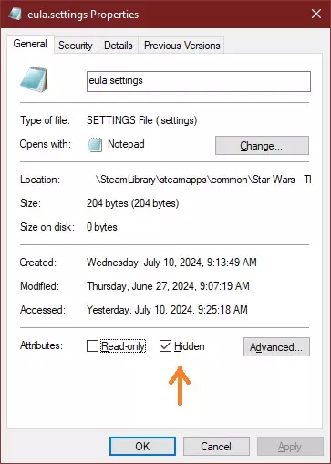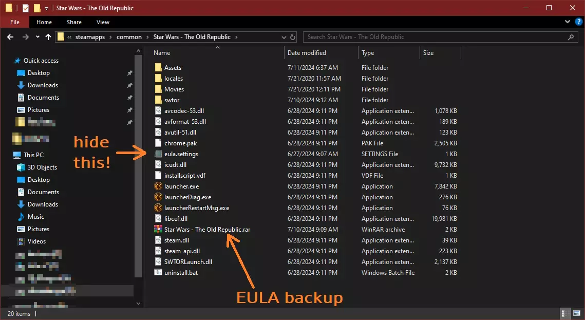 如果你在进行文件完整性检查后,或者刚在Steam上下载《星球大战:旧共和国》的全新副本时,遇到了烦人的最终用户许可协议(EULA)问题,这里有一个确保能防止该问题再次发生的修复方法。(现在包含修复分辨率问题的说明!) 简介 如果你曾陷入每次想在Steam中登录《星球大战:旧共和国》时,都要重复接受最终用户许可协议(EULA)的无限循环,那么本指南就是为你准备的。 和许多人一样,我是在Steam中运行文件完整性检查后遇到这个bug的。我向Steam技术支持提交工单后,得到的回复是Steam与其他开发者和发行商在其Steam商店上传的游戏及游戏文件无关,问题出在他们(开发者和发行商)那边。同时,我还被建议联系《星球大战:旧共和国》的开发商来解决这个问题。 在我研究这个问题以了解更多信息,并尝试看看能否自行修复时,发现这是一个影响Steam客户端中《星球大战:旧共和国》启动器的旧bug。这个特定bug涉及在登录过程中,用户账户专用的eula.settings文件无法创建或被删除,但这种情况仅发生在通过Steam扫描和修复游戏安装文件,或者通过Steam全新安装游戏时。遗憾的是,尽管有其他知名论坛和指南声称提供修复方法,但那都只是临时的解决办法。其中包括我最近在《星球大战:旧共和国》讨论区发布的一篇帖子,当时我以为找到了一个有效的解决方案,但经过进一步测试后发现,它并没有达到我预期的效果。 无论出于何种原因,每当在Steam中执行文件完整性检查时,eula.settings文件总会被删除……不过,经过更彻底的测试,我终于发现了一个简单的解决方案,可以防止这种情况在未来再次发生。本指南基于现有的已知解决方案,尝试在不增加任何文件删除风险的情况下解决该问题,直到游戏当前开发商Broadsword彻底修复此异常为止。 更新:截至2024年12月10日,7.6版本更新仍未创建eula.settings文件。目前测试表明,新安装的游戏仍需从《星球大战:旧共和国》独立启动器获取并创建eula.settings文件。 想要通过原生启动器玩《星球大战:旧共和国》(SWTOR),同时又想享受通过Steam运行游戏的优势?可以查看我的旧指南【如何让Steam界面与《星球大战:旧共和国》(SWTOR)配合使用】来了解方法! 永久恢复eula。设置文件 本文档假设所有遵循这些说明的用户均在Windows系统中运行Steam客户端,由于无法在Mac、Linux或其他兼容操作系统中进行测试,因此不确定此方法是否适用于这些系统。 分步说明 1. 直接从星球大战:旧共和国官方网站下载游戏客户端。 2. 通过该客户端安装并运行游戏。 3. 使用您的用户凭据登录并接受最终用户许可协议,游戏将开始下载。 4. 接受最终用户许可协议后,游戏根目录“Star Wars - The Old Republic”中会生成一个eula.settings文件。现在停止游戏下载。 5. 高亮并右键点击eula.settings文件,选择复制。 6. 打开Steam,在您的Steam库中右键点击星球大战:旧共和国,依次选择管理和浏览本地文件。这将打开Windows资源管理器,定位到Steam中《星球大战:旧共和国》的安装位置。 在Steam版《星球大战:旧共和国》的Windows资源管理器空白处右键点击,选择粘贴。 重要:右键点击刚刚粘贴到Steam版《星球大战:旧共和国》文件夹中的eula.settings文件副本,选择属性。 在文件属性窗口的常规选项卡下找到属性,勾选隐藏旁边的方框,然后点击应用和确定关闭窗口。这将防止Steam在运行文件完整性检查时删除该文件。