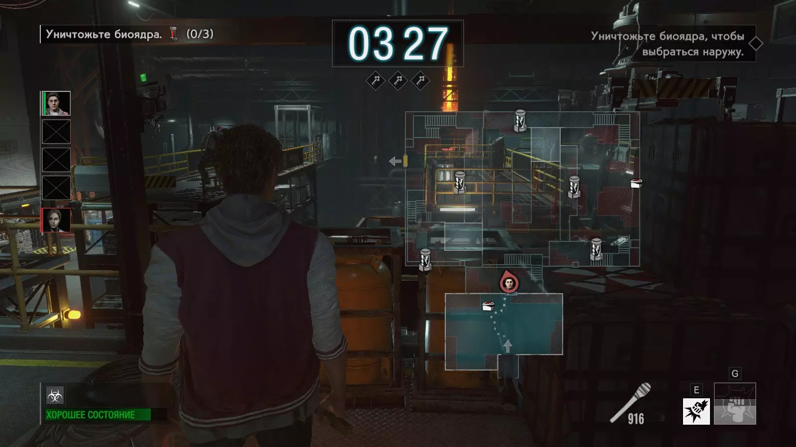 第三个区域需要破坏三个生物核心,地图上会直接标记出所有生物核心,但其中只有一个处于激活状态。可以从远处识别激活的生物核心,其上方会有一道橙色光柱。查看地图,向生物核心的方向远眺,看到光柱后就前往破坏。不需要靠近每个目标,这样会花费大量时间——所有东西都可以从远处看到,也可以在观察时将其标记在地图上(类似于标记终端的方式),不过无法透过窗户进行标记。破坏它相当困难,最简单的方法是使用近战武器,首选是大锤;如果使用 firearms,只有在你有大量弹药的情况下才建议这么做。摧毁三个生物核心后,需要按下大门上的拉杆来打开出口。有些幸存者不知道这一点,只是在大门旁等待(这样永远也等不到)。按下拉杆一分钟后,大门就会开启——记住不要傻乎乎地立刻出去。这里有个小技巧:你可以站在大门内侧,在那里射击怪物,帮助队友突围,因为大多数敌人无法攻击到大门内的你。在大门处可能会遇到以下威胁:伯金(Birkin)的长距离攻击、亚捷耶沃(Yateevo)、增强型地雷、僵尸引爆者、榴弹发射器,如果有直线视野的话还有机枪。在大门内无法手动扶起倒地的幸存者,但可以使用喷雾和瓦列里(Valeri)的终极技能。