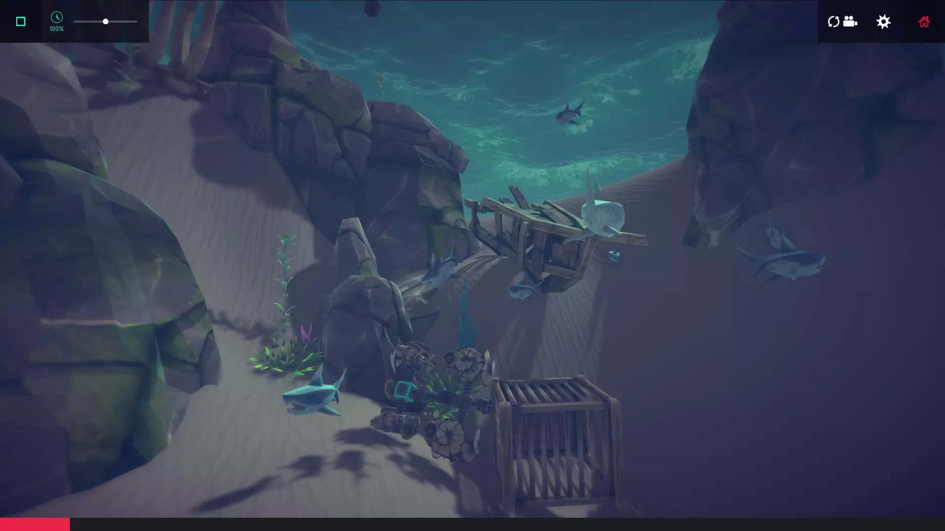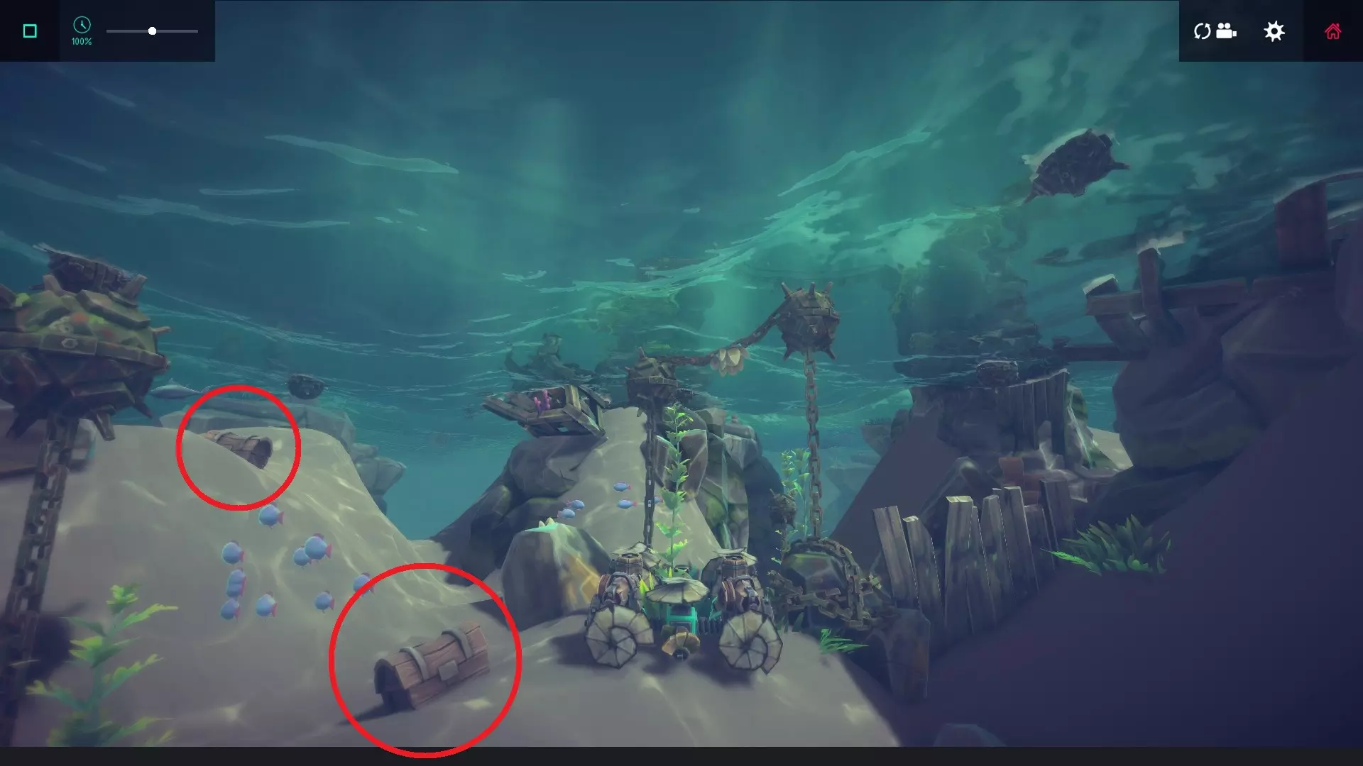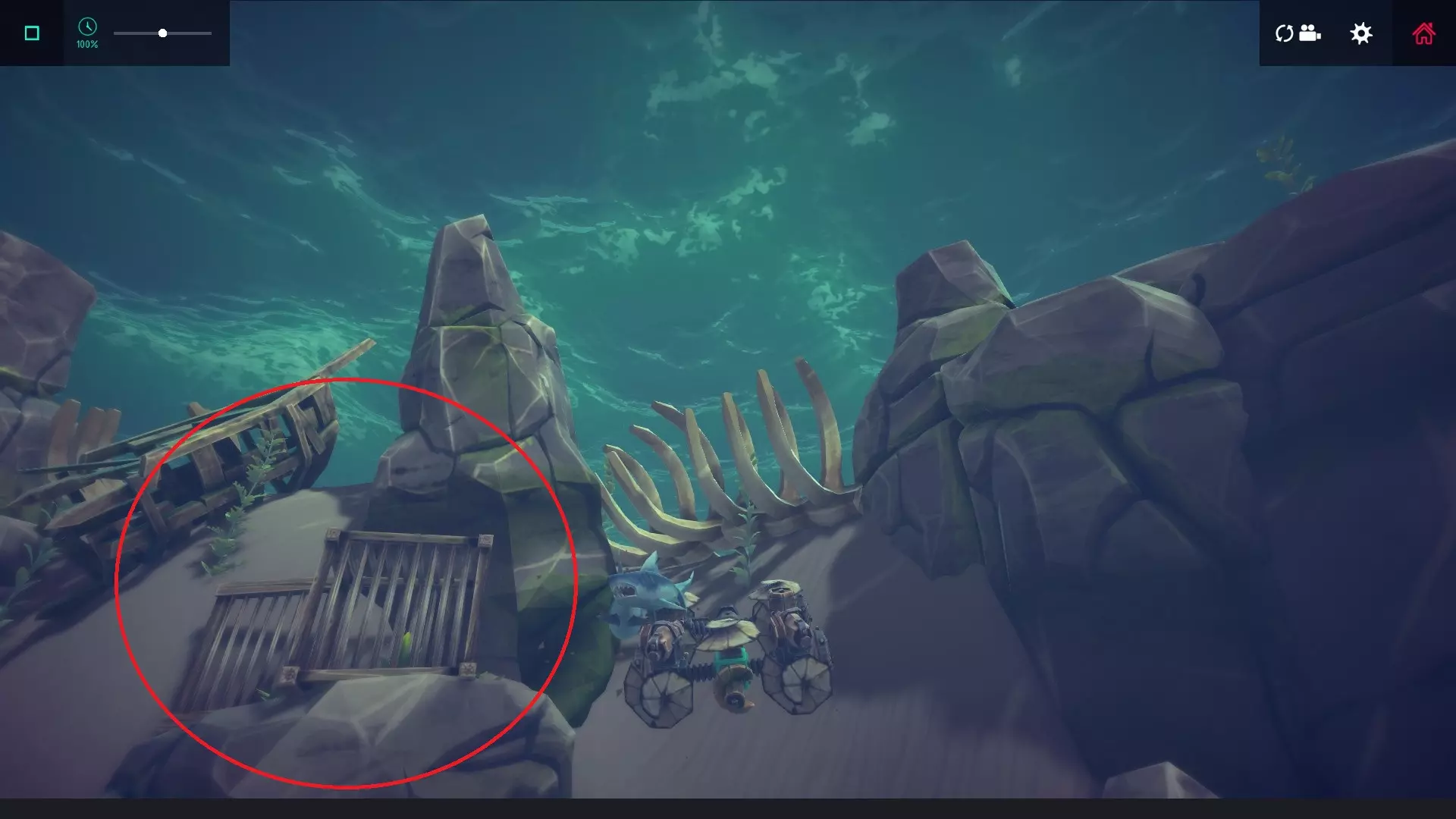 建议:建造一艘前端带有抓取器的灵活潜水器,然后去收集关卡后方的笼子。