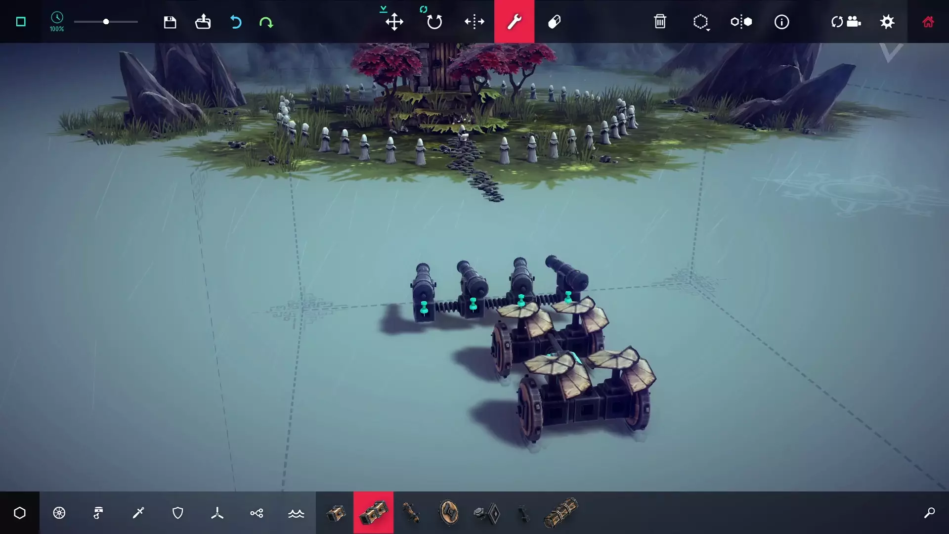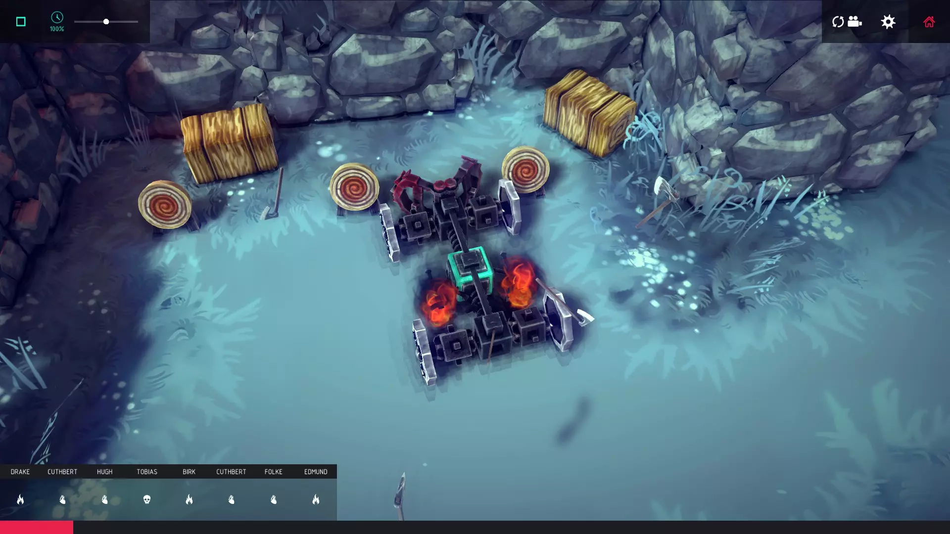 建议:俗话说,条条大路通罗马。一个简单的方法是在轮式车辆顶部搭建一个“分叉”的支架,使其与三个铃铛对齐,然后驾车撞向它们。也有人用抓取器在每个铃铛上连接绞盘,然后拉动铃铛。或者你可以建造一个巨大的飞艇炸弹! 3/5 – Through and Through 区域41 - 山地屏障 如何完成:不使用爆炸物完成此关卡。 建议:推土机!Kool Aid Man可要羡慕了。如果你想建造一个不使用轮子的东西,记得我关于转向轴的提示吗?或者用装甲保护轮子,建造一个类似坦克的东西来撞穿它。关卡右侧的小型堡垒易受炮火攻击,也可通过使其坍塌到墙上的方式来完成关卡。 4/5 – Cold as Ice 区域42 - 遗迹寒霜 方法:在本关卡中从冰里打破碎片,然后收集它。 建议:移动遗迹后,碎片位于遗迹之前所在的其中一块冰晶里。 5/5 – Target Practice 区域45 - 忏悔之塔 方法:让掷斧手击中其中一个假人目标。