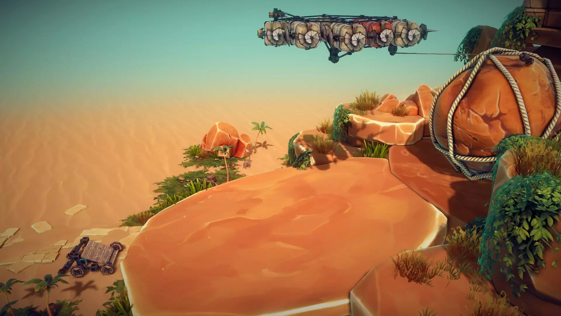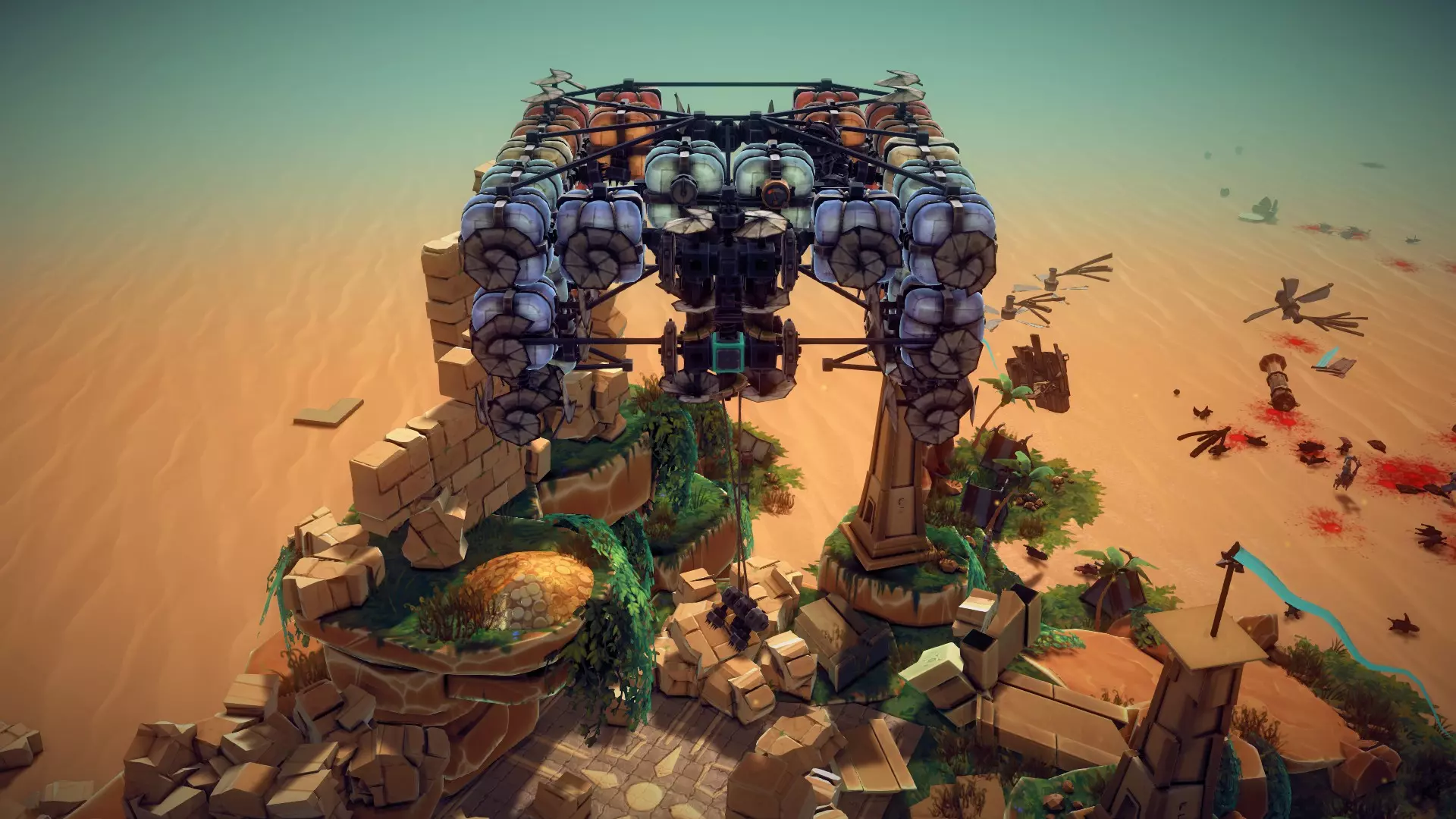 但是,这部分操作难度较大:碎片必须从这里的格栅坑中被甩出去,除非你足够快,能在它掉进格栅缝隙之前收集到碎片,并且避开触手。如果碎片落在坑边的沙地上,收集起来就容易多了。我的飞艇底部装有摄像头,这能帮我追踪贝壳打开后碎片的去向。物理效果随机性十足!祝你玩得开心。