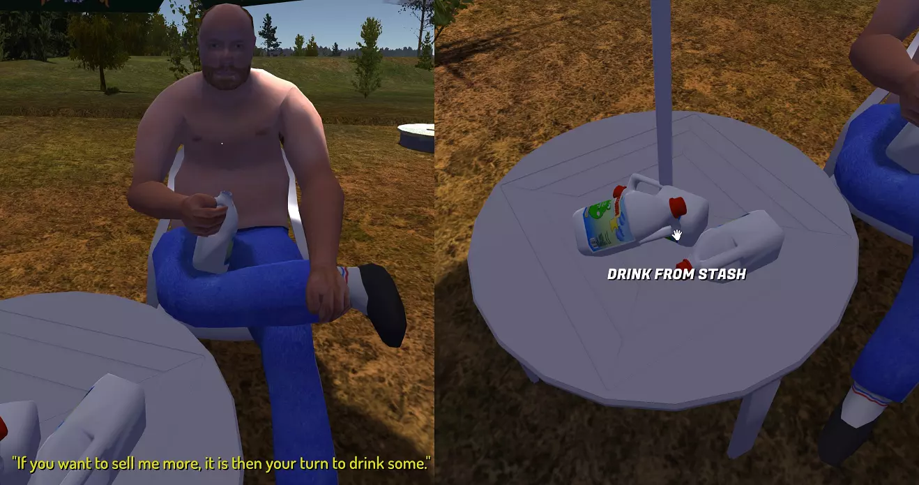 当你到达他家后,需要把所有要卖的基尔朱酒瓶放在桌子上。在最近几次更新后,约基现在会在你堆放更多待售酒水时,让你陪他一起喝。这就带来了一个问题:如果基尔朱酿造得当以实现价值最大化,它会是一种相当烈的酒。希望你擅长酒后驾驶,否则你就得步行或等堂兄佩纳来接你了。