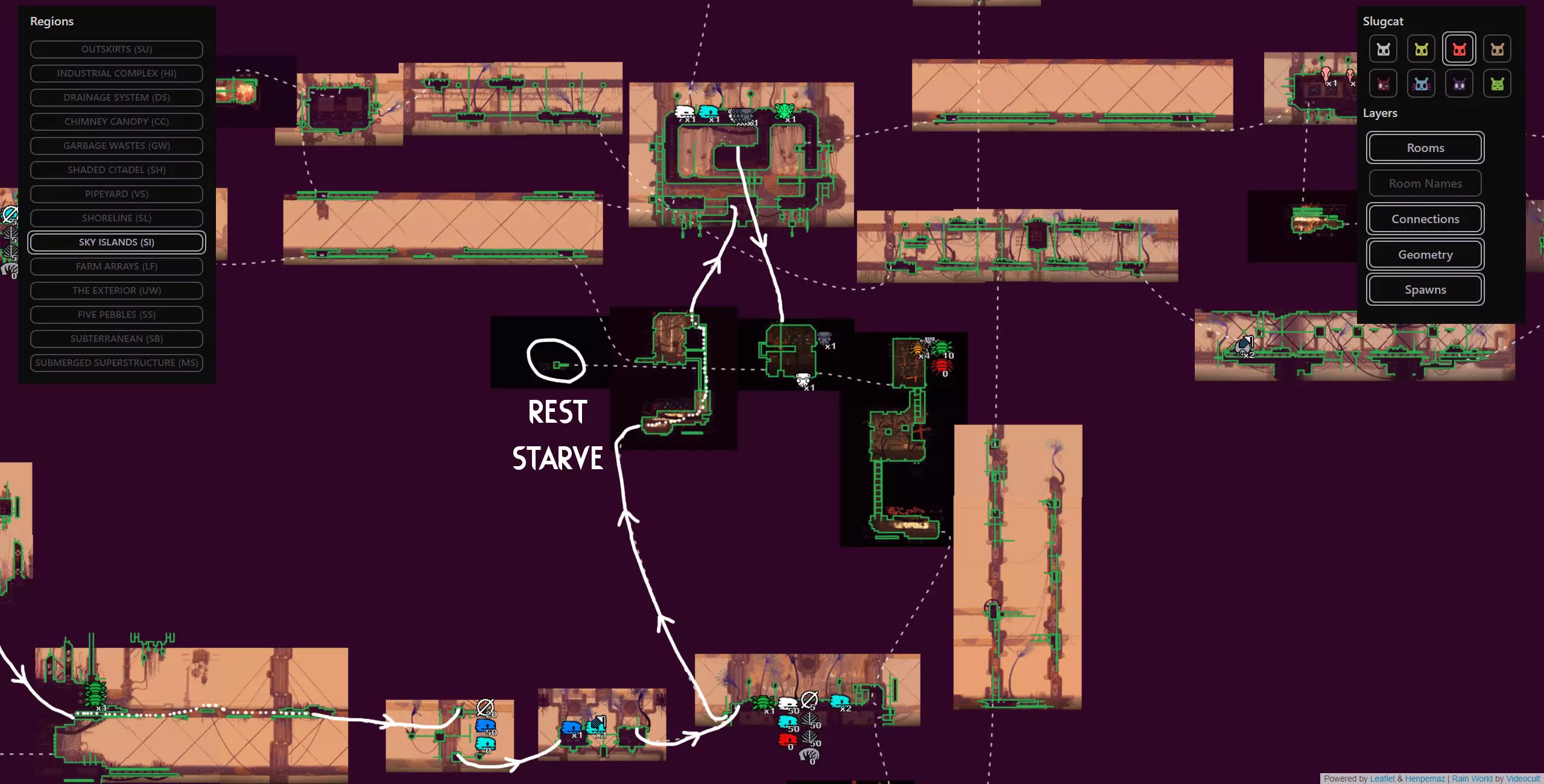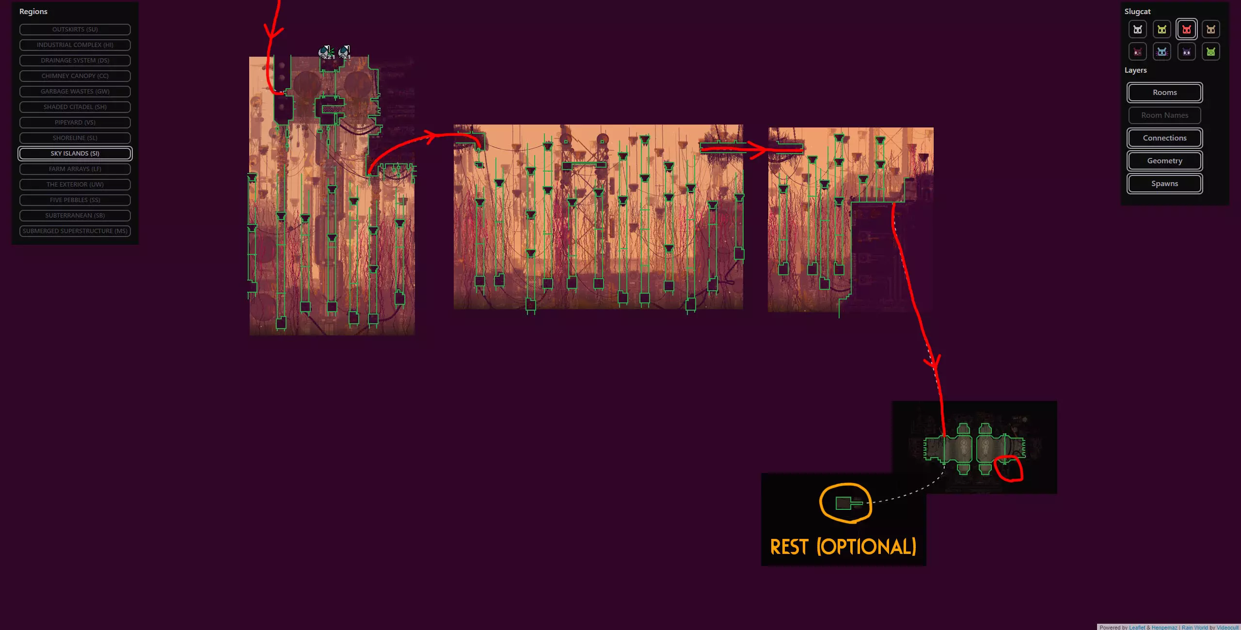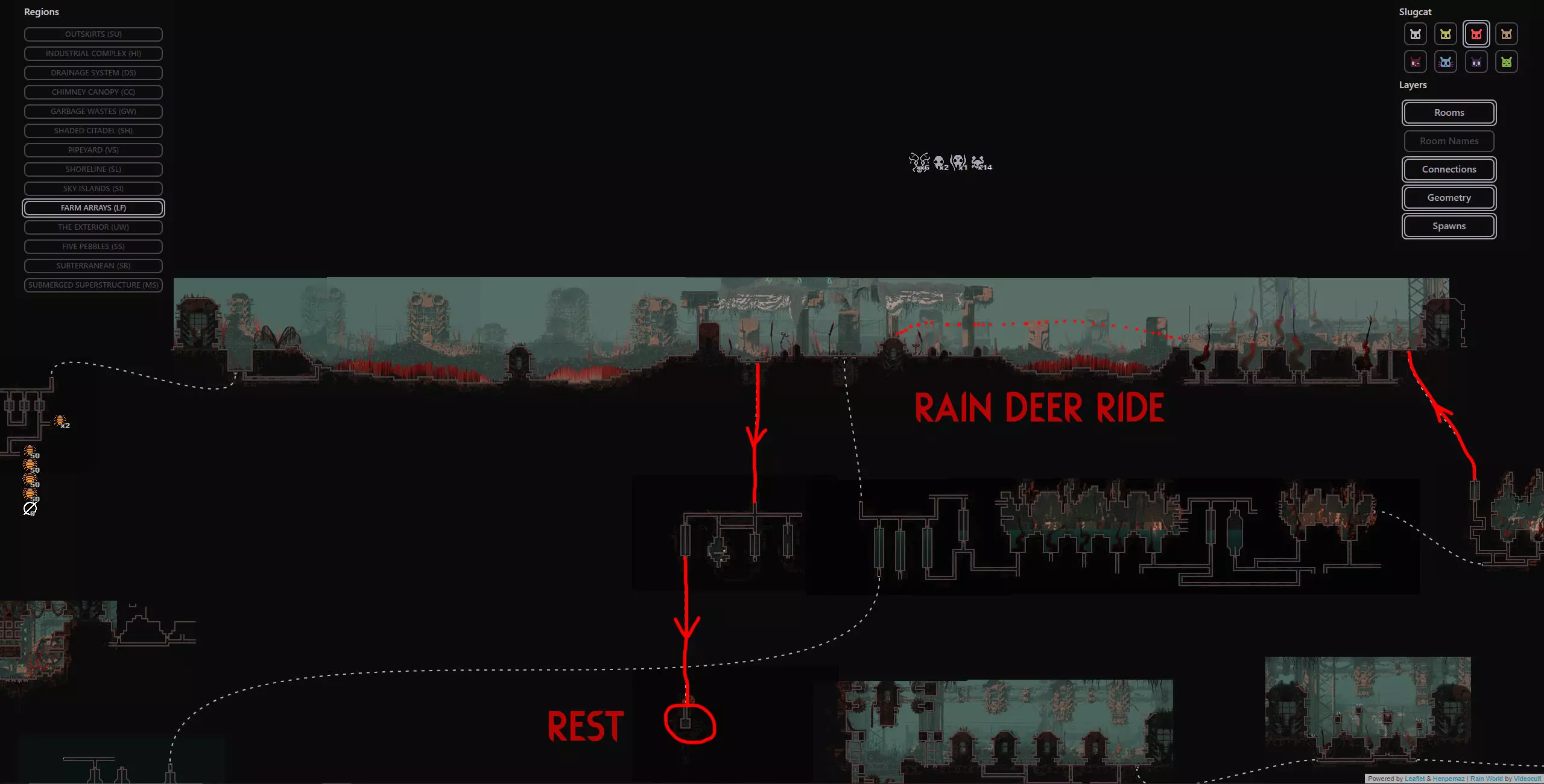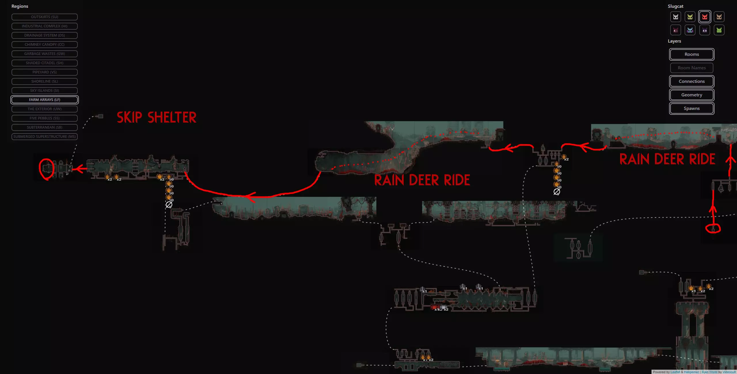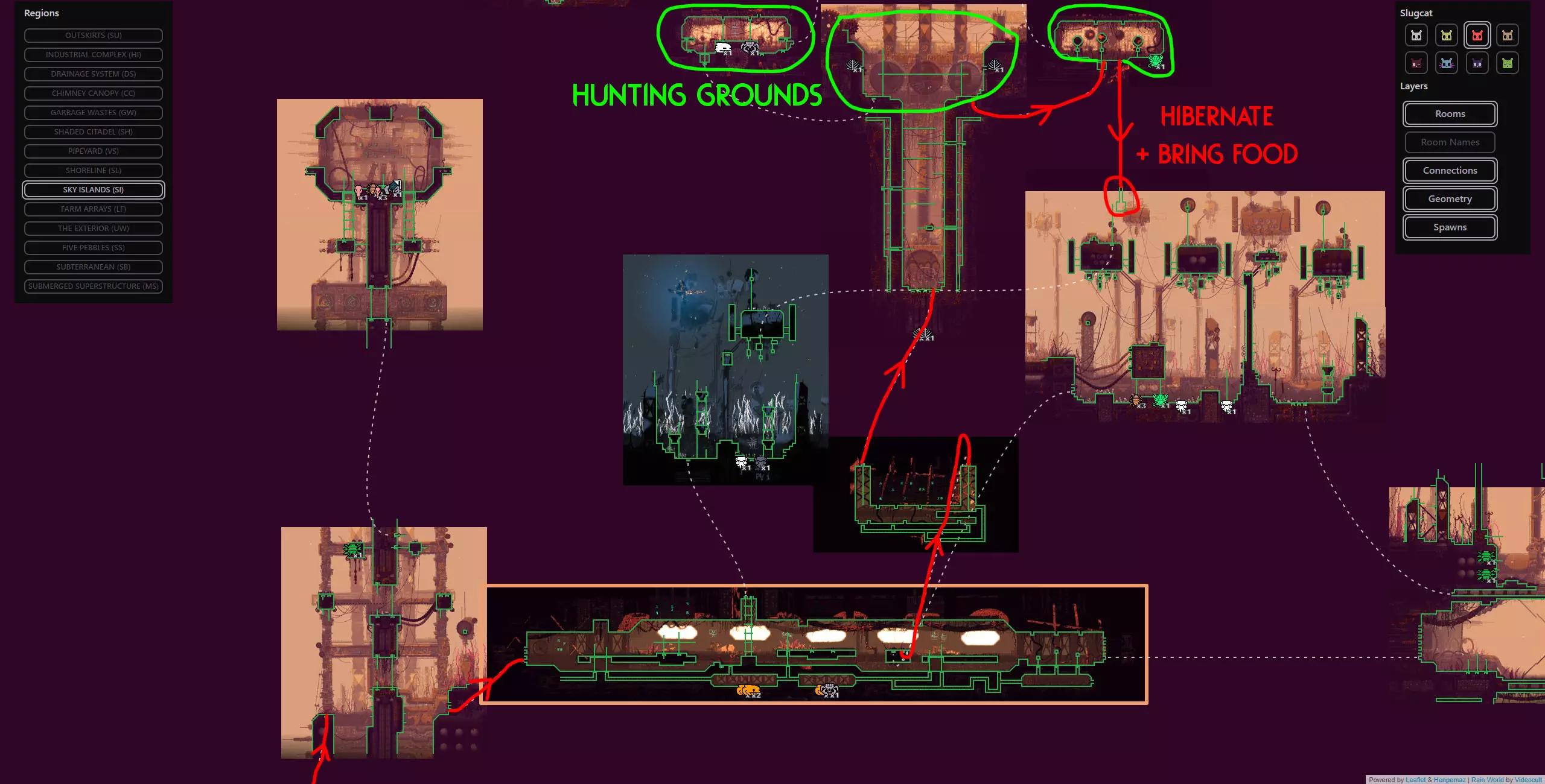 避难所失效是某些蛞蝓猫战役中可能发生的极为罕见的随机事件,此时蛞蝓猫在避难所醒来会发现里面被水淹没。该周期开始的前几分钟会有剧烈的脉动降雨,蛞蝓猫将被迫在该周期内到其他地方冬眠。这可能非常麻烦,因为它会导致该周期内无法挨饿,这会让情况变得更加困难,尤其是在游戏流程的早期阶段。在不使用模组的情况下,我们能做的最好的事情就是随机应变。 简单来说:避难所有一定几率被淹没并迫使你离开,这将导致该周期内无法挨饿。这是一个极为罕见的事件,如果发生了,你只能去适应。欢迎来到雨世界!宝贵资源 以下是你旅途中的宝贵资产,也是所有技能水平玩家的实用工具。必要时可参考它们。 雨世界维基 雨世界交互式地图 Maxi Mol制作的可控制雨鹿模组 概述 我们从农场阵列开始,在这里快速放下绿色神经元飞虫和珍珠,然后向东走,再向上进入天空群岛。我们会前往天空群岛的回响处,之后前往烟囱林冠,再穿过墙壁区域,同时利用回响的存在来确保安全,无需与它们互动。进入墙之前,我们要杀死一只秃鹫并拿走它的面具(如果按照攻略中的方法来做会很简单)。然后我们爬上墙,去顶部查看回响,之后会被直接送回底部。通常爬墙是个噩梦,但戴上秃鹫面具后就变得轻而易举了。 注意:由于我们会到达墙顶,你可以选择偏离我的计划去拜访卵石,它会像回响一样提升你的业力,并额外给予5个周期,但这完全没有必要,因为我们需要的所有东西都在返回的路上,而且无论如何我们都需要回溯。 然后我们原路返回农场阵列,途中顺便去查看烟囱回响。我们一路返回到起点,在那里乘坐短程雨鹿向西前往地下大门,在那里我们将遇到第四个也是最后一个回响。 此时,这次流程基本上已经稳操胜券。如果你按照指南操作,应该能轻松在还剩大约7个周期时到达地下区域。拥有4个或更多周期意味着你可以在前往深渊的路上在每个避难所休息,完全不用担心。死亡没有任何后果,因为你不再需要高业力等级,所以理论上即使在周期1,只要跳过所有避难所,你仍然可以一路到达游戏终点。这听起来可能有些复杂,但我已将整个旅程分解为更易于理解的小阶段,每个阶段都配有视觉辅助、文字说明和带字幕的视频指南。 简单来说:我们完全跳过猎人的任务,前往4个回响之地(天空群岛、高墙、烟囱 canopy、地下区域)以达到最大业力并飞升。我已将整个旅程分为多个小阶段,每个阶段都有专门的指南和视频。详情如下: 阶段1(起点 > 天空群岛回响) 农场阵列