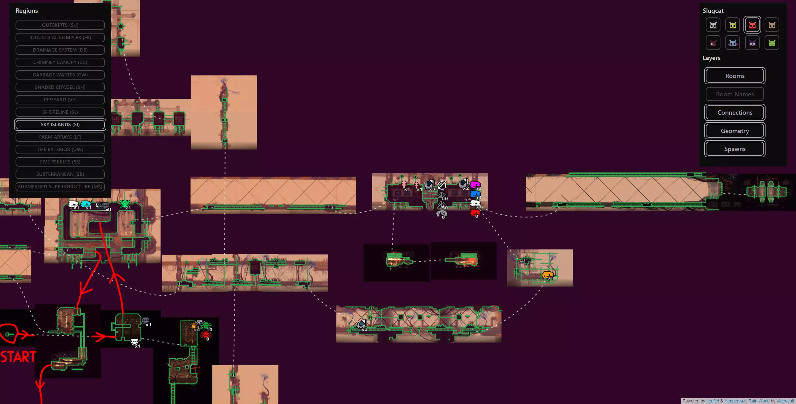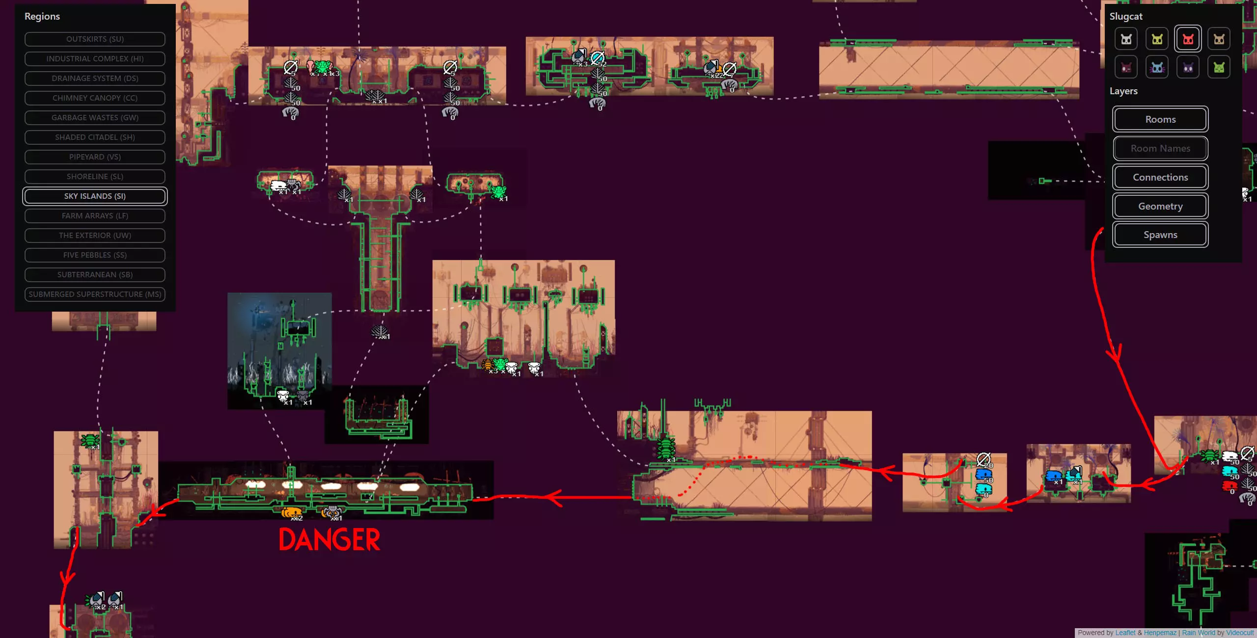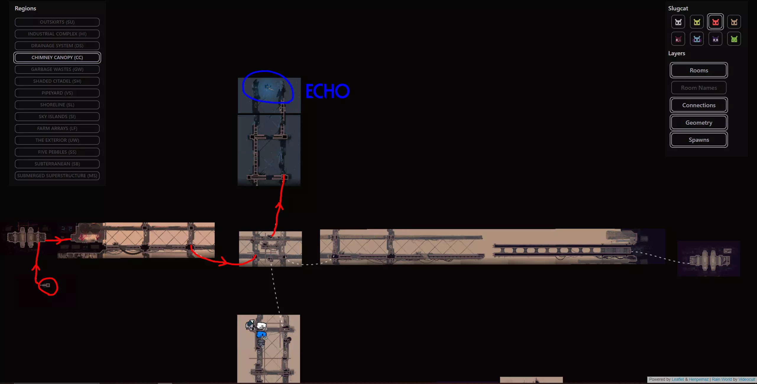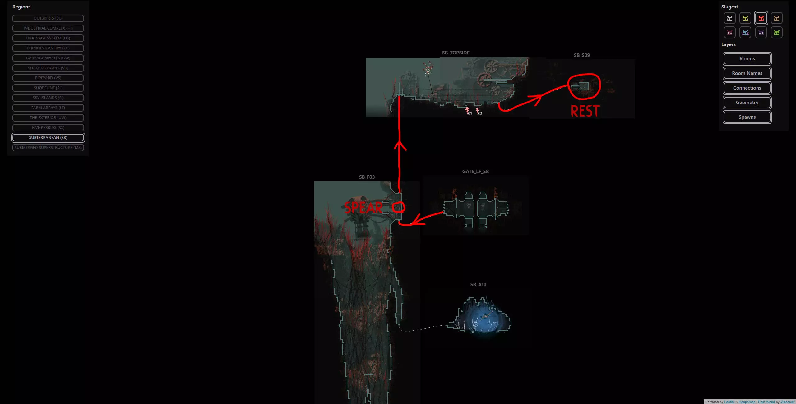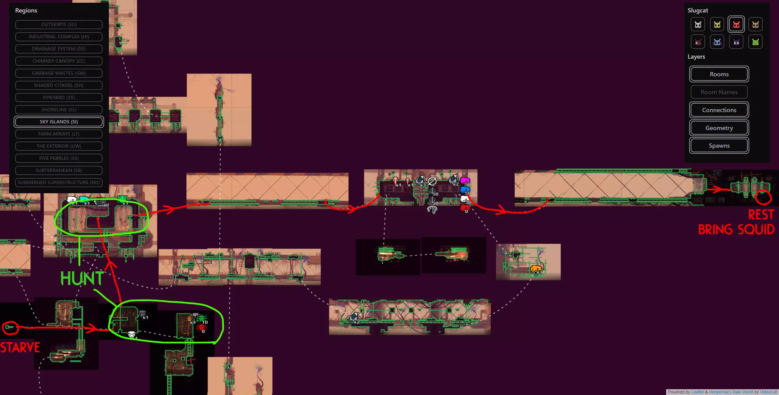 避难所失效是某些蛞蝓猫战役中可能发生的极为罕见的随机事件,此时蛞蝓猫在避难所醒来会发现里面被水淹没。该周期开始的前几分钟会有剧烈的脉动降雨,蛞蝓猫将被迫在该周期内到其他地方冬眠。这可能非常麻烦,因为它会导致该周期内无法挨饿,这会让情况变得更加困难,尤其是在游戏流程的早期阶段。在不使用模组的情况下,我们能做的最好的事情就是随机应变。 简单来说:避难所有一定几率被淹没并迫使你离开,这将导致该周期内无法挨饿。这是一个极为罕见的事件,如果发生了,你只能去适应。欢迎来到雨世界!宝贵资源 以下是你旅途中的宝贵资产,也是所有技能水平玩家的实用工具。必要时可参考它们。 雨世界维基 雨世界交互式地图 Maxi Mol制作的可控制雨鹿模组 概述 我们从农场阵列开始,在这里快速放下绿色神经元飞虫和珍珠,然后向东走,再向上进入天空群岛。我们会前往天空群岛的回响处,之后前往烟囱林冠,再穿过墙壁区域,同时利用回响的存在来确保安全,无需与它们互动。进入墙之前,我们要杀死一只秃鹫并拿走它的面具(如果按照攻略中的方法来做会很简单)。然后我们爬上墙,去顶部查看回响,之后会被直接送回底部。通常爬墙是个噩梦,但戴上秃鹫面具后就变得轻而易举了。 注意:由于我们会到达墙顶,你可以选择偏离我的计划去拜访卵石,它会像回响一样提升你的业力,并额外给予5个周期,但这完全没有必要,因为我们需要的所有东西都在返回的路上,而且无论如何我们都需要回溯。 然后我们原路返回农场阵列,途中顺便去查看烟囱回响。我们一路返回到起点,在那里乘坐短程雨鹿向西前往地下大门,在那里我们将遇到第四个也是最后一个回响。 此时,这次流程基本上已经稳操胜券。如果你按照指南操作,应该能轻松在还剩大约7个周期时到达地下区域。拥有4个或更多周期意味着你可以在前往深渊的路上在每个避难所休息,完全不用担心。死亡没有任何后果,因为你不再需要高业力等级,所以理论上即使在周期1,只要跳过所有避难所,你仍然可以一路到达游戏终点。这听起来可能有些复杂,但我已将整个旅程分解为更易于理解的小阶段,每个阶段都配有视觉辅助、文字说明和带字幕的视频指南。 简单来说:我们完全跳过猎人的任务,前往4个回响之地(天空群岛、高墙、烟囱 canopy、地下区域)以达到最大业力并飞升。我已将整个旅程分为多个小阶段,每个阶段都有专门的指南和视频。详情如下: 阶段1(起点 > 天空群岛回响) 农场阵列