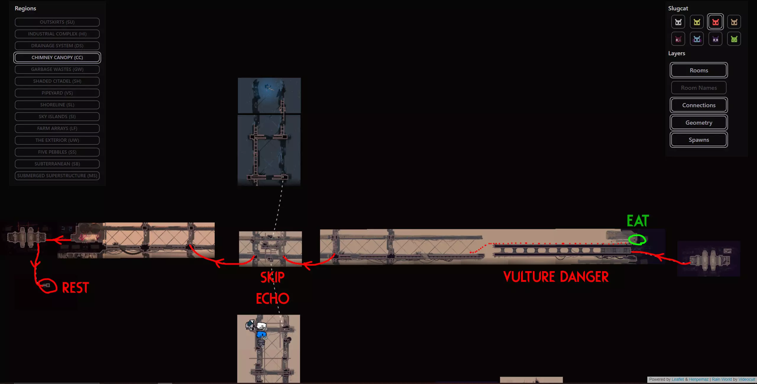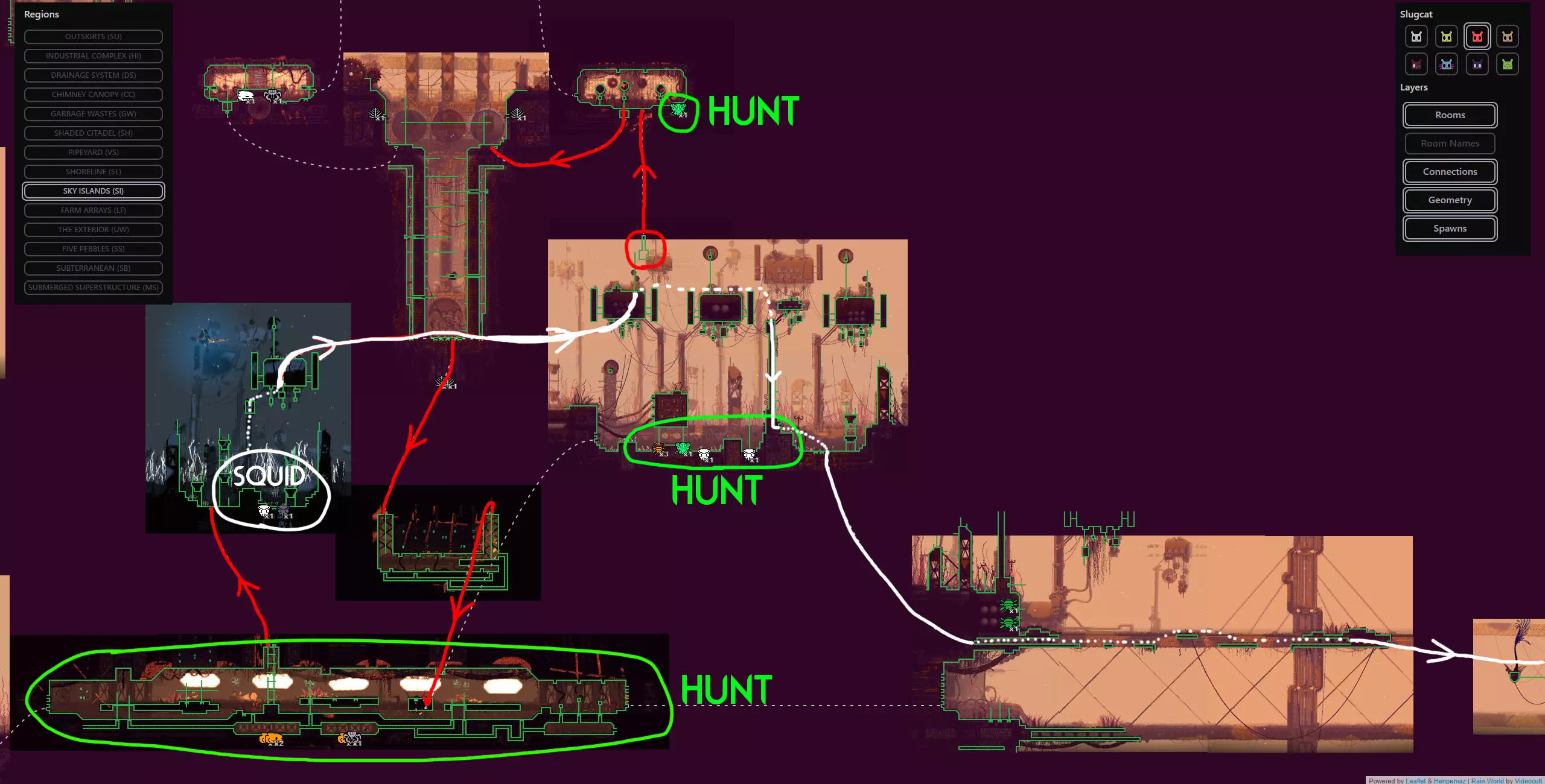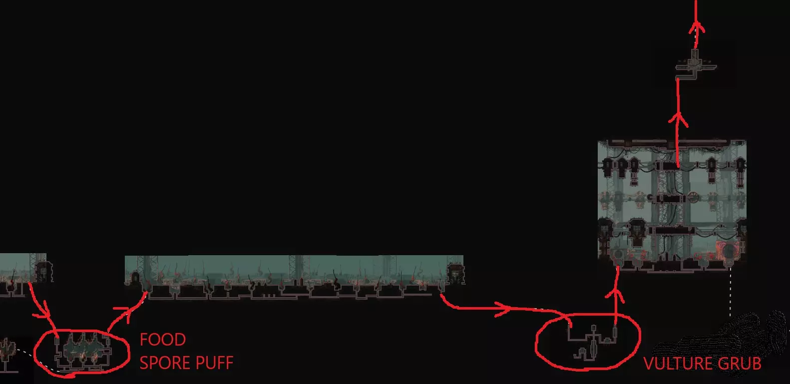 As you wake up you will need another 9 food pips, but luckily you’re in squidcada heaven. You can hunt squidcadas and eat baby centiwings near the shelter and in the adjacent screens relatively safely. Once you are full, grab a new squidcada and continue to the east towards the Chimney Canopy karma gate. The trip from this shelter to the Chimney gate is a fairly safe and peaceful one so I don’t really have much advice for it. Refer to the map/video for directions. As soon as you make it past the karma gate into Chimney Canopy with your squidcada buddy, take him with you into the shelter and hibernate. Segment #2 Video Walkthrough (with text commentary): Congratulations, That's by far the hardest segment of the whole run and it's now behind you. Segment #3 (Chimney Canopy > The Wall) We wake up with our squidcada buddy at the shelter next to the Chimney Canopy gate, feel free to use him as food at this point. If you’ve been properly using the starvation mechanic to keep your karma intact, you should be at maximum karma. You need karma level 6 or 7 for the Chimney echo to be active. NOTE: Whenever you are at maximum karma, you can afford to take the risk of NOT starving. Since you’re already at max karma, starving does not increase your karma and is therefore pointless. Make one non-starved attempt. If you fail, that will decrease your karma by 1 and then you will have to starve to proceed safely beyond that. This cycle is relatively safe, and a good time to give ONE non-starved attempt if you wake up at maximum karma. Now it is crucial that you are at the correct karma level for this cycle as we need the echo in this area to be active. We will finally be using that Vulture Grub that we collected back in Farm Arrays near the start. Now tossing a live Vulture Grub on the ground will cause it to send a signal laser to the sky. In rooms with an open sky, this will summon a Vulture. Now as I have mentioned before, any creature that enters a zone with an active echo will immediately fall asleep. This means that we can use the Vulture Grub to summon a Vulture (or preferably a King Vulture) and they will plummet from the sky unconscious, at which point we can just spear it to death, eat it and take its' mask for free. Eating it will provide 9 food pips and a simple spear to the face after it dies will drop the mask. The mask causes most Lizard type enemies to flee in terror from us temporarily, which will make the upcoming segments much much easier. IMPORTANT NOTE: This guide did not used to include this easy Vulture Grub strategy and instead had a detailed strategy on how to bait a Vulture into the roofed bridge near the Wall karma gate and ambush it there where it cannot fly away. I have since removed the detailed text explanation on Vulture combat and shortened this segment. However, you can still find the "NO VULTURE GRUB" video for this segment below just in case you forgot or were unable to bring one with you. Segment #3 Video Walkthrough (with text commentary): NO VULTURE GRUB STRATEGY: Once you have your mask and have had your victory meal, proceed past The Wall karma gate and rest at the shelter just outside of it. Congratulations, the mask you got will come in handy moving forward Segment #4 (The Wall Echo) Now, you may have thought I was crazy in the overview when I said that we will be climbing the wall and visiting The Wall echo as it is quite the daunting task on paper. The Wall is filled to the brim with cyan lizards and white lizards and is one of the most dangerous areas in the game due to this reason coupled with the limited space to evade them. Now what if I told you, that we’re skipping the shelter up the wall and climbing the whole thing in one cycle? Wait! Wait! Don’t leave yet, I can explain! Yes, The Wall is a dangerous area, but I have multiple reasons to bring you here during your Hunter run. 1.Thanks to our brand new Vulture mask, 90% of all the Wall’s inhabitants are now afraid of us. This makes the climb far easier. 2.The Wall echo is one of only 2 echoes in the game that do not have a karma requirement. This means that you do not need to starve or worry about dying or karma at all, the echo will always be there. 3.You can die as many times as you need to and you can just restart and try again with no consequences to the overall run and visiting the echo at the top will give you the karma boost, max out your karma, and then you will wake up all the way at the bottom ready to leave as if the cycle never happened. IMPORTANT NOTE: If you hung onto the green neuron from the beginning, it is possible to deviate from my plan here and visit pebbles from the top of the wall. He will boost your karma like an echo would and give you 5 additional cycles. This is completely unnecessary but it’s an option nonetheless. If anything, this can serve as practice if you ever plan on doing an All Objectives Hunter run.