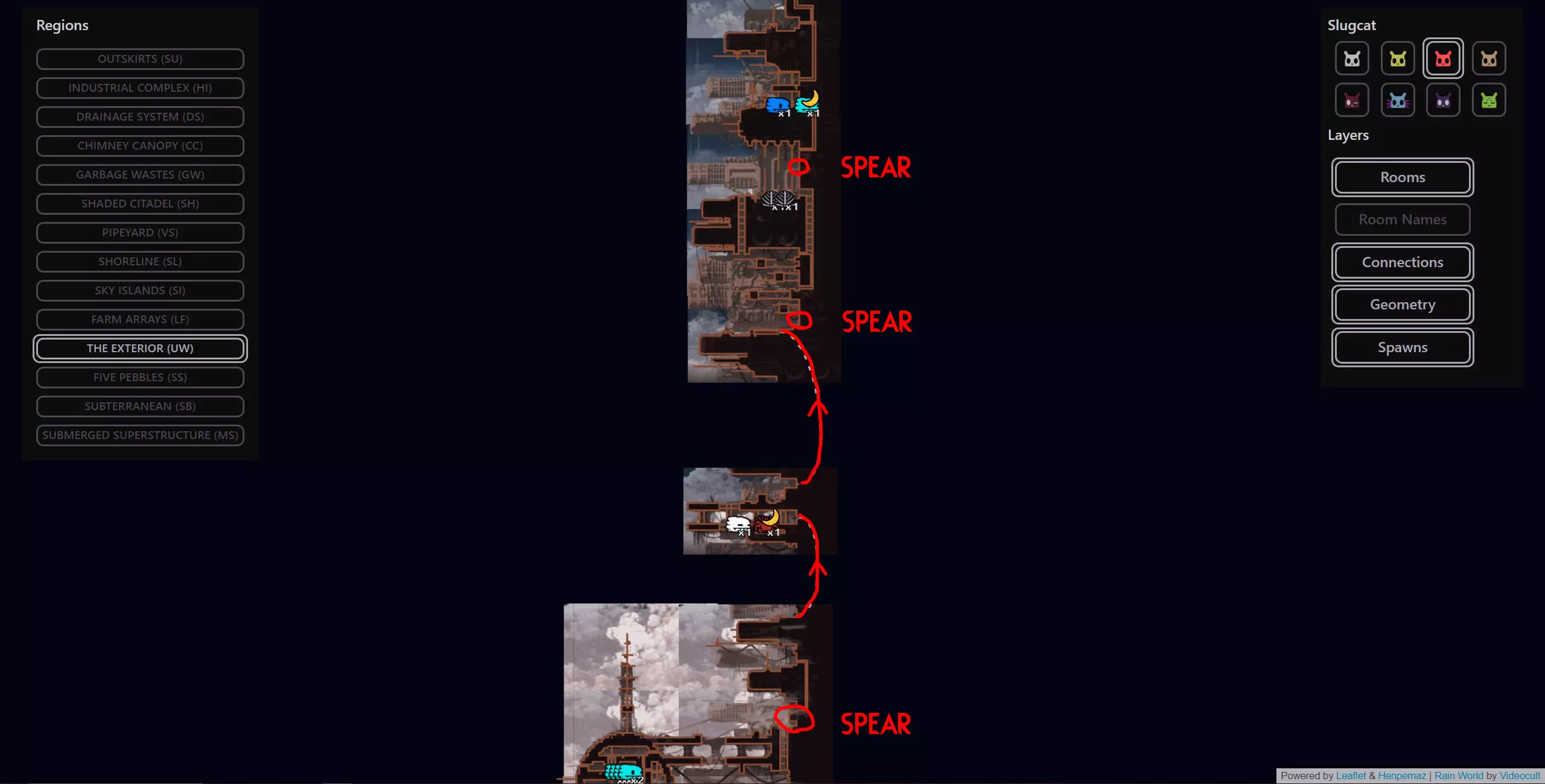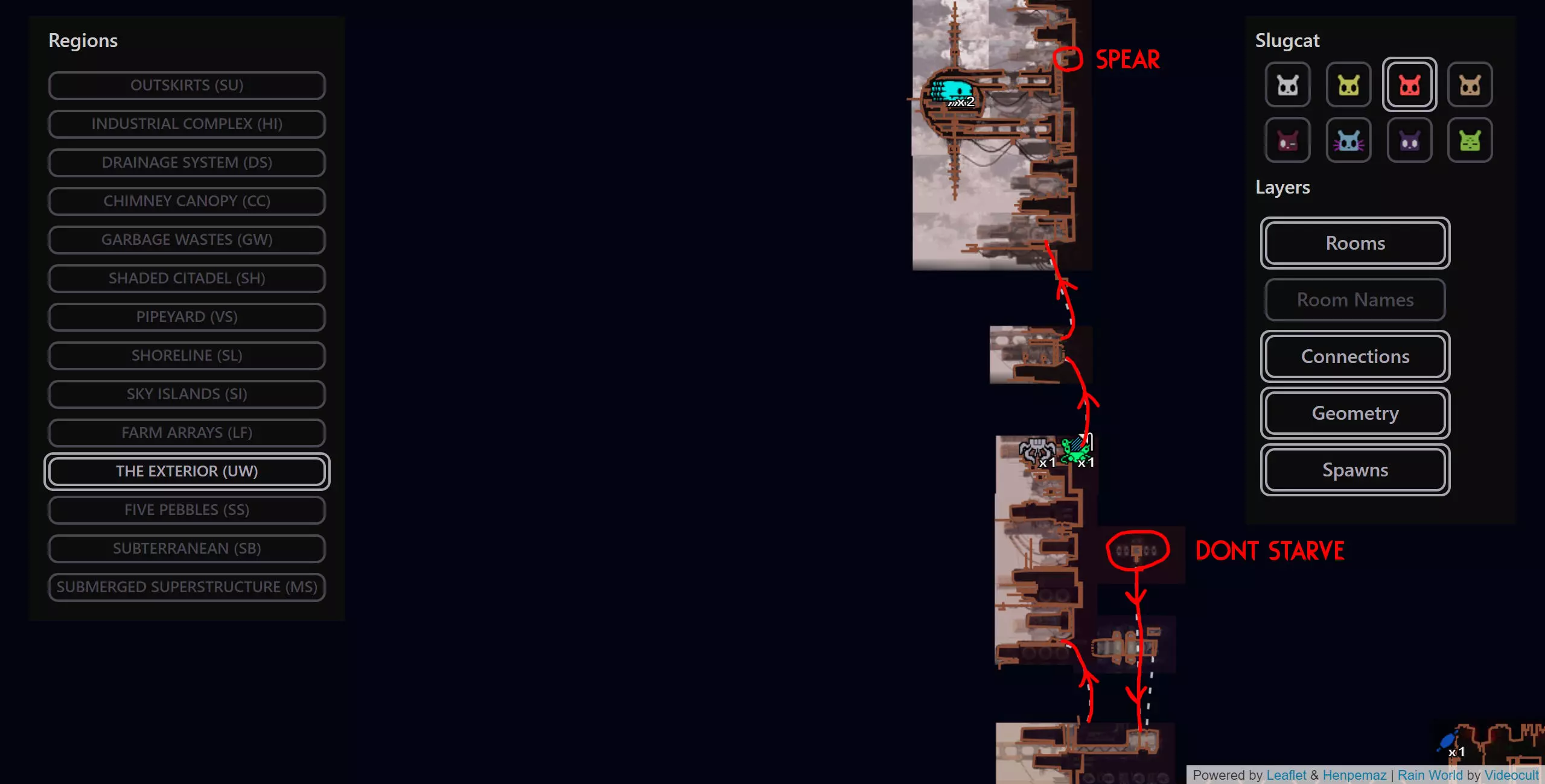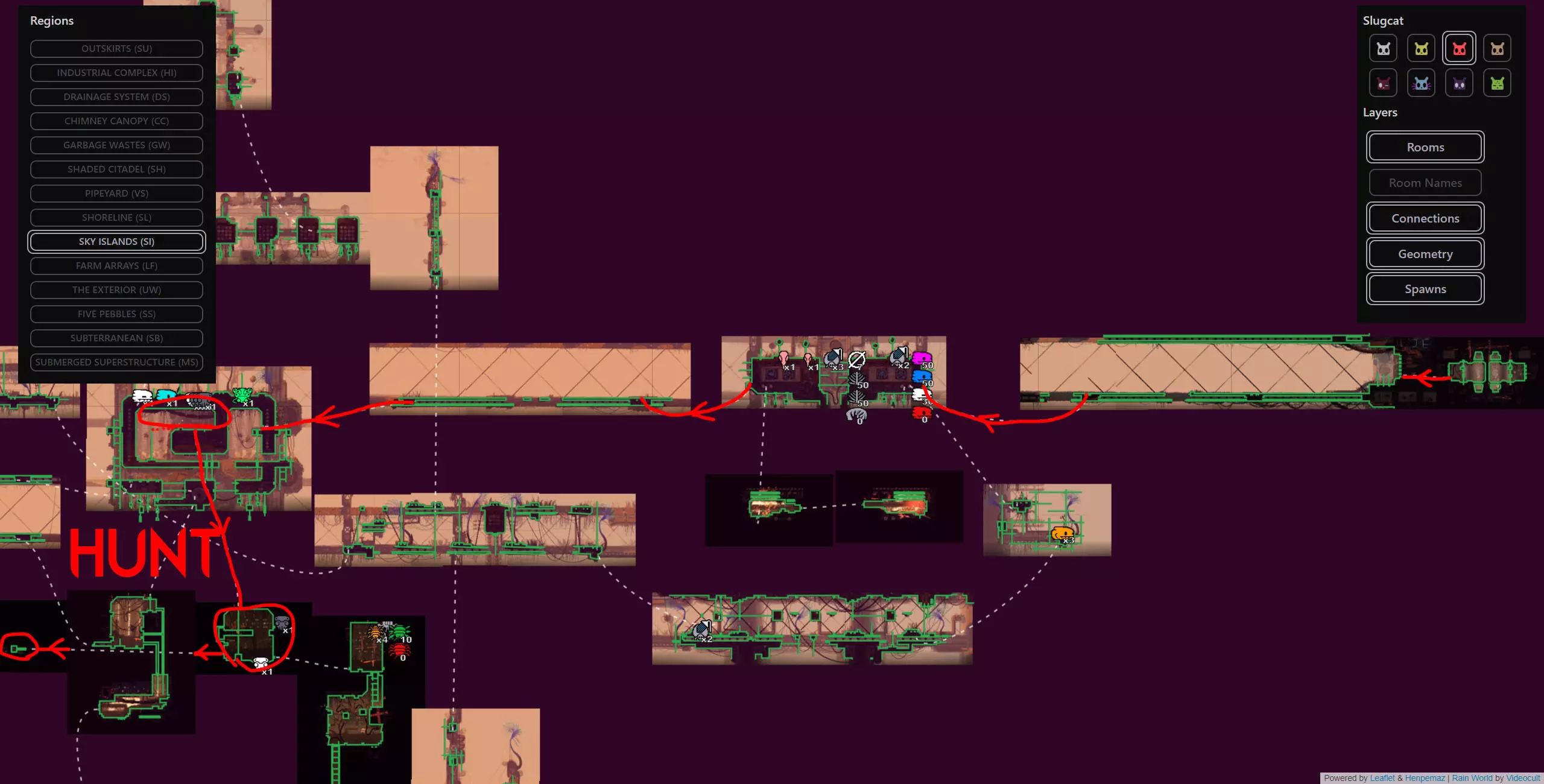 As you wake up you will need another 9 food pips, but luckily you’re in squidcada heaven. You can hunt squidcadas and eat baby centiwings near the shelter and in the adjacent screens relatively safely. Once you are full, grab a new squidcada and continue to the east towards the Chimney Canopy karma gate. The trip from this shelter to the Chimney gate is a fairly safe and peaceful one so I don’t really have much advice for it. Refer to the map/video for directions. As soon as you make it past the karma gate into Chimney Canopy with your squidcada buddy, take him with you into the shelter and hibernate. Segment #2 Video Walkthrough (with text commentary): Congratulations, That's by far the hardest segment of the whole run and it's now behind you. Segment #3 (Chimney Canopy > The Wall) We wake up with our squidcada buddy at the shelter next to the Chimney Canopy gate, feel free to use him as food at this point. If you’ve been properly using the starvation mechanic to keep your karma intact, you should be at maximum karma. You need karma level 6 or 7 for the Chimney echo to be active. NOTE: Whenever you are at maximum karma, you can afford to take the risk of NOT starving. Since you’re already at max karma, starving does not increase your karma and is therefore pointless. Make one non-starved attempt. If you fail, that will decrease your karma by 1 and then you will have to starve to proceed safely beyond that. This cycle is relatively safe, and a good time to give ONE non-starved attempt if you wake up at maximum karma. Now it is crucial that you are at the correct karma level for this cycle as we need the echo in this area to be active. We will finally be using that Vulture Grub that we collected back in Farm Arrays near the start. Now tossing a live Vulture Grub on the ground will cause it to send a signal laser to the sky. In rooms with an open sky, this will summon a Vulture. Now as I have mentioned before, any creature that enters a zone with an active echo will immediately fall asleep. This means that we can use the Vulture Grub to summon a Vulture (or preferably a King Vulture) and they will plummet from the sky unconscious, at which point we can just spear it to death, eat it and take its' mask for free. Eating it will provide 9 food pips and a simple spear to the face after it dies will drop the mask. The mask causes most Lizard type enemies to flee in terror from us temporarily, which will make the upcoming segments much much easier. IMPORTANT NOTE: This guide did not used to include this easy Vulture Grub strategy and instead had a detailed strategy on how to bait a Vulture into the roofed bridge near the Wall karma gate and ambush it there where it cannot fly away. I have since removed the detailed text explanation on Vulture combat and shortened this segment. However, you can still find the "NO VULTURE GRUB" video for this segment below just in case you forgot or were unable to bring one with you. Segment #3 Video Walkthrough (with text commentary): NO VULTURE GRUB STRATEGY: Once you have your mask and have had your victory meal, proceed past The Wall karma gate and rest at the shelter just outside of it. Congratulations, the mask you got will come in handy moving forward Segment #4 (The Wall Echo) Now, you may have thought I was crazy in the overview when I said that we will be climbing the wall and visiting The Wall echo as it is quite the daunting task on paper. The Wall is filled to the brim with cyan lizards and white lizards and is one of the most dangerous areas in the game due to this reason coupled with the limited space to evade them. Now what if I told you, that we’re skipping the shelter up the wall and climbing the whole thing in one cycle? Wait! Wait! Don’t leave yet, I can explain! Yes, The Wall is a dangerous area, but I have multiple reasons to bring you here during your Hunter run. 1.Thanks to our brand new Vulture mask, 90% of all the Wall’s inhabitants are now afraid of us. This makes the climb far easier. 2.The Wall echo is one of only 2 echoes in the game that do not have a karma requirement. This means that you do not need to starve or worry about dying or karma at all, the echo will always be there. 3.You can die as many times as you need to and you can just restart and try again with no consequences to the overall run and visiting the echo at the top will give you the karma boost, max out your karma, and then you will wake up all the way at the bottom ready to leave as if the cycle never happened. IMPORTANT NOTE: If you hung onto the green neuron from the beginning, it is possible to deviate from my plan here and visit pebbles from the top of the wall. He will boost your karma like an echo would and give you 5 additional cycles. This is completely unnecessary but it’s an option nonetheless. If anything, this can serve as practice if you ever plan on doing an All Objectives Hunter run.