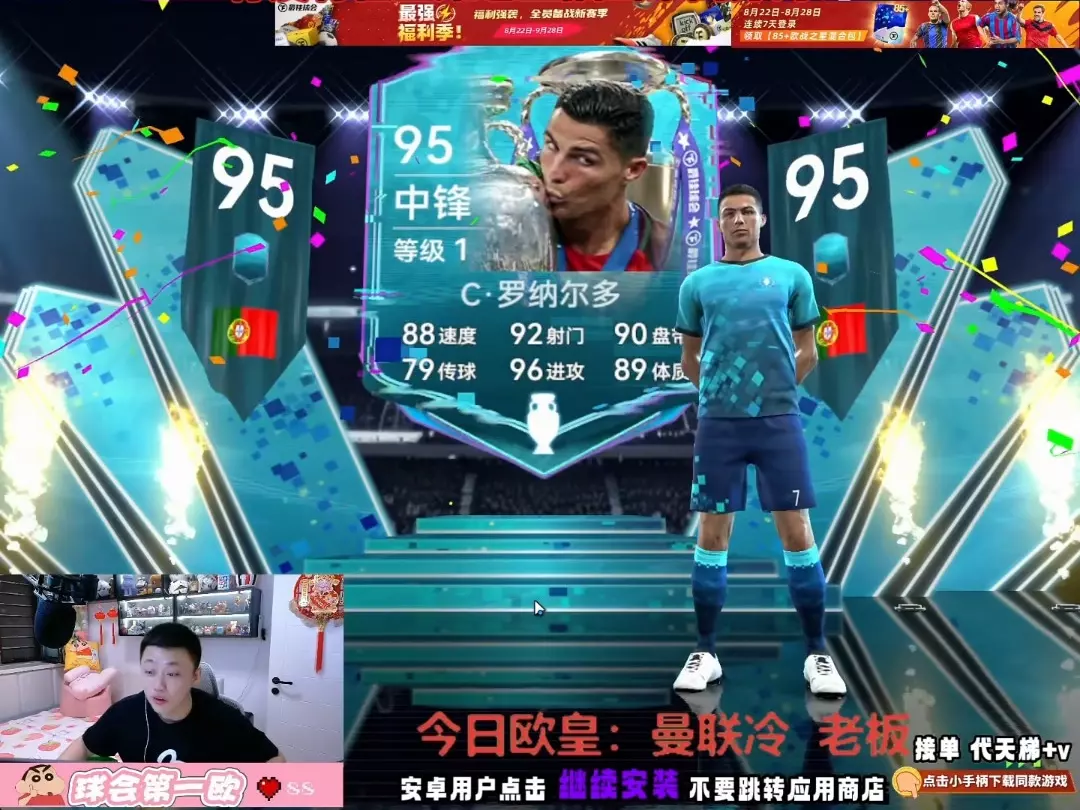这是《最佳球会》的游戏实况,铁齿哥退游回归后抽卡追梦,喜提97分金电梯时刻C罗,还进行了89分卡3连开,视频展示了C罗卡牌及抽卡的兴奋瞬间。