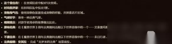 详细介绍: 1、这个我也有!:在坐骑狂欢中配对1次坐骑。 2、时尚批评家:在时尚狂乱中投出1票。 3、宠物淘气包:使用宠物伪装器变成宠物的样貌,并探索这片区域。 4、气球好手:乘坐一种庆典气球。 5、喧闹观众:对游学者周卓的故事做出反应。 6、原味经典:在《魔兽世界》周年庆典期间击败以下世界首领中的一个——艾索雷苟斯、卡扎克、莱索恩、艾莫莉丝、泰拉尔、伊森德雷。 7、不请自来:在《魔兽世界》周年庆典期间击败以下世界首领中的一个——末日行者、怒之煞、岩石看守者阿尔卡冯 8、法典编辑:安其拉 - 完成“克罗米的法典”场景战役。