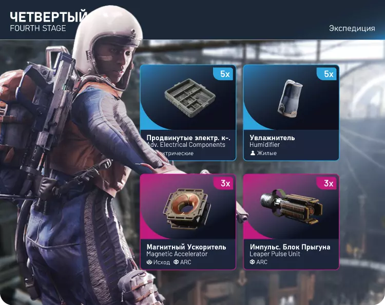 探险。第四阶段: 高级电子元件x5,加湿器x5,磁力加速器x3, 脉冲跳跃模块x3