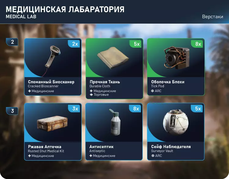 医疗实验室:损坏的生物扫描仪x2,坚韧组织x5,跳蚤外壳x8,生锈急救包x3,防腐剂x8,观察者保险箱x5