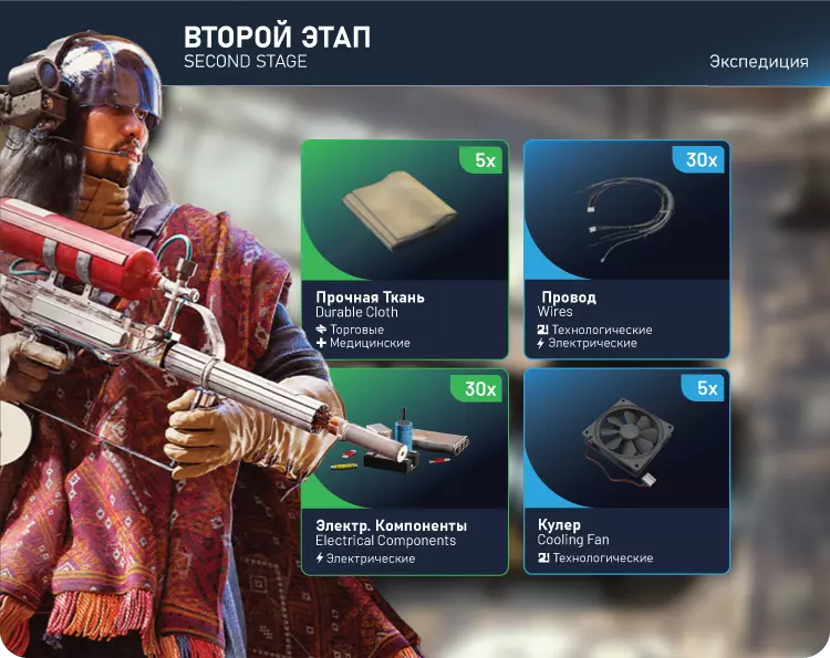 远征。第二阶段: 坚固布料x5,电线x30,电子元件x30,散热器x5
