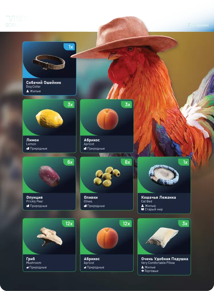 普柳什金:狗项圈x1,柠檬x3,杏x15,仙人掌x6,橄榄x6,猫窝x1,蘑菇x12,非常舒适的枕头x3 探险队