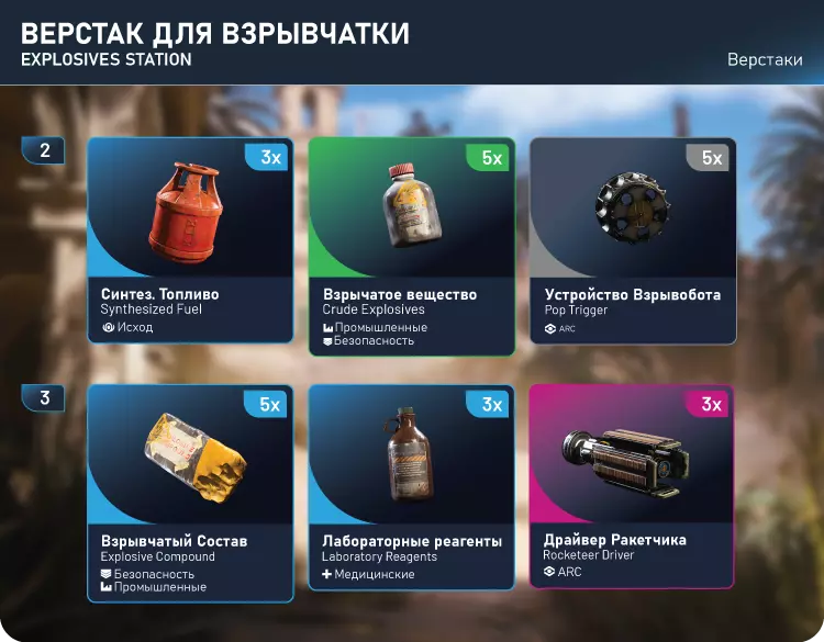 爆炸物工作台:合成燃料x3,爆炸物x5,爆炸机器人装置x8,爆炸成分x5,实验室试剂x3,火箭筒驱动x3