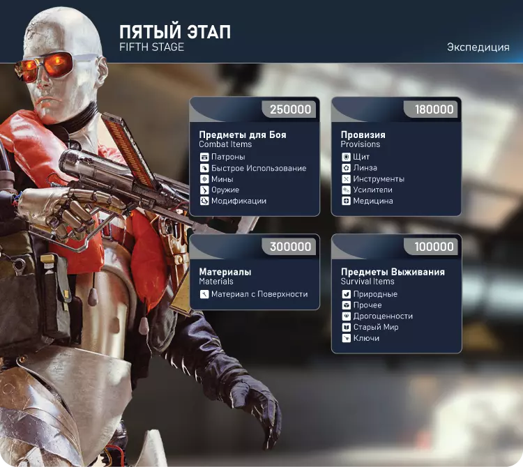 远征。第五阶段:战斗物品250000,补给180000,材料300000,生存物品100000