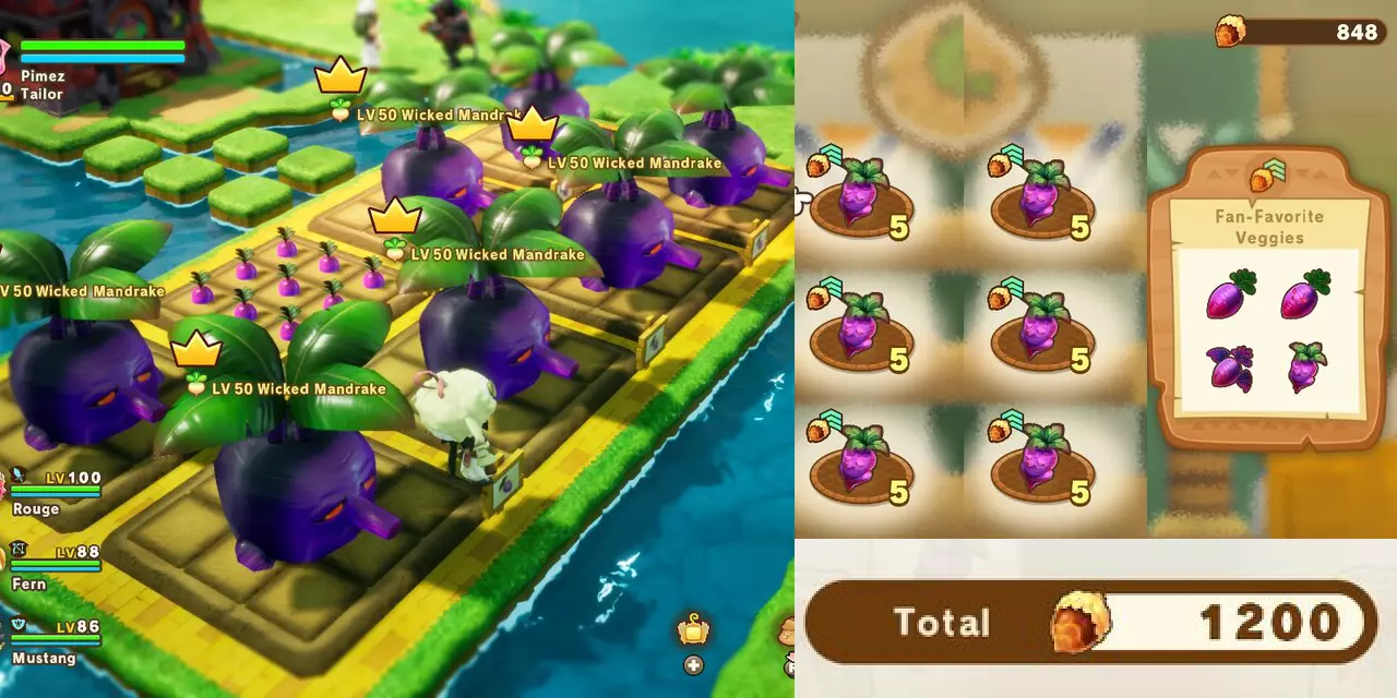 农场概述 你将在基地营地完成大部分生活目标。 每30分钟返回基地营地签到一次。这会启动下一个30分钟计时器,让蔬菜生长到下一阶段,如果不浇水它们可能会枯萎。 即使每10小时才签到一次,蔬菜也不会枯萎,但签到时必须浇水。 尽快开始种植,这样你在升级时就不会那么受时间限制。 当你持续种植和收获普通蔬菜时, boss蔬菜会随机出现。 通用策略: 充能你的【光能量】 当任何【挖掘探测器】从红色变为蓝色时释放 重复上述步骤 使用【重能量】作为最后一击 对于每个boss蔬菜,像往常一样获得【excellent】评价可以获得更多奖励,即虽然有些过头,但你只会获得8颗种子和8~10个非首领级蔬菜,而不是通常的9颗种子和18个非首领级蔬菜。通过击中探测器可以触发连击,这会提高你的伤害输出,但似乎不会影响奖励。连击等级依次为:“良好”→“非常好”→“优秀”→“太棒了”→“火力全开”。游戏内指南称连击计量条会影响奖励品质?目前尚不确定这意味着什么,也不清楚它会如何影响我的测试结果。不要害怕改变农场的蔬菜种类,这样可以更快完成目标。当不再需要其他蔬菜时,将所有地块都种上暗影胡萝卜,因为它们能卖出额外的坚果币,这是吉诺莫西亚中一种重要的货币。普通、 uncommon、稀有、首领变种的蔬菜售价各不相同——大多数蔬菜:每个1、3、5、10坚果币;暗影胡萝卜:每个5、10、15、20坚果币。每块满种的作物地块,至少能收获:普通蔬菜 首领蔬菜 大多数蔬菜种类 18坚果币 29坚果币 暗影胡萝卜 90坚果币 85坚果币 雨非常罕见,会影响基地营的作物。它们不再需要浇水,会跳过发芽阶段,并在播种后30分钟成熟。首领蔬菜不能雨天生成 不确定这是漏洞还是特性,有时玩了一段时间后睡觉,雨会完全停止。如果你想保持下雨(即恢复下雨状态),应该只在基地营的户外睡觉,因为这是唯一能在不触发自动保存的情况下改变时间的方法。