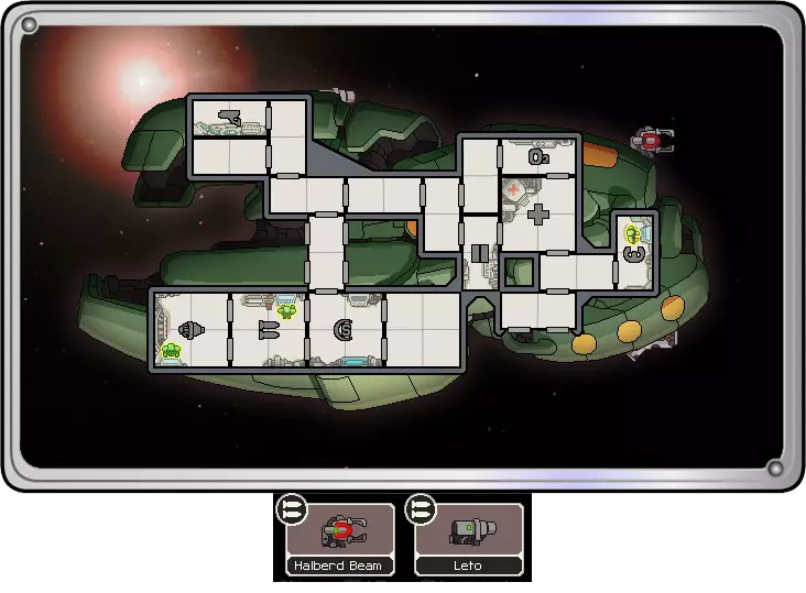 扬名立万 戟式光束炮是个相当出色的初始武器,能对命中目标造成可观伤害,几乎能一击摧毁小型舰船。你拥有一门莱托炮,但初期它基本派不上用场,得靠戟式光束炮单独作战。你没有足够能量同时启动两者,而且戟式光束炮在几乎所有情况下都更具优势。初期这样没问题,但你需要尽快为武器系统增加额外能量条,以便能同时部署两者(当你对抗带有两层护盾的敌人时就会需要它们)。 说实话,莱托炮的唯一作用就是击破护盾……其他任何目标都可以由光束炮本身来处理。但要记住,与其他光束不同,戟式光束可以穿透一层护盾(尽管伤害会降低)——所以要节省你的导弹。使用光束时,不仅要尽量击中尽可能多的房间(伤害按房间计算,因此被光束覆盖的房间越多,即使只是角落,造成的伤害也越大!),如果护盾室尚未完全瘫痪,还应从护盾室开始攻击。如果在激光开始时瘫痪护盾室,后续的攻击将造成最大伤害。 小发光伙伴
