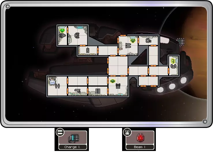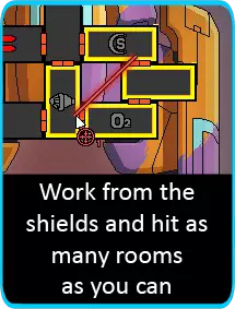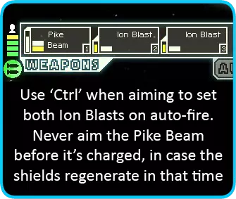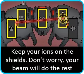 现在剩下的就是持续用离子炮瘫痪敌方护盾,同时让你的光束无人机发挥作用。电池很可能在你摧毁敌舰前耗尽,所以你有两个选择。 你很可能已经接近胜利……因此,将氧气系统的能量分配给光束无人机以维持攻击(你的充能离子炮应该仍在运作,所以离子炮的射击节奏不应出现中断)。如果情况并非如此,你可能需要启动护盾(将氧气和充能离子炮的能量转移,直到你的一名佐尔坦船员抵达护盾室),然后等待能量充能。充能完成后,重复上述步骤。 不用说,升级反应堆很可能是你在前几个星区的主要目标。一旦你获得任何非佐尔坦种族的船员,别忘了换下驾驶座上的佐尔坦船员,这样你就能多获得一个能量条可用。