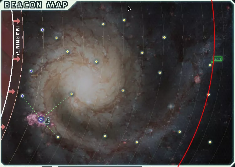 要判断进入星云是否有益,先选择一个你在穿过星云后想去的信标。以我为例,我想去出口信标。接下来,计算叛军舰队正常情况下追上该信标的跳跃次数,这里是11次。从这个次数中减去半次跳跃。然后看目标信标是否在这个减去半次跳跃后的位置之外。如果是,那么进入星云对你有益;如果不是,就没有益处。在上面的图片中,你可以看到我画了一条红线来表示减去的这半次跳跃,而出口信标确实在这条线之外。