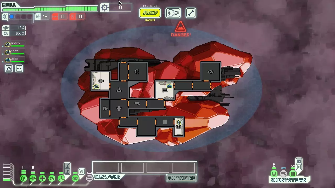 Well, now that we've jumped, the rebels will overtake the exit beacon in 12 jumps. Previously it would've taken them 13 jumps. So basically, we might as well have not visited the nebula at all. A second nebula beacon would be beneficial though, since now the exit beacon is beyond the red line. Also, don't forget, the rebel speed is only altered by a nebula when you're jumping from it, not when you're jumping to it. Nebula sectorsNow onto nebula sectors themselves. The only really important thing that comes to mind when considering them is the distribution of stores. In an uncharted nebula, you're guaranteed at least 1 store inside of the nebula itself. In a slug nebula, you're guaranteed 2 stores. All nebula sectors also have a 50% chance of having a store in the non-nebula portion, which means it's very much so worth it to at least check if there's a store there. The Enemy AI §1 It's stupid, and very primitive! But it's a big part of what makes FTL fun to play, and for that matter, even possible to win. Once you understand it, you'll be able to exploit it. You'll know what it will do every single time. Weapons and temporal systemsGenerally, the enemy AI will shoot a weapon as soon as it is charged. If an enemy is cloaked and the cloak is just about to run out, they will wait until uncloaked to fire their weapons. This means enemies with cloaking-1 will tend to not fire weapons while cloaked. Systems that work on a cooldown are used in a similar fashion. Enemies will cloak, deploy drones, and hack the moment it's possible; they will never wait. If using the invasion boarding mode (see below), they will use their teleporter the moment it's off cooldown. If somehow you mod an enemy ship to use a backup battery, they will use it as soon as it's off cooldown as well. TO DO: explain how enemies manage power bars Weapon targetingOne thing to note here that you may or may not have noticed: enemies can cheat with multi-projectile weapons. They can target a different room with each projectile. You might have some misconceptions about how exactly the enemy chooses what rooms to target. There is some truth that randomness comes into play, but it is a little more nuanced than that, at least for weapons. The rooms the enemy picks depend a little on the difficulty you're playing on. The odds are as follows: DifficultyRandom roomRandom systemPriority systemEasy4 in 51 in 5NeverNormal2 in 31 in 3NeverHard1 in 21 in 41 in 4 It's worth emphasizing that "random room" includes empty rooms and rooms with systems in them. What the heck does "priority system" mean, though? Well, it's a targeting mechanic exclusive to hard, which, once you know about it, can ironically make the game a little easier. Basically, systems are placed in a prioritized pool that is picked at random from 25% of the time. In order to be placed in the pool, a system must satisfy a certain condition. A system does not necessarily have to be powered to be targeted. The conditions for the systems that can be prioritized are as follows: Shields: Is powered. Doesn't matter if it's just 1 bar from a Zoltan. Weapons: Is powered. Drones: Is powered. Piloting: Evasion above 25%. Engines: Evasion above 25%. Oxygen: Oxygen below 50%. Clone bay: Any crew members are in the cloning queue. Crew teleporter: You have boarders on the enemy ship. Cloaking: Not on cooldown. Artillery: If it is about to fire in 4 seconds or less. Hacking: If hacking is in progress. Doors: If fires or intruders are present on your ship. Theoretically speaking, this means if only one system is in the priority pool, then that system will be targeted 25% of the time + whatever chance the system had to be picked out of all the rooms/systems. A useful early game tactic is to very briefly depower your weapons before the enemy fires theirs, that way the only way they would target the weapons is if they did not pick from the priority pool. If we were talking about Stealth B, as an example, I'd say you can go a bit further by venting rooms so your oxygen is below 50%. This will make oxygen more likely to be targeted, and cloaking less likely to be targeted. Burst weapons and beams: Maybe you didn't notice this, but the AI cheats when it comes to burst weapons. When an enemy targets multiple rooms with a multi-projectile weapon, each projectile will hit a different system—the AI will never target the same room twice. Less cheatingly so, a beam weapon is treated by the AI as if it had two projectiles, one for the starting room, and one for the ending room. This means on hard, it is possible (but unlikely) for the AI actually target everything in the priority pool with 1 weapon, and still have a few shots to go. If this happens, the AI will fallback to targeting random systems. Also, as an interesting fact: is actually impossible to have the AI shoot a burst weapon with more shots than rooms on your ship. This will cause the game to crash. So yes, when I say the AI never shoots the same room twice with the same weapon, I mean it. I should also note that none of the information I just stated when it comes to burst weapons/beams applies to the Rebel Flagship's superweapon. I'm pretty sure that weapon is just total RNG, but I haven't looked into that, so take what I say with a grain of salt. The Enemy AI §2 General behavior for crewCrew that are already in a room, regardless if they're boarding, manning a system, fighting, etc. will tend to stay in that room to finish the task they're working on. This is generally the only way you can more have than one enemy crew fixing a system at a time, as an example. If they have nothing in that room, then they will leave. Pathfinding for crew isn't perfect. Sometimes they will ignore better paths, or paths that actually work, and insist on the shortest path. A very infamous example is them trying to beat down a door when an open one is right next to it. Manning prioritiesEnemy crew will man the following systems in this order: Piloting Engines We