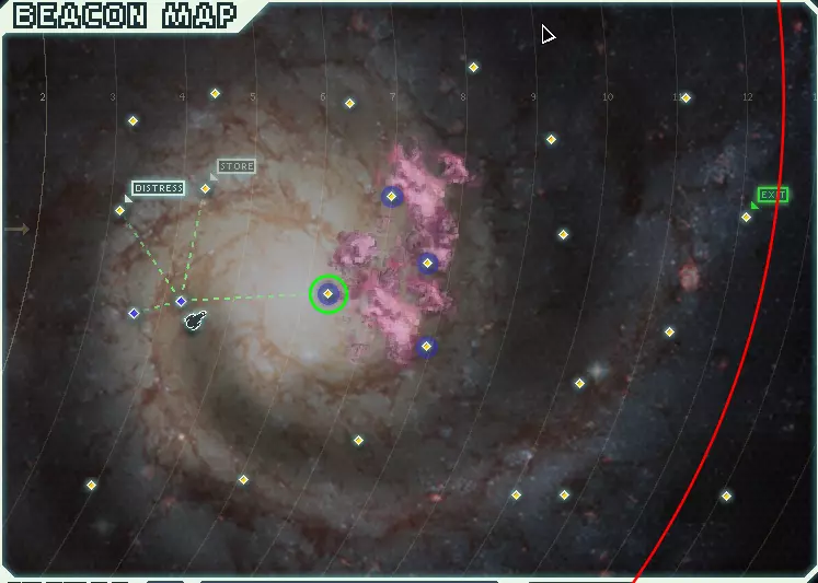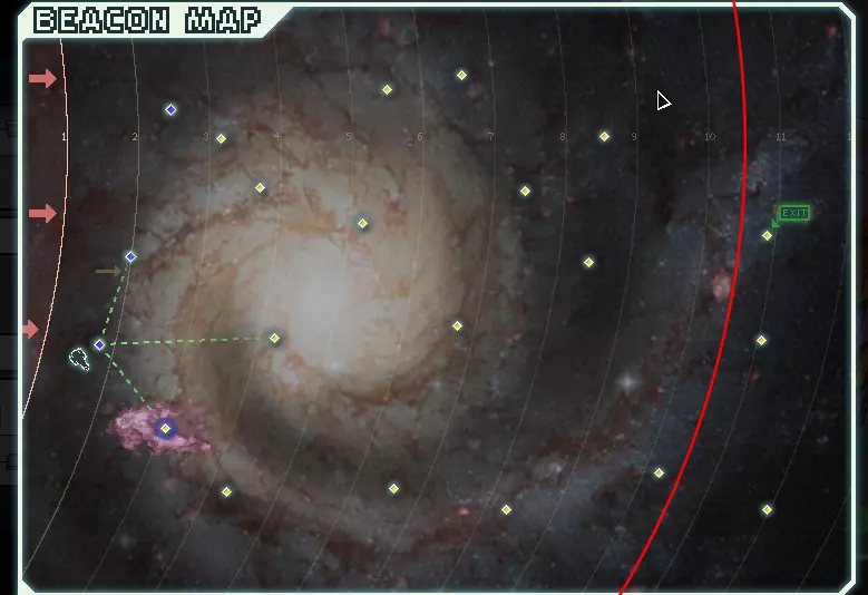 Where: D is the ion damage taken. P is the power in the system. Subsystems get treated as if they were a fully powered system. So for example, doors-3 will be considered as having 3 power bars in it, and thus will always take 2 ion damage. The bar added to the subsystem level for doors and sensors is also considered. So manned doors-3 is treated as if 4 power bars are present, and thus 3 ion damage is taken. The system is totally ionized and as such, the system goes unmanned. Since the damage taken is actual ion damage, the shenanigans related to that will come into play. If a Zoltan shield is present: If you do not have ordinary shields (either lack the system, or shields are unpowered), the game will act as if you don't have a Zoltan shield either, so you'll need to refer to the above section. This is probably a bug. If you have ordinary shields alongside it, it will completely absorb all of the ion damage, regardless of how much health it has left. It will take 3-4 damage. Thus, a well-timed shield drone can be used to mitigate the effects of the pulsar. Asteroid fieldsAsteroid fields cause an asteroid to be flung at you and your enemy periodically. The rate at which the asteroids spawn in is proportional to how many shield bubbles you have. Asteroids act like any other 1-damage projectile, but they can be shot down by defense drones. You cannot level up piloting or engine skills using asteroids without an enemy ship present. NebulaeThere are two obvious things nebulae do, and one not-so-obvious thing they do. Firstly, nebulae slow down the rebel fleet by 50% if you're inside them when you jump, as the rebel fleet speed is determined by the beacon you're in, not the one you're jumping to. As for nebula beacons where the rebels knew about the nebula ahead of time, the rebels get slowed down by 20%. Secondly, they disable your sensors entirely. This isn't really that big of a deal, but it is worth noting. You can counter this by having slug crew or Lifeform scanners, but I wouldn't go out of my way to get those things just for this. The non-obvious thing is that nebula beacons tend to have less rewarding events, as they're frequently empty beacons. If the rebels haven't taken over the exit beacon, then the exit beacon is guaranteed to be empty if it's in a nebula. Ion stormsIon storms either occur randomly inside of nebulae or when you enter a non-exit nebula beacon controlled by the rebel fleet. They halve your reactor output (if it's an odd number it's rounded up). Zoltan power bars and the backup battery are unaffected, so those are a good way to counter ion storms. Buying additional power bars can help, but it's a little costly. Pausing the game during the event prompt will allow you to easily redistribute your power before beginning any battles. Unlike suns, when you're using long-ranged scanners and a beacon has an ion storm with no ship, there can be more than just boarding events, and the event can net you rewards. Anti-ship batteryThere will be lots of projectiles shown in the background. Most of these are aesthetic. The actual shot that hits you will be announced by a siren and the "ASB TARGET LOCKED!" text. Unlike other hazards with a siren, ASBs use different timing. Every 15-20 seconds, the warning siren will come up. Then 5-10 seconds later, the ASB projectile will appear. The projectile be aimed at a random room. If it hits, the projectile will deal 3 damage and cause a breach. ASB projectiles can be evaded, and thus cloaking + 40% evade can negate them entirely. Nothing else can defend you from ASB projectiles—not even zoltan shields, which as far as the projectile is concerned, don't even exist. In some events, the ASB will target the enemy rather than you. Other than the target, nothing else is different about this. It's important to note that ASBs and other hazards cannot co-exist. The rebel fleet will, however, overwrite the contents of the beacons they take control of, so for the most part this does not apply. However, it does apply to nebula beacons, since the rebel fleet cannot overwrite the nebula. Thus, rebel fleet fights in nebulae are ASB-free. Since the ASB projectile takes a minimum of 20 seconds to appear, and a couple of seconds to actually hit you, you can jump away unharmed if your FTL charges quickly enough. At minimum, a L2 engines dude and engines-6 is all you need, since this will cause your FTL to charge in 22.7s. You can occasionally get unlucky if you go with the bare minimum, because the ASB can hit before that time elapses in rare circumstances. How events work You might've not realized it, but the rewards you get differ from event to event, and most events aren't even really just one event—they're a tree or chain of events. How exactly does the game decide which events to give me?There's three main ways events will show up. Firstly, each beacon gets assigned a random event at the start of a sector. Not all events can show up in this way, but many do. Of these, some events are generic and can occur in all sectors, and some are restricted to certain kinds of sectors. Some can only appear once per sector, and some can appear an unlimited amount of times per sector. The exit beacon is unique in that it is always assigned an event where you won't need to fight a ship. Additionally, the exit beacons located in nebulae will always be empty beacons. Of course, these two things don't hold true if the rebels control the exit beacon. Secondly, events will cause other events to show up. This is done in three ways: When a prompt shows up and you choose a response. Choosing a response loads another event, which you might not notice since a lot of the time an empty event that does nothing is loaded. The event can generate a quest beacon, which will overwrite some other beacon in the sector you're in. The event can load a ship, which can prompt further events. Each ship can load events whenever the enemy begins charging their FTL, successfully jumps away, 