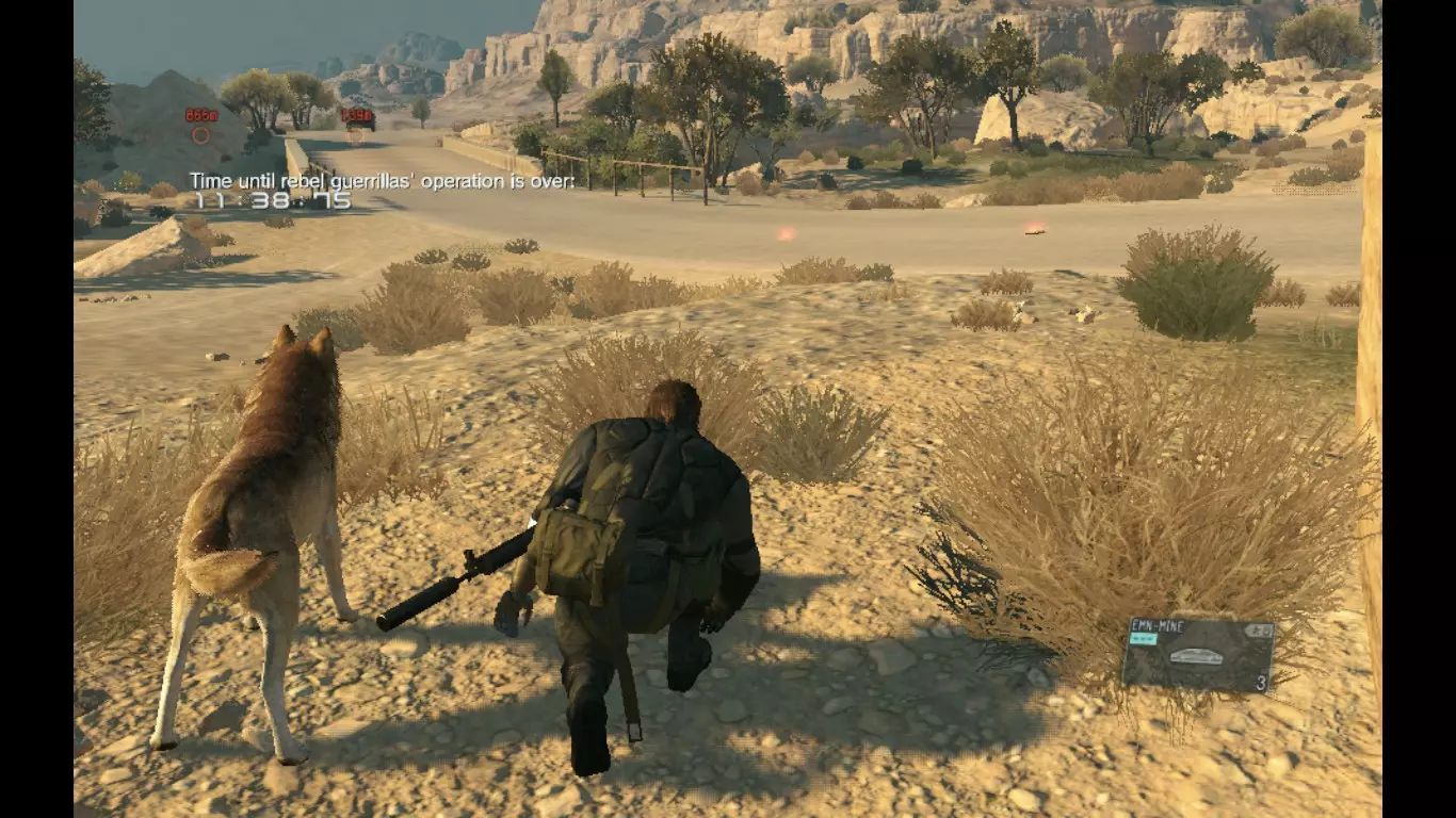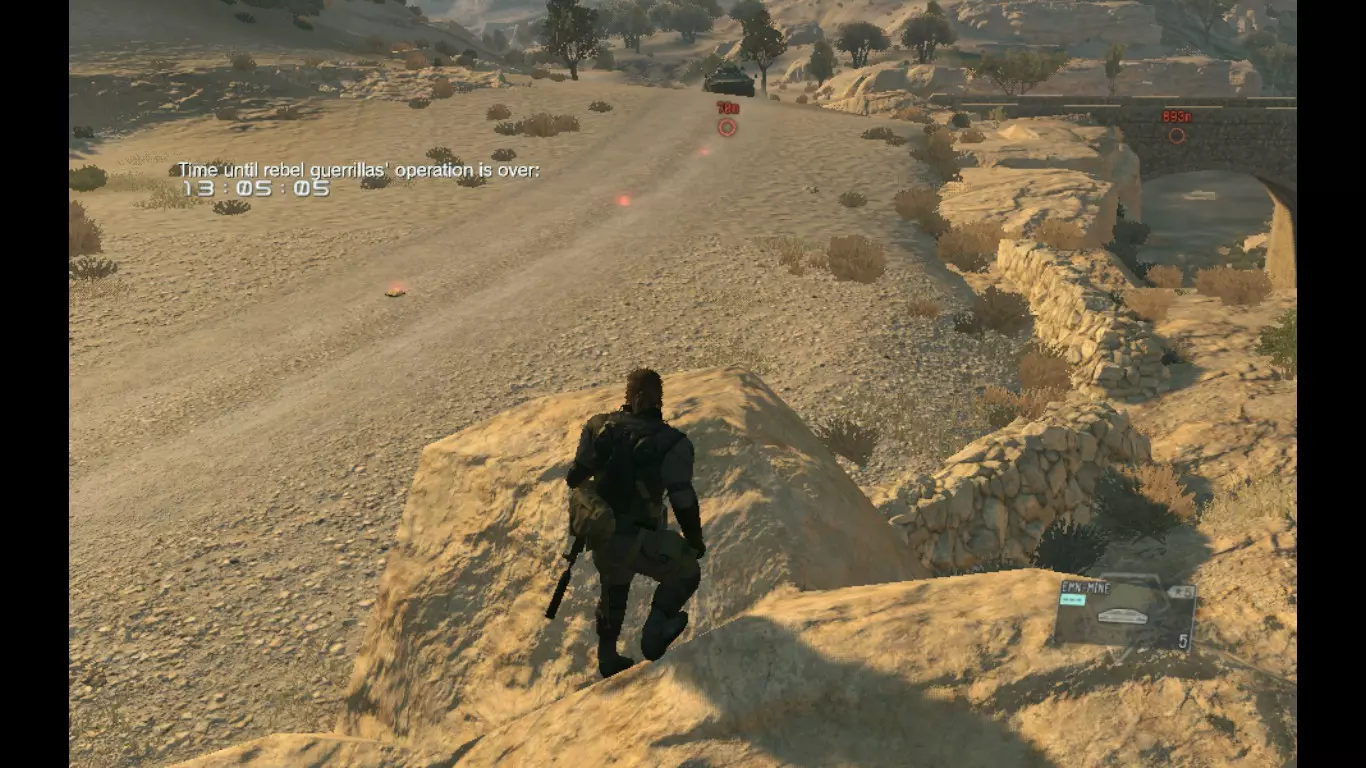 现在你可以在小桥附近的这条路上设伏。放置你拥有的任何地雷(无论你想进行 Fulton回收还是单纯摧毁,两种方式都可行),并守卫这片区域以及第二辆载具将要经过的小路。 注意,使用消音的穿透性武器(非麻醉武器)向载具射击,可使其停下且不会立即触发警报,这能让你在载具察觉前有机会进行Fulton回收。即便载具发现了你,也不会惊动其他单位。 摧毁或Fulton回收前三个目标后,再次前往补给前哨站的北部(靠近你起始的位置),在那里也布设一些地雷,以应对运送囚犯的车辆。在囚犯的车辆上使用EMN地雷,确保其安全,同时也能拦截后续到达的车辆。