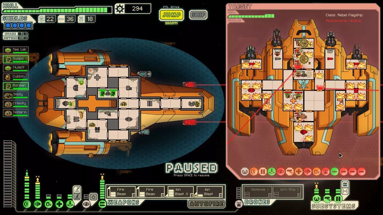 If you have enough ion power, you can disable their medbay or clone bay to prevent healing or respawning. All races and skill levels deal damage at the same rate to systems. That means that an unskilled Engi can damage an enemy system as fast as a fully leveled Mantis. And yes, its somehow possible for a fistfight to end in a tie. (See Screenshot) Power Management You never need to have all systems fully powered. If you're not actively using a system, it doesn't need to be powered. Good power management can free up scrap to allow you to buy or upgrade things long before you otherwise could. Systems Powering Preferences You'll want to do your best to have shields fully powered and recharged at the beginning of each jump. This is because you'll sometimes jump into an asteroid field or a ship with Combat Drones. If your shields are down, asteroids could keep them down long enough for the enemy's weapons to deal damage. The same can be said about Combat Drones. A Combat Drone II might even score a hit before your shields come up. If you assess the enemy ship and determine that you don't need to have your shields fully powered, remove that power from the shields to use elsewhere. Aside from this, the only other time its safe to rob shields of their power is when your shields have recently been hit, and you still need to dodge some lasers. For example, lets assume you have level three shields, level six engines, and you're in an ion storm so you have half reactor power. Lets say the enemy has a Burst Laser III. You have enough power to fully power shields, but only two power into engines. If the first laser hits your shields, reroute two power (from the layer of shields that just went down) to engines. And the next time that a laser hits, reroute two more power from shields to engines. You can substantially increase your evasion during a volley with this technique and save a lot of hull damage. How you want to handle weapon system upgrades and powering depends completely on your entire loadout. If you have strong boarding, you'll only need minimal weapon power to support the boarders. If you have a Weapon Pre-Igniter, you'll probably want to put a lot more into weapon system upgrades and make sure they're fully powered before each jump. Sometimes, you'll have two weapon "sets" to choose from, and they don't both require power simultaneously. Consider the following loadout: Fire Beam, Burst Laser II, Ion Blast I, Ion Blast I. If you have this fairly early on, you really only need four weapon power to be effective. Generally, you'll either want to destroy the ship or kill the crew. If you're killing the crew, the Burst Laser II isn't required (however, it can definitely be helpful, so you'll want to purchase those system upgrades eventually). Engines are one of the first systems I rob to use power elsewhere unless I'm trying to flee. Its always a good idea to have one or maybe two levels of engine more than what you can power. You only need engine power for dodging, and engines need no time at all to adapt to the new power. Its easy to quickly steal power from oxygen or another system to attempt to dodge a missile or laser volley. Generally, you don't need to have a reactor power solely for the oxygen room - just borrow it from engines whenever you don't need the evasion. If you have a defense drone, you don't need to have enough power exclusively for the system to run it continuously. Power up the drone only after the first missile is fired (sometimes it can be shot down accidentally or you could disable their missile launcher before it fires). You can always rob engines and oxygen for this. If you're using a ship that is particularly large or long, its a good idea to move the drone into a good position after a missile is shot down because defense drones have limited range. Position it by leaving the drone power on while the drone traverses the nose and and more importantly, the tail section. Cut power when it starts back around the side. It will be able to cover much more of the ship next time its powered on. Power management for the rest of the systems is very situational. You'll almost never need to keep power in mind control. Hacking is very useful in many situations, but all three power is rarely required. Cloaking is incredibly useful, but its easy to steal power from another system to run it (just make sure your engines are powered enough to give you 100% evasion or as close to that as possible). Types of Power There are three types of power sources: Your reactor, Zoltans, and the backup battery. The backup battery is a supplemental power source, and it should be used accordingly. Neither your primary defense or offense should rely on it. You can determine which systems are supplied by each source. Zoltans need to be moved from room to room carefully, so they don't depower important systems like weapons or shields when they leave. The other power can simply be assigned in the lower left system menu. Its a good idea to take your time and decide which systems should receive backup battery power because once the battery runs out, two or four power will be removed immediately. You can do this by assigning power to all of the systems that need continuous power first, then assigning power to the systems you want powered by the backup battery. Systems like weapons and shields need to be powered continuously to be effective, so they shouldn't receive backup battery power. Systems like oxygen, medbay, engines, and even offensive drones don't need continuous power, so they won't be harmed if power is momentarily cut and rerouted once the battery is drained. Its most efficient to use the backup battery on systems that have a cooldown. Cloaking, mind control hacking, and teleporters are all candidates. Both these systems and their power source have a cooldown, so your reactor power won't be locked into the disabled system while its cooling down. Stealing Power Zoltans can steal power from systems th