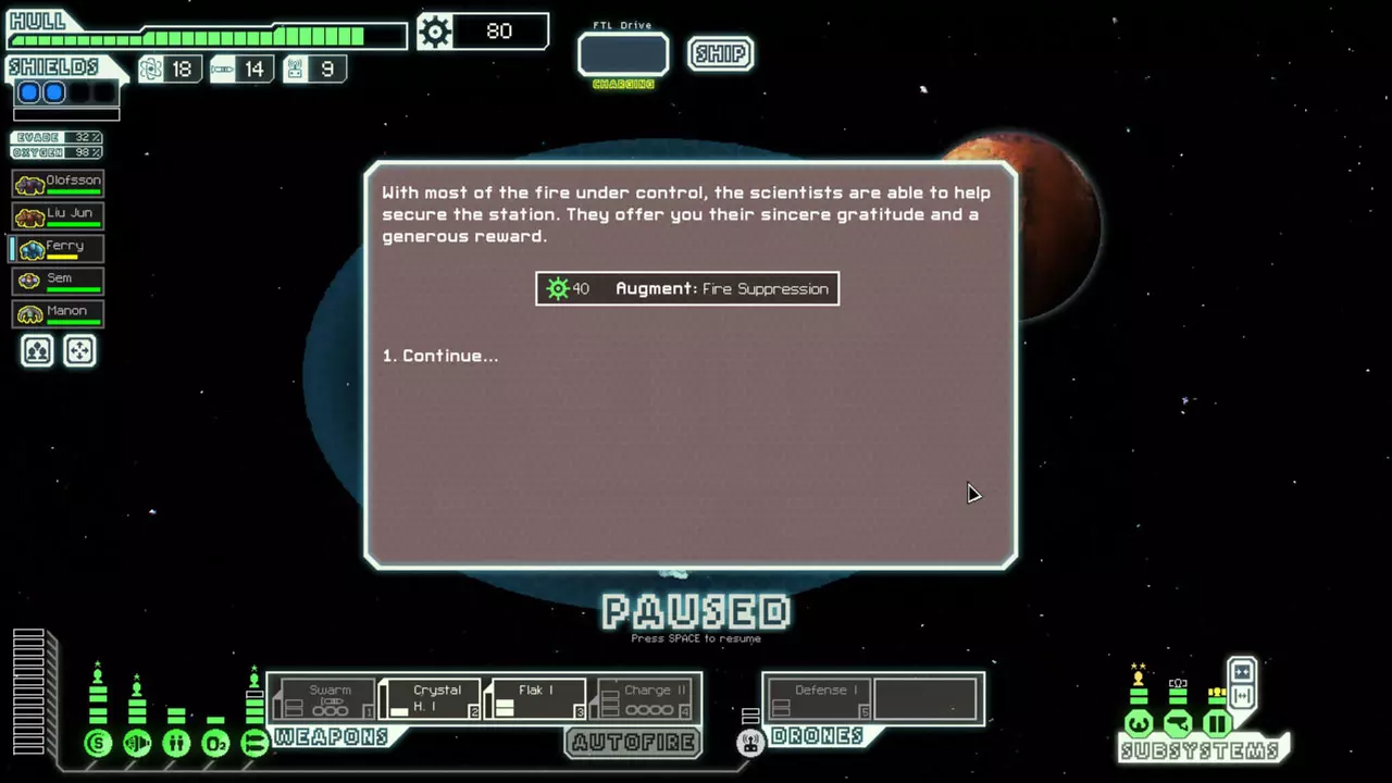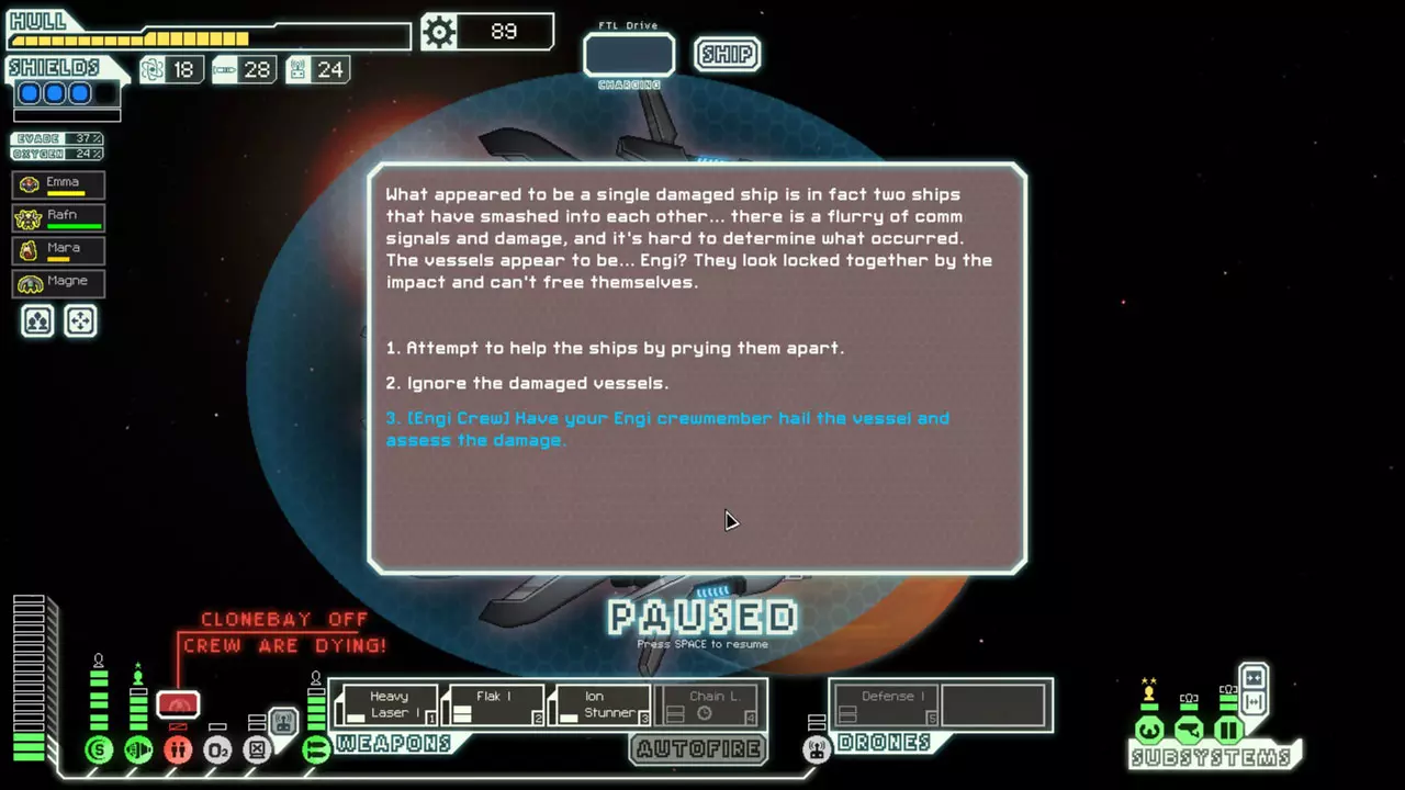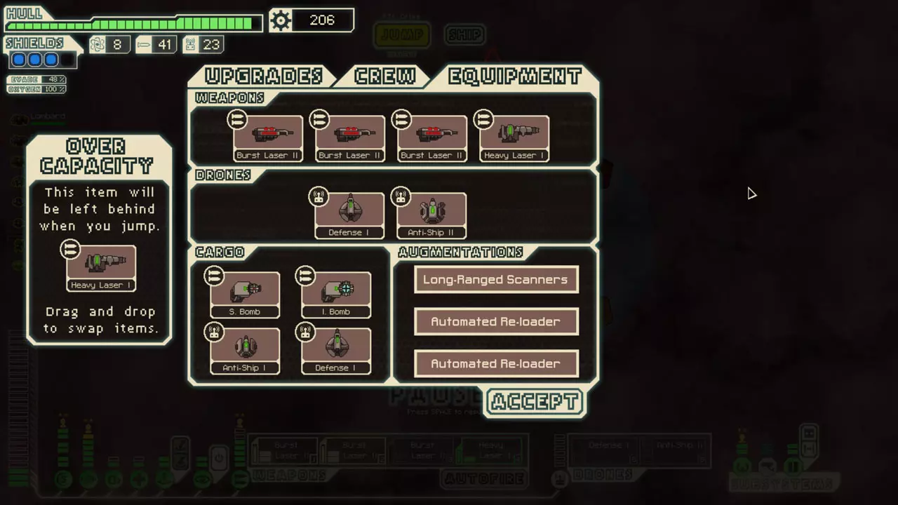 Crew that are dying in a Clone Bay that's offline can still be used for events. Sometimes, you can make a couple frantic jumps hoping to use them or find a DNA Backup augmentation before they die. (See screenshot) On a similar note, you can use this time to fix the clonebay. While you're jumping, the clonebay can be partially repaired, but no "de-cloning" progress occurs. It might take 2-3 jumps, but sometimes you can fix the clonebay, so you don't lose your crew. If you have essential crew actively perishing in a destroyed clone bay, if you buy a medbay before they're gone, they'll be locked in a sort of stasis. They won't be alive to be used, but you'll still have them. If you repair the medbay, then later buy a clone bay, you can get them back. All ships have a limited supply of drone parts and missiles (other than the Flagship missile launcher and drone Power Surge). Many times, it will be necessary to exhaust the enemy of missiles before rerouting power from drone control and starting your offensive. Sometimes you'll just barely have enough laser blasts to penetrate the shields of an Engi ship, and they have a Defense Drone II. If you want to win this battle, you'll have to fire until you randomly destroy all of their drone parts, then keep firing to damage the hull. This can take a very long time, but you'll usually need every advantage you can get. If you're low on crew or power, consider purchasing Zoltans from a slaver or store. The more your reactor upgrades currently cost, and the fewer crew you currently have, the more it makes sense to purchase a Zoltan. Usually, you won't want to overload your ship with Zoltans because they're weak against boarding. They're also great for ion storms because the power they provide isn't halved like your reactor's. With the right weapons, you can kill the crew of many ships in the early sectors without ever boarding. Heavy Lasers are great for this because they have a decent chance of starting fires and causing breaches. You'll usually want to target the O2 room when attempting this. Track the damage you're dealing to the crewmembers. Listen for breaches. Watch system damage and crew movement. If you see a system break when you know that crew is in there, then doors open, this means that the crew has given up on fighting the fire in that room. Wait it out. Usually the fire will overtake the ship, and you'll be rewarded. If the enemy ship only has a Heavy Laser I and a Mini Beam, and you know that he has no one manning the weapon system, move one of your crew to your shield room as soon as you jump. The bonus from manning shields will usually block the first hit of the Mini Beam. Generally, you should try to have 12-15 fuel on hand at all times. Some recommend only around 8-10 fuel, but I suggest more for a couple of reasons. Sometimes, you may not have an opportunity to visit a store for a long time. Other times, you won't have any reason to stop at a store other than fuel. If you have the fuel, these won't be a problem. Also, there are several events where other ships request fuel. You'll always want to have enough on hand to give some away. You never want to run out of fuel. Even with the distress beacon on, the encounter and reward rate is lower than being able to jump freely. If you'll be heading into a nebula or if you're early on in one, buy a little extra fuel due to the fewer ships you'll be encountering (especially if you don't have Long Range Scanners or if you're in an uncharted nebula) However, you can leave yourself run dangerously low on fuel in sector seven. The moment you jump to sector eight, you're given enough fuel for the rest of the run. Generally, you should keep around 2/3 hull. You'll usually not want to repair beyond that because there are events that give you free repairs. There are many exceptions, though. If you want to try for a few jumps beyond the exit, give yourself a few more hull to work with. If you know you'll be going into a sector with few stores, repair more. If you know you'll be going to a hull repair quest, don't repair at all. If you know that you'll be jumping into a sector that has a higher repair cost, buy a couple extra before the price raises. You can use an Ion Stunner autofiring on shields to easily kill enemy crew by boarding. If you autofire the Ion Stunner on shields, it will stun everyone in the shield room even if their shields are still up. The stun duration for the Ion Stunner is rather long compared to the firing speed, so crew hit in this fashion will spend a lot of time stunlocked. With very good micro, you can have your boarders in shields and carefully kite them out of the room just before the ion stunner hits the room. If you pull it off (it's easy with practice) then the enemy won't quite be out of the room whereas your boarders will be, giving you ample time to finish off stunned enemies. Even if you screw up, it's likely that everyone will end up stunned so your crew won't take extra damage. (Thanks to reddit user Paradigmist for this tip) Small and breach bombs can be used to destroy your own systems instead of fires or boarders. This will prevent you from taking hull damage. Bombs never miss your own ship, so you don't have to worry about turning off your engines momentarily. (Thanks to reddit user Histidine for this tip)