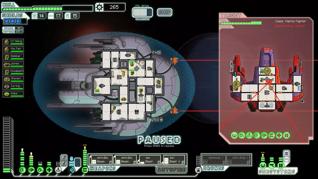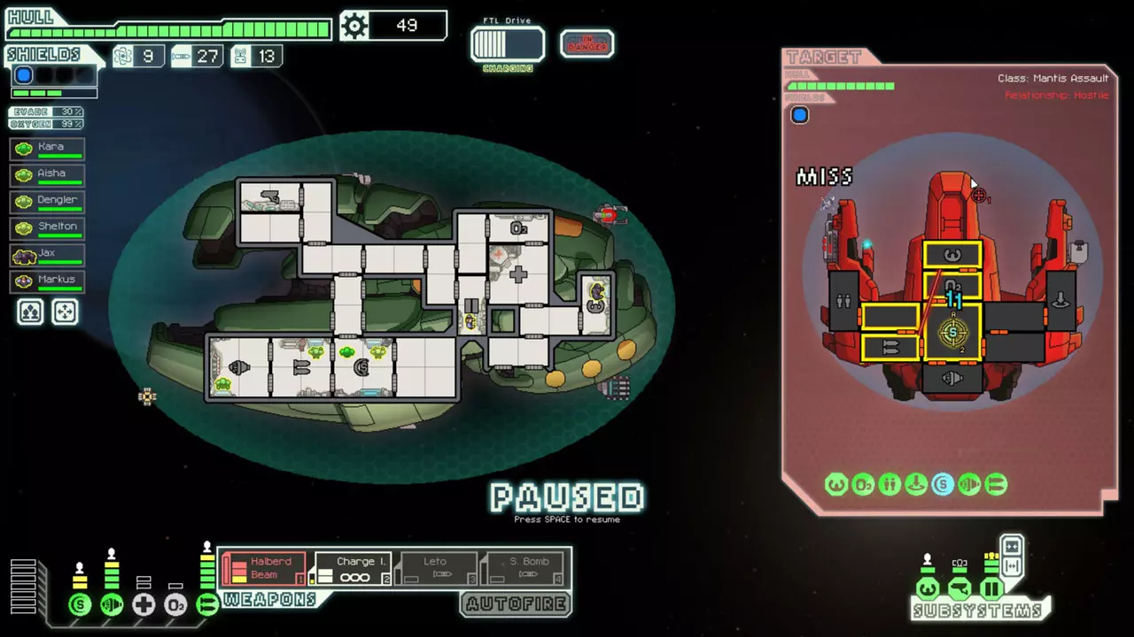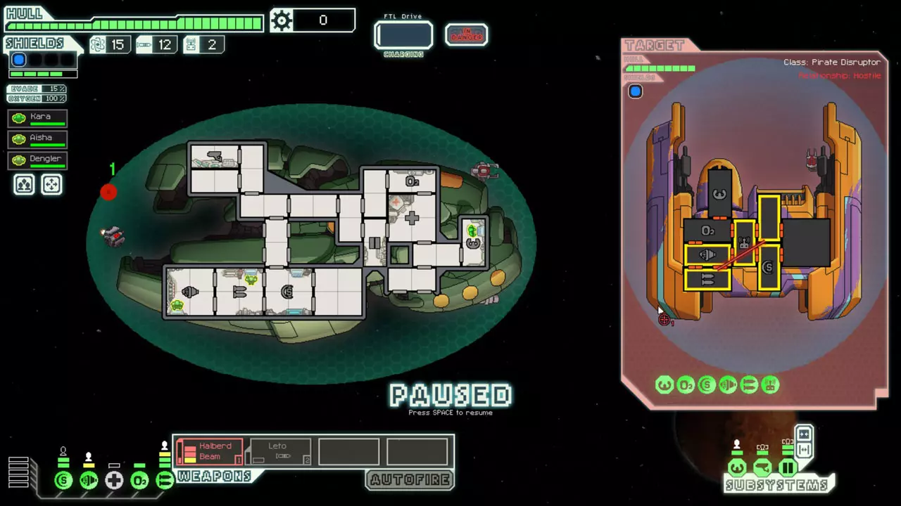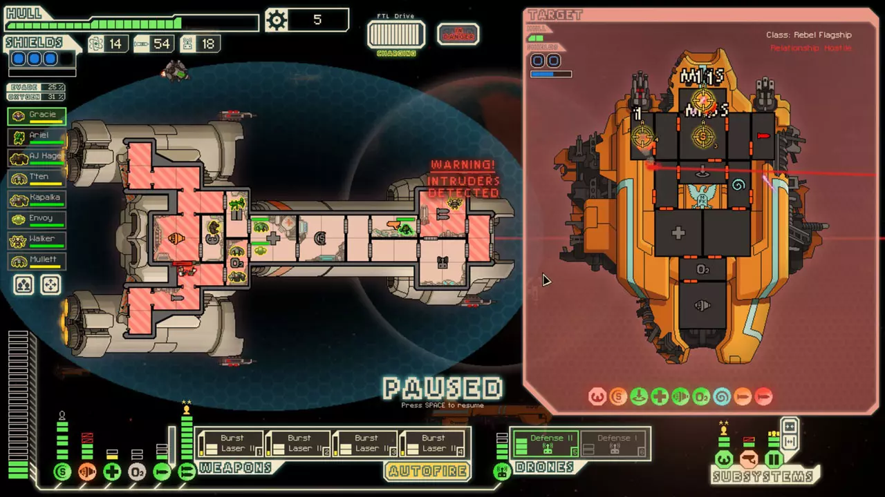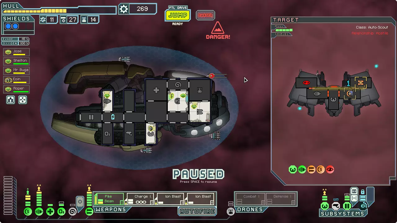 经常暂停来考虑你的选择。这是提升你游戏水平的最佳方法。由于暂停非常重要,我已包含一张暂停战斗的截图。 所有来袭的投射物都会击中房间的正中心。你可以利用这一点来决定如何应对当前情况。你可能需要根据这一点将船员移出房间或使用隐形。 无人机在开火前会瞄准一个房间。有时,你需要留意它们可能瞄准的房间。一个能用到这一点的情况是在早期使用隐形B型舰时。如果你正在与一艘配备无人机的舰船战斗,不要立即隐形。等到无人机即将开火时再行动。如果它要击中的不是武器室或隐形室,你或许应该先等待再隐形。
