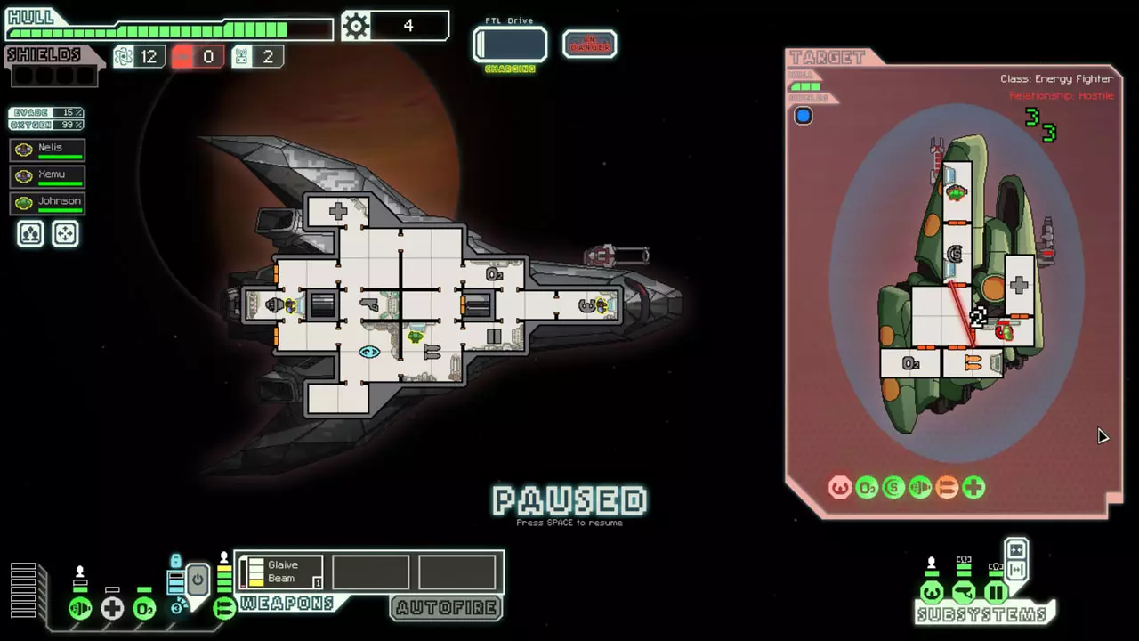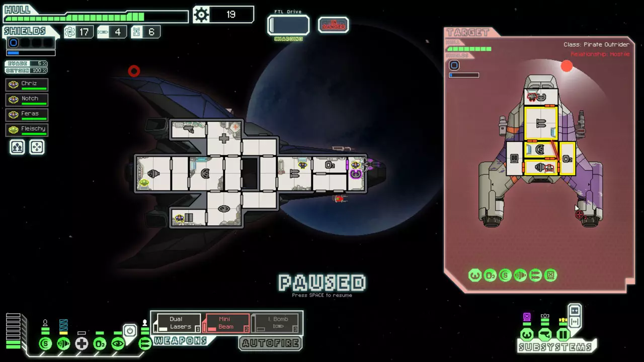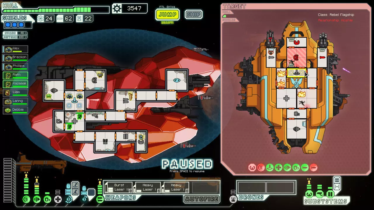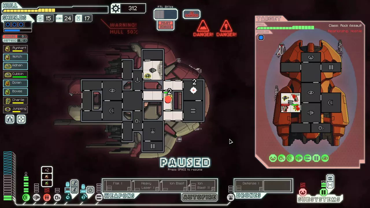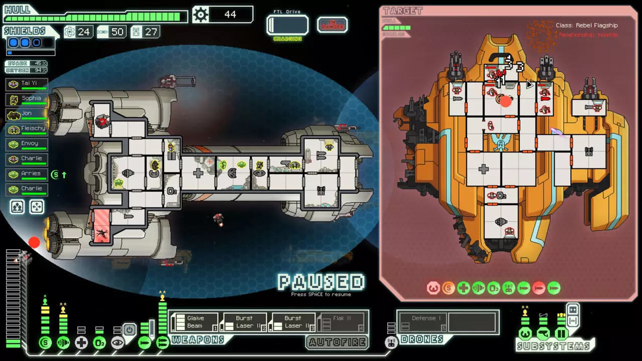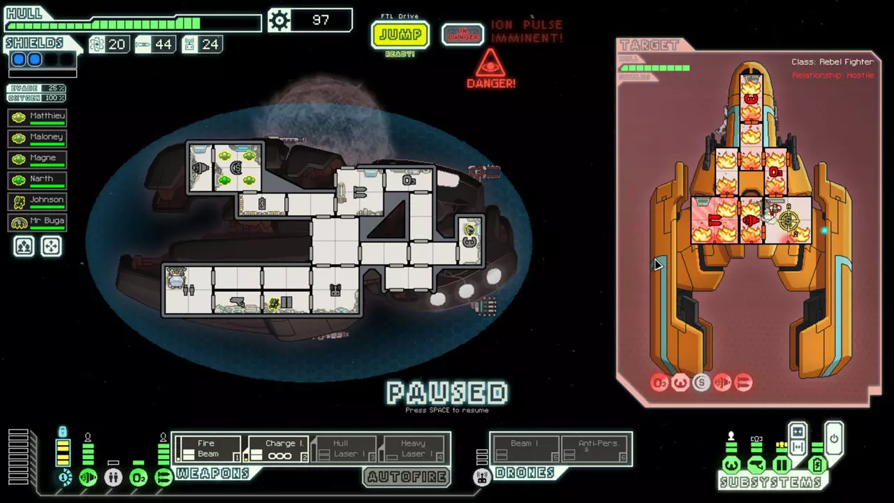 经常暂停来考虑你的选择。这是提升你游戏水平的最佳方法。由于暂停非常重要,我已包含一张暂停战斗的截图。 所有来袭的投射物都会击中房间的正中心。你可以利用这一点来决定如何应对当前情况。你可能需要根据这一点将船员移出房间或使用隐形。 无人机在开火前会瞄准一个房间。有时,你需要留意它们可能瞄准的房间。一个能用到这一点的情况是在早期使用隐形B型舰时。如果你正在与一艘配备无人机的舰船战斗,不要立即隐形。等到无人机即将开火时再行动。如果它要击中的不是武器室或隐形室,你或许应该先等待再隐形。
