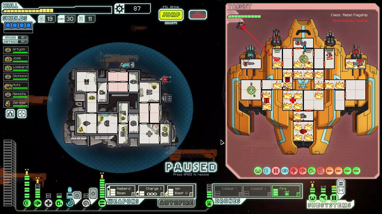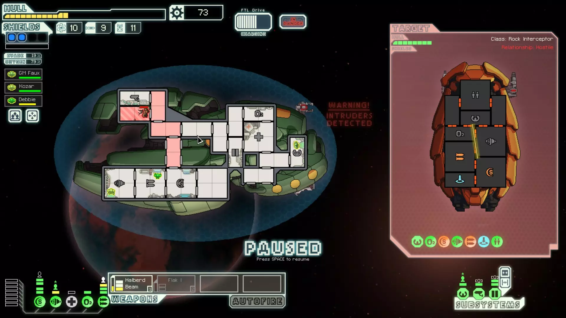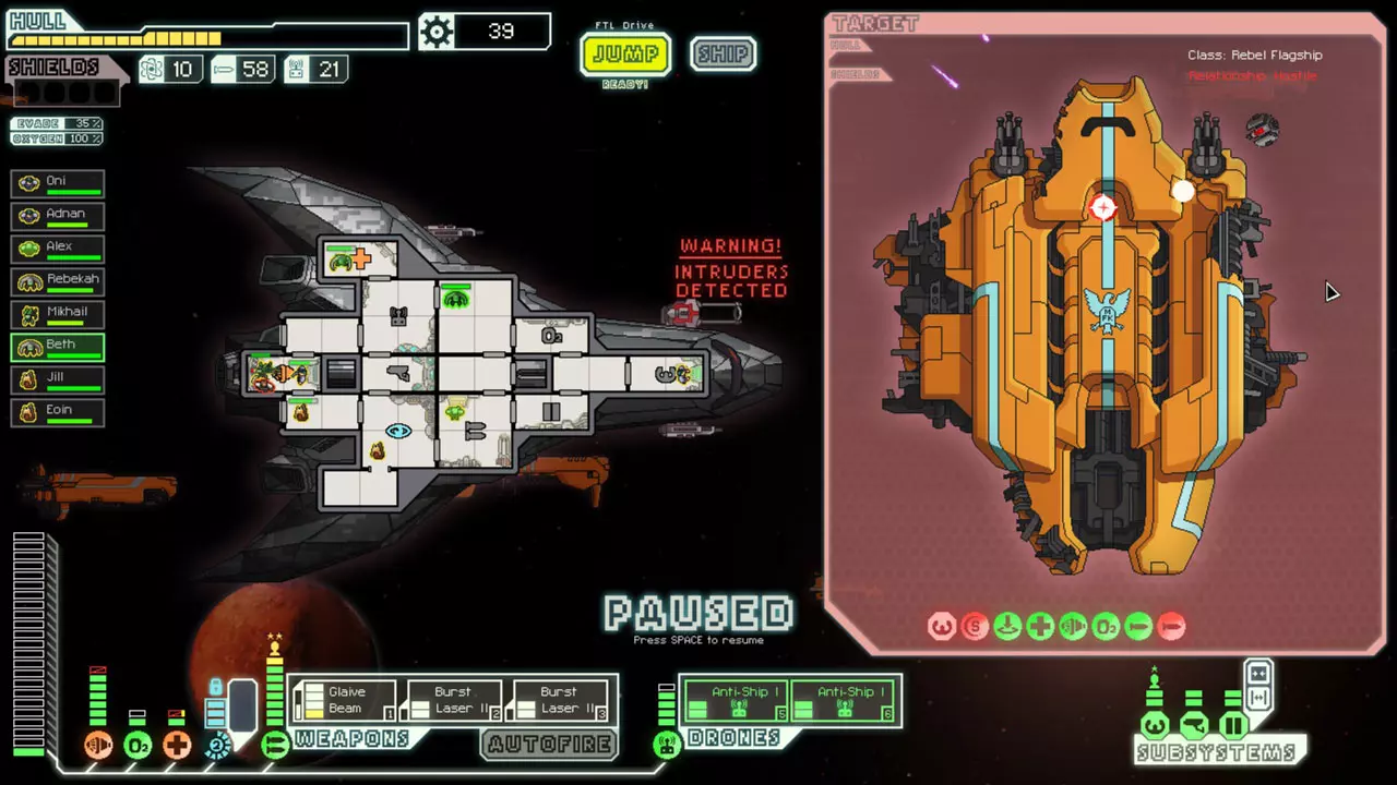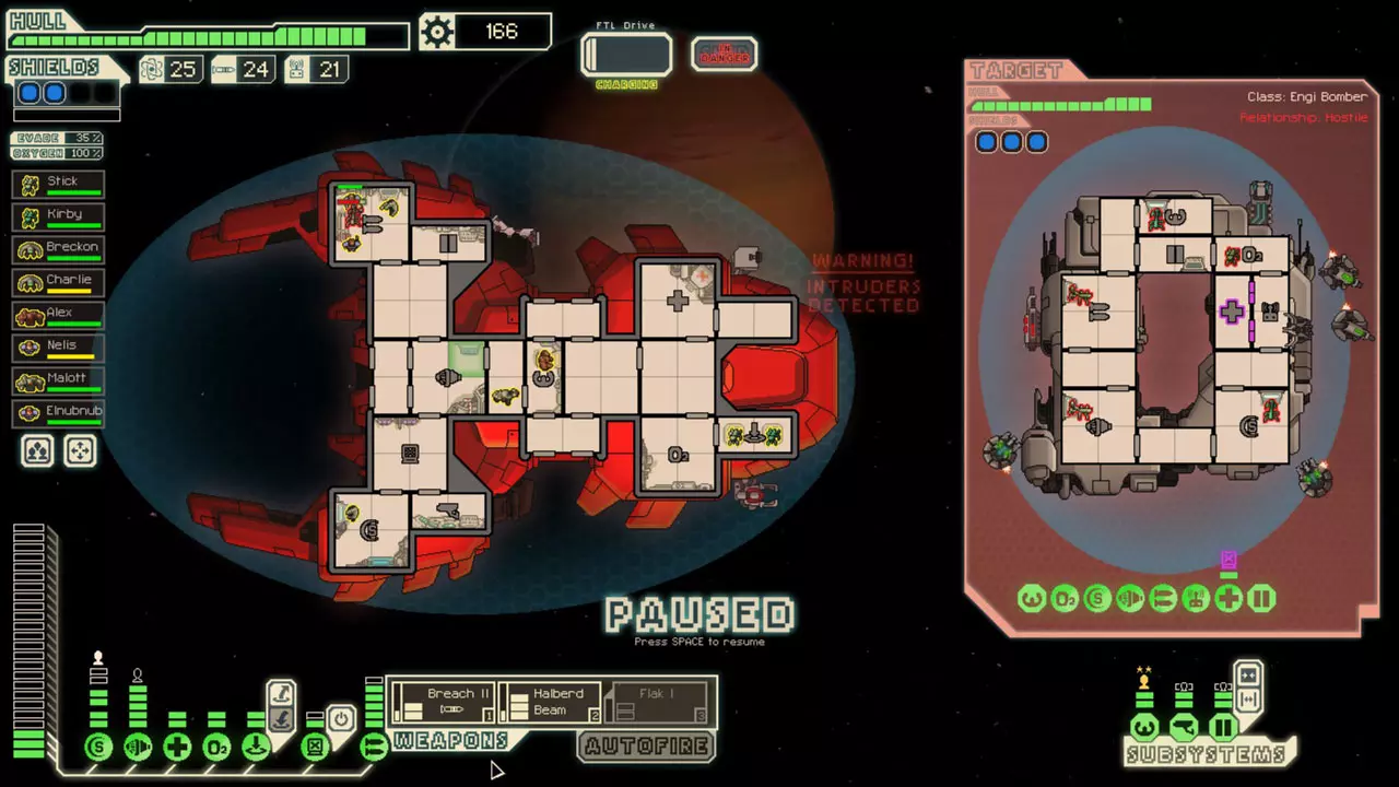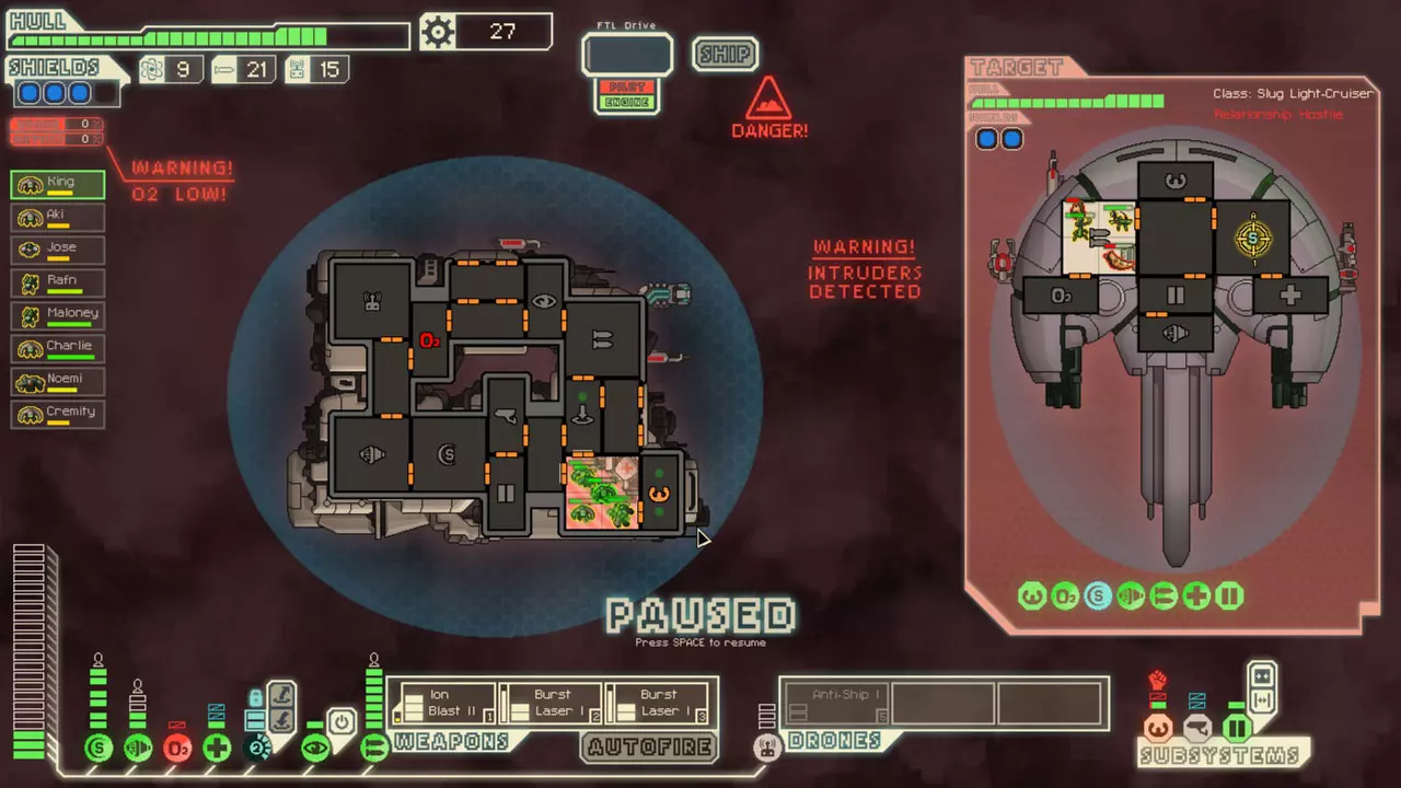 经常暂停来考虑你的选择。这是提升你游戏水平的最佳方法。由于暂停非常重要,我已包含一张暂停战斗的截图。 所有来袭的投射物都会击中房间的正中心。你可以利用这一点来决定如何应对当前情况。你可能需要根据这一点将船员移出房间或使用隐形。 无人机在开火前会瞄准一个房间。有时,你需要留意它们可能瞄准的房间。一个能用到这一点的情况是在早期使用隐形B型舰时。如果你正在与一艘配备无人机的舰船战斗,不要立即隐形。等到无人机即将开火时再行动。如果它要击中的不是武器室或隐形室,你或许应该先等待再隐形。