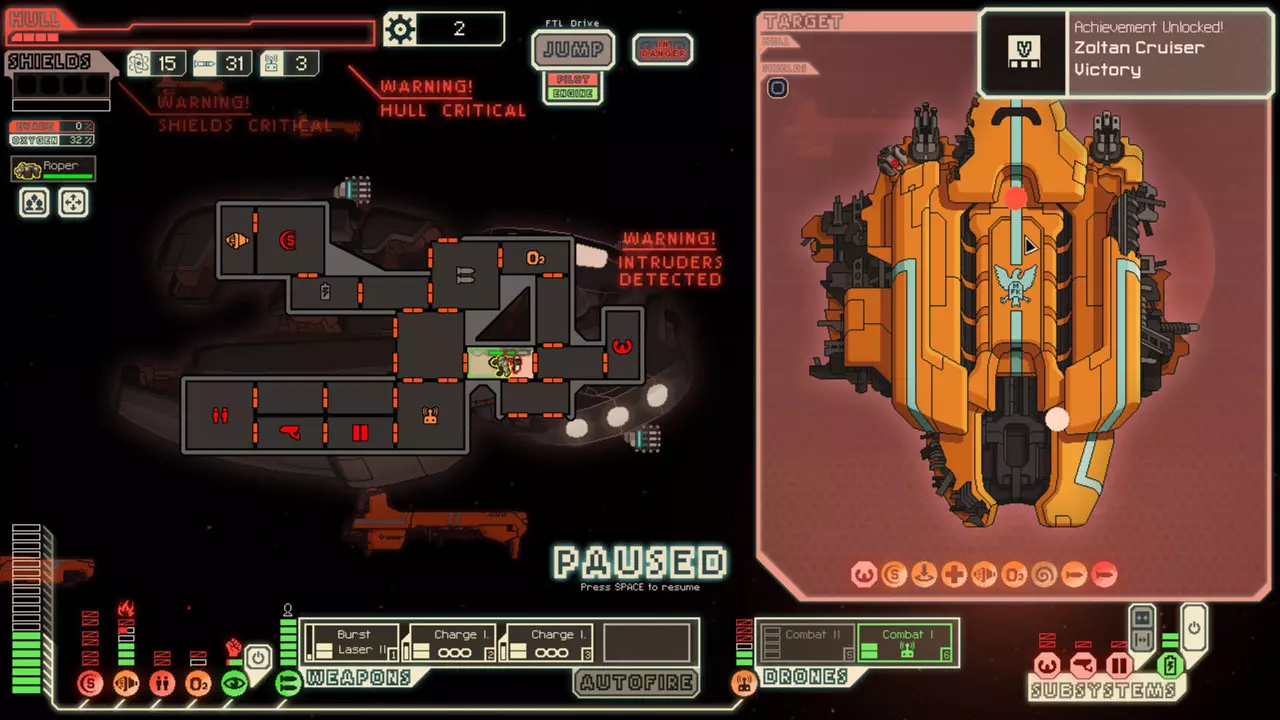 有时候,最好让破损的舱室保持开放状态。以联邦A型舰为例,如果任何带气闸的舱室发生破损,你应该让它们保持开放,因为这些舱室里没有任何系统。破损会让你的飞船更快地排出空气(注意左上角那个舱室。如果你要传送回濒死的登船敌人,而传送室里有人,敌人会传送到左边没有氧气的舱室里……我可能是通过惨痛教训才明白这一点的)。另一个例子是岩石B型舰。它没有气闸,所以如果右下角的某个舱室破损,我通常会让它保持开放,直到有充分理由才关闭。可以参考附近的截图,这是一个故意让破损舱室保持开放以帮助应对登船敌人的理想示例。与佐尔坦人战斗时,若你攻击某个房间,使佐尔坦人不得不穿过护盾室,他们往往会从系统中移除一份能量,导致护盾等级暂时下降一级。抓住这个短暂的机会,让额外一道激光得以穿透。你也可以通过攻击房间来迫使佐尔坦人穿过护盾室。 空格键和鼠标中键都可以暂停游戏,要经常使用。 如果你只有足以摧毁无空气自动侦察机护盾的武器,但同时拥有火焰光束,你仍然可以摧毁它。当护盾消失后,尝试点燃飞船护盾室(以及其他房间)的尽可能多的区域。大约20%的情况下,火焰会燃烧足够长的时间,从而损坏系统,让你能再发射一道激光。 此外,关于火焰光束和无空气侦察机,你可以用光束来重置维修进度。当房间开始燃烧时,任何维修进度都会立即被取消,因为飞船正在灭火。这可以用来在飞船失去行动能力时为自己争取更多时间。 了解你的事件。找出最有利的选项。知道什么时候该冒险,什么时候该稳妥行事。了解哪些种族、强化部件、武器和无人机能触发最有利的蓝色文本事件。 船员在跳跃过程中有2-3秒的时间进行移动、治疗、维修或战斗。这一点可以为你所用。