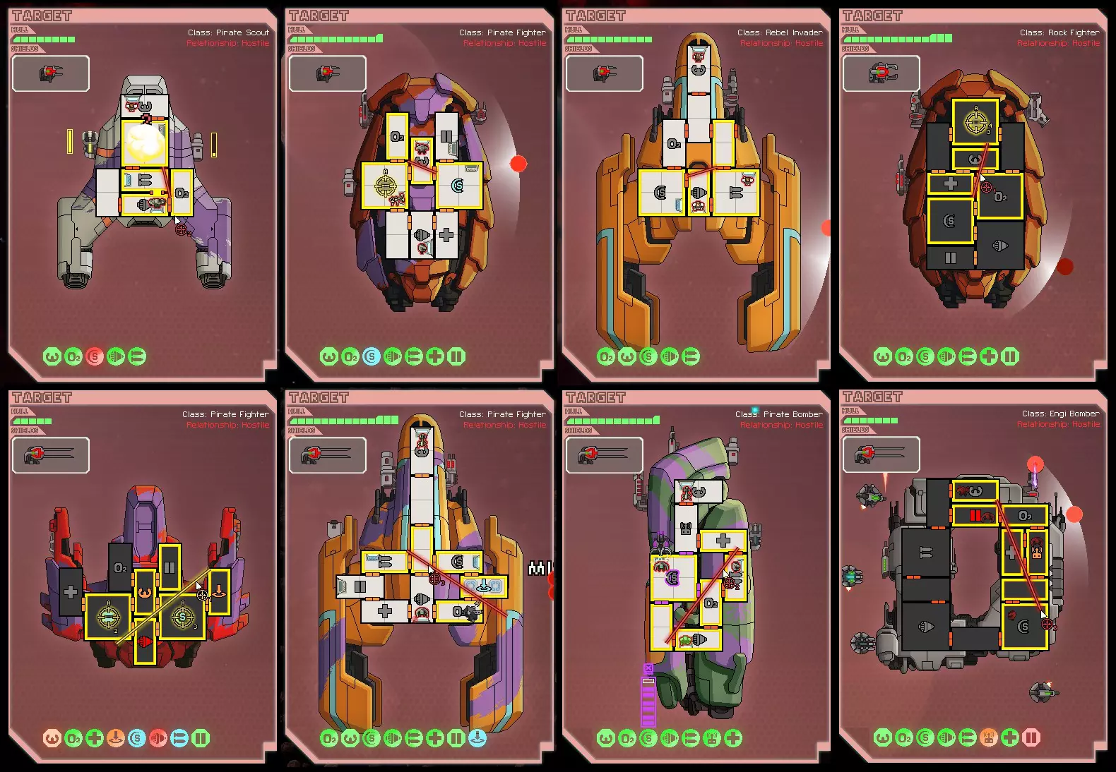 有许多伤害来源往往无法完全规避。 永远不要让船员默认待在医疗室。如果不够小心,黑客入侵可能会迅速杀死他们。 附近的截图展示了一些实际可行的船员站位。拉尼厄斯族炮手独自待在飞船的前部。岩石族飞行员无需离开自己的岗位。螳螂族船员刚刚参与过战斗,但他正在操控舱门,因为登船的敌人正在窒息,而四名空闲船员即将赶回引擎室进行快速维修。在此期间,这些船员会轮流前往医疗室以保持较高的生命值。种族与船员配置[2] 船员招募与奴隶贩子 通常,你应尝试招募至少五到六名船员,理想情况下当然是八名满员。除非船员数量严重不足,或者你想招募一名engi(因其实用性和众多蓝色文本事件),否则通常不应从商店购买船员。如果你正在进行登船作战,且拥有一支不错的登船队伍,那么几乎无需担心船员招募问题,因为通过标准登船奖励通常会随机获得数名船员。如果最终决定购买船员,务必先查看他们的技能。 奴隶贩子是获取船员的重要来源,尤其是早期星区的奴隶贩子。在这些星区,一名船员是相对有价值的奖励。摧毁飞船可能只能获得20单位废料,但他们可能会提供一名价值50单位废料的免费船员。所以如果你船员不足,或者该船员能弥补你的短板(战斗或蓝色技能),你应该考虑接受。话虽如此,如果你在战斗中击杀了敌方船员,无论如何都有很大几率获得一名奴隶。到了游戏后期,奴隶船员奖励的相对价值会低很多。很多时候,摧毁飞船获得的废料价值至少和获得奴隶相当。如果你船员已满或接近满员,并且他们提供的船员种族你已经拥有,那么你可能需要拒绝这个免费奴隶的提议。 获得并留住船员的一个好方法是将医疗室升级到二级。有几个蓝色文本事件可以让你获得免费船员,还有一些事件能让你在不冒船员生命危险的情况下利用局势。大多数能拯救生命的克隆舱事件在克隆舱等级为1时就能触发。 一如既往,要清楚哪些事件对船员生命安全,哪些不安全。 修理 大多数情况下,你需要尽快修理系统、修复破损和扑灭火灾。火灾尤其危险,因为它们会蔓延并损坏系统,但通常应该通过通风来处理。你需要优先修理关键系统,通常从驾驶或护盾开始,引擎和武器紧随其后。 但很多时候,你可以将修理工作留到遭遇战结束后再进行。如果无系统的房间被击破,无需优先处理。如果传感器或舱门受损,也可以稍后再修。只要敌人没有向你发射导弹,无人机控制台就不是必需的。有时,你甚至应该延迟修理氧气室,以保持较高的闪避率。 部分系统修理会在最后一名船员离开房间时重置。修理缺氧房间时,有时需要将船员轮换到医疗室。舱室破裂会逐步修复,因此无需担心船员轮换问题。 如果必须修理已通风的房间,请使用拉尼厄斯族船员。 登船与徒手战斗[1] 如果有机会,你应该进行登船作战。当你通过任何方式消灭敌方船员后,发现随机船员、武器、强化装置或无人机的概率会大幅提升。 通用的登船策略是尽可能利用人数优势作战,并且在敌方船员进入医疗室时立即对其医疗室造成伤害或摧毁它。如果敌方有克隆舱,务必在他们重生前将其摧毁。 水晶人、螳螂人和岩石人是最适合登船作战的种族。如果你有两名兰尼乌斯人协同作战,他们的效果至少能与螳螂人相当。出于明显的原因,不建议将兰尼乌斯人与非兰尼乌斯登船者混合使用。接下来是蛞蝓人(因为他们对心灵控制有抗性),然后是人类。 如果你拥有较高等级的克隆舱和多名佐尔坦人,佐尔坦炸弹策略也是可行的。当它们死亡时,会对房间内所有敌人造成15点伤害。 工程师通常只应在需要将其用作伤害吸收体以保护其他登船船员时才进行登船。
