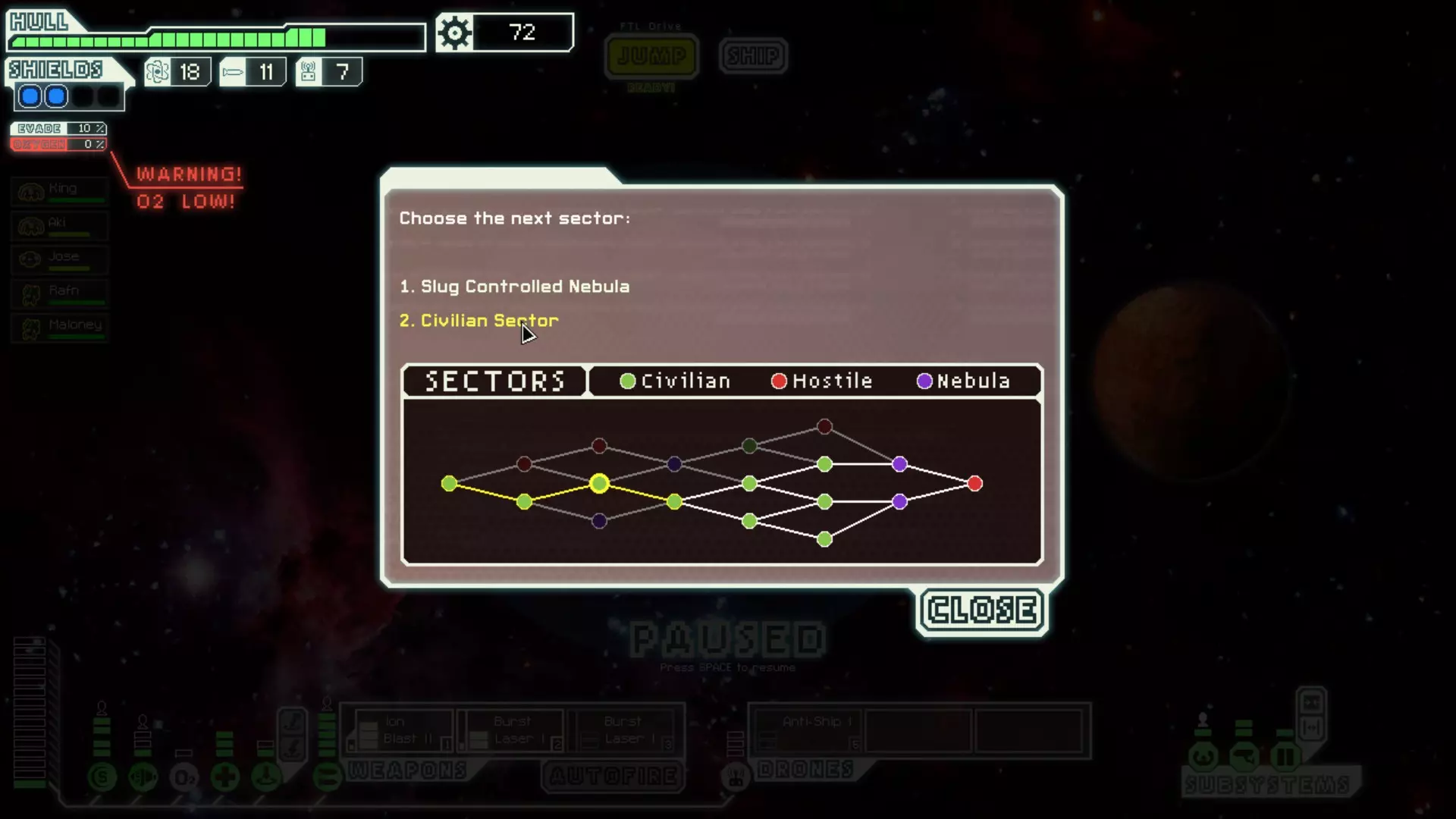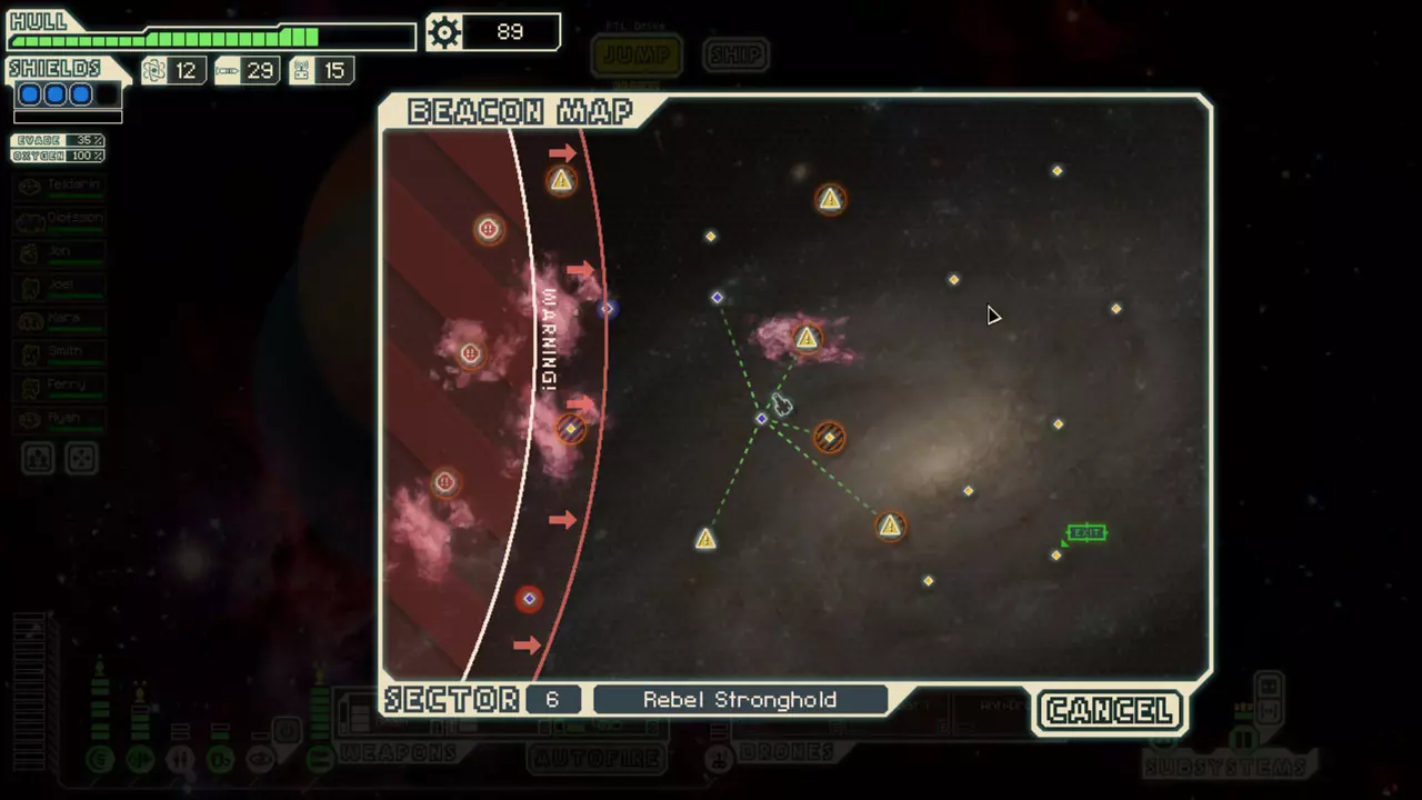 You should usually choose a homeworlds/stronghold sector over other sectors. They have a unique event with substantially higher rewards - the ship unlock quests. Know what you need for the quest before making this call. For example, the Mantis Homeworlds and Engi Homeworlds have very different requirements and rewards. If you have teleporters, upgrade your medbay/clone bay and go Mantis Homeworlds. If you don't, but have an Engi crew, go Engi Homeworlds. All this said, I never go out of my way to choose Slug Homeworlds because the ship unlock quest requires forfeiting rewards - its generally not profitable. If you have the Long-Range Scanners augment, slug sectors can be very profitable. They allow you to seek out encounters, and you get a couple of extra jumps because the nebula slows down the rebel fleet. If you have slug crew, a couple Zoltan crewmembers or a Backup Battery, you should also consider slug sectors. Those make you much more resistant to common events and ion storms. Also, when choosing your sector, look at the entire path rather than just the next sector. If one path funnels you into several other sectors that you don't like, take another path. Specific Sector Types Know the benefits and hazards of each sector and how your ship will deal with them. Rock sectors have many asteroid belts and sun encounters, so they may be hard on your ship if you're low on shields. Their ships tend to have missiles more often than your average ship. Their ship layouts are particularly susceptible to beam and flak weapons. Civilian sectors are your "generic" friendly sector. You'll encounter a fair amount of mercenaries and slavers. They'll usually have a few nebula beacons. Sector one is always a civilian sector. They have lots of stores if you need equipment. I will almost always prioritize this sector type when choosing. Slug sectors are nebula sectors with lots of dishonest slugs, ion storms, and mind control. Sensors never work in nebula. If you encounter a Slug sector beyond four or five, you should consider upgrading your oxygen to level two because they have events that hack it. Rock crew have a few fairly common blue text events in this sector type. If you have a teleporter, there is a common event that can get free crew. Slugs will often plead for their lives with an unknown reward. Most of the time this reward is less beneficial than just destroying their ship. They also have lots of stores if you need equipment. Nebula sectors are similar to Slug sectors but with less Slugs and fewer stores. These have the lowest scrap rewards. I never choose this sector type if I have an option. Zoltan sectors have lots of Super Shields, so be sure you can remove those quickly before choosing this sector. There will also be several nebula beacons in this sector. Otherwise, this is a very profitable sector choice. Engi sectors have many defense drones, so be careful if you're relying on missiles. Engi are very weak to boarding. This sector has a lot of free rewards including drones and weapons. They also have a lot of stores, so this is a great sector to choose if you're struggling. Engi crew have several beneficial blue text events in these sectors. Mantis sectors have lots of boarding events, so be careful if you have a weak crew. You should usually try to start an encounter with one of your crew manning the door system, and maybe consider upgrading doors if your crew is very weak. It may seem counter intuitive, but Mantis ships are also more susceptible to boarding. Mantis sectors have very poor scrap rewards overall. Abandoned sectors have many blue text events for your Lanius crewmember. If you're focused on boarding and you have a crew that happens to breathe oxygen, you should avoid these sectors (Crystal boarding can still be successful here if you're careful). Early (sector 2-4) abandoned sectors are usually very easy, and late abandoned sectors are usually very hard because the large Lanius ship has a lot of systems and weapons. Otherwise, this is above average with its scrap rewards. Rebel Controlled sectors are your "generic" hostile sector. They aren't particularly weak nor strong against any type of offense. They have some boarding events. There are also a fair amount of airless auto-scouts in these sectors. This is the sector type is almost as profitable as civilian sectors, but its generally a little more difficult. Pirate sectors are not a bad choice if you need crew - they have diverse crews and a good amount of slavers and distress beacons. But this sector has below average scrap rewards. You'll basically always want to go to the Crystal Sector if you have a chance. Its a full extra sector of unique dangers and rewards! Individual Sector Routing At the beginning of each sector, you need a basic plan for a route. Familiarize yourself with the sector layout, and make sure that you don't run into any dead ends. Many runs have been cut short because the sector path wasn't planned. The rebel fleet can be extremely unforgiving - especially in early sectors. Generally speaking, you'll want to plan your route so you can pass beside as many beacons as possible. You'll want to do this so you don't miss any stores or distress beacons. I usually accomplish this by generally making an "S" shape through the sector. Exploring like this is even more beneficial when you have Long-Range Scanners, so you know exactly what you're up against and what you want to avoid. You'll also want to consider "diving" into the rebel fleet. It can be very dangerous, so carefully weigh out the costs and benefits. In the first couple sectors, you'll almost never want to engage the rebel fleet. Your low evasion and very slow FTL charge rate will be working against you. In late sectors, you'll almost always want to dive. The scrap rewards are much higher, and the danger will be lower. If you have level 6 engines, or level 4-5 engines with cloaking, you can almost always make it out of those without damage. If you'