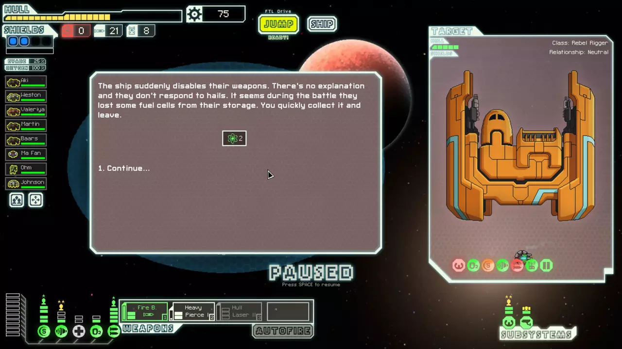 There is a rare event that will occur under very specific circumstances. If you have no fuel, and you permanently disable the enemy ship's engines or piloting, this will prevent them from jumping away. You usually have to disable their systems by breaching and destroying piloting or engines, breaching and destroying the medbay, and damaging the crew to the point that they can't fix either. Rather than a stalemate, the enemy ship gives up and ejects fuel. (See screenshot) You can micromanage Combat drones into directly firing at enemy Defense II drones, which is a godsend for Engi A. Just park it as it prepares to fire and wait for the target to drift into the line of fire. (Thanks to reddit user slowriderxcorps for this tip) Weapon ordering priority on the iPad version is bottom to top rather than left to right. Manning engines actually speeds up how fast your FTL drive charges. So if you need to jump in a hurry, make sure you have someone in there. Also, the charge bonus is greater according to the level of the crew manning the system. Everything damages systems at the same rate. Even though Humans, Engis, Mantis, Boarding Drones, and all mind controlled enemies damage crew at very different rates, they all damage systems at the same speed. Skill level is also irrelevant to system damage. You should be pausing more than you are. Tips and Advanced Techniques [3] Know how to play the odds at stores. Some things will turn up regularly, and others won't. For example, you might want to delay a purchase of an optional system such as hacking in favor of a good weapon such as a Burst Laser II. Burst Laser II's are rare, but there are a very limited number of systems, and you'll almost always have more than one chance to get them. Generally speaking, if you need a good weapon (or augment) at a store that also has a system you'd like, give priority to that weapon. (Thanks to reddit user Sixfortyfive for this tip) All friendly lasers, missiles, ions, and drones can connect with and potentially destroy all non-friendly lasers, missiles, ions, and drones. Ions only stun drones with a chance of destroying them, but any other connection instantly destroys the projectile. This can be used to your advantage in times of need. If you see a large missile coming in toward the front of your ship, and one of your weapons is in line to hit it and ready to fire, you can time it so that the missile will be destroyed. The timing is very precise, so this will take practice. Evasion is calculated when a projectile passes your shields if they're up. If your shields are not up or you don't have shields, evasion is calculated when the projectile would connect with the room it is about to hit. There are a few certain scenarios where its better to depower your shields to give yourself an extra moment before the evasion is calculated. One example of this is the Flagship missile volley. Sometimes the cloak timing is very close to the missile volley. If you depower your shields, it could buy you the extra half second you need to avoid the damage. How much scrap you should keep on hand depends on a lot of factors. If you don't have great weapons, you'll want to try to keep around 80 extra scrap on hand for the next store. If you're low on hull, you'll want to keep enough around for the repair costs (accounting for how much it will cost for the sector you're in). Even if you're not saving up for anything, you'll usually want to try to keep 30-50 extra scrap on hand for cheap crew, discount system upgrades, or other random events. If clone bay is offline and a crewmember is about to die, JUMP to buy him some health before he dies. Depending on the situation, you could possibly even upgrade the Clone Bay for a larger health bonus. If you have enough time, you can force a drone into targeting a specific room. Do this by waiting till the drone is about to fire, seeing the direction its aiming, and guessing which room it could possibly connect with. If you see that its not going to hit a room you want, depower it right then. It will not fire and move on. One specific application of this is for getting early crew kills - especially if you have Mind Control. Use Mind Control to get the crew to low health, then use the drone to pick him off. If a scout or rebel ship is about to jump away and double the fleet pursuit, you can simply jump away first to prevent it from happening. (Thanks to reddit user Rooonaldooo99 for this tip) If fire or boarders are about to destroy a system, remember that your ship is invulnerable during a jump. Jump immediately before the system is destroyed - they will destroy the system during a jump, but your ship won't take hull damage. Here's a useless tip! If a room is locked down for whatever reason, you can actually break through the locked door. It takes 6 crew almost the entire lockdown time, but you can get out before its over. If you have more crew working on the door, you can get out even faster. Here's an exploit for you: Use the Stun Bomb on your active hacking to hack again much sooner. If you hit your hacking system just before the end of it running out, you will only get the cooldown from the five seconds of ion damage rather than the full 20 seconds. This can make hacking far more powerful at the cost of a missile or two. This can also be used on other systems with varying effects. Of those other systems, battery is most useful because it can give you even more power than the max. Thanks to reddit user mekloz for the Stun Bomb research. This definitely falls under the category of bug, but there's a way to get double rewards for battles. If you kill the crew while there's a fire on the enemy ship, the ship will continue to burn after the fight. If its been damaged enough, it will destroy the remaining systems, and the ship will explode. Do this exploit by killing all the crew while there's a fire on board and planning ahead so that the ship will explode afterwards. You'll get rewards when you ki