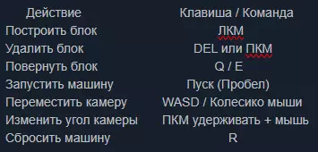 【操作基础】 操作 按键/指令 建造方块 左键 删除方块 DEL或右键 旋转方块 Q/E 启动载具 空格 移动镜头 WASD/鼠标滚轮 调整镜头角度 按住右键+鼠标 重置载具 R