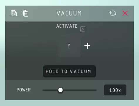 真空 激活: > 开启真空装置。 长按真空: > 按住控制键启动,或通过控制键切换真空装置的开关状态。 功率: > 真空装置吸附物体的力度。
