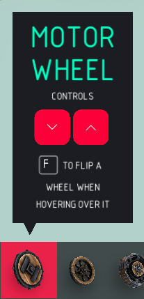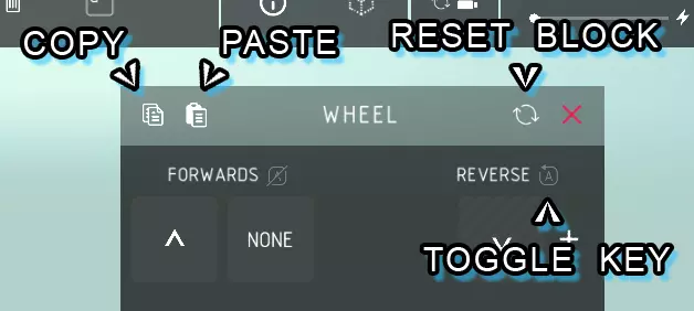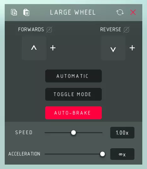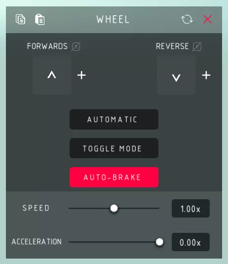 向前旋转: > 向前旋转轮子,编辑时侧面的箭头会指示方向。 反向旋转: > 向后旋转轮子,编辑时侧面的箭头会指示方向。 自动模式: > 自动旋转轮子,无需使用控制键。 切换模式: > 控制键用于切换轮子的开启和关闭状态。 自动刹车: > 控制键停用后,轮子会自动减速至0。 速度: > 轮子旋转的最大速度。 加速度: > 轮子达到最大速度的快慢程度。