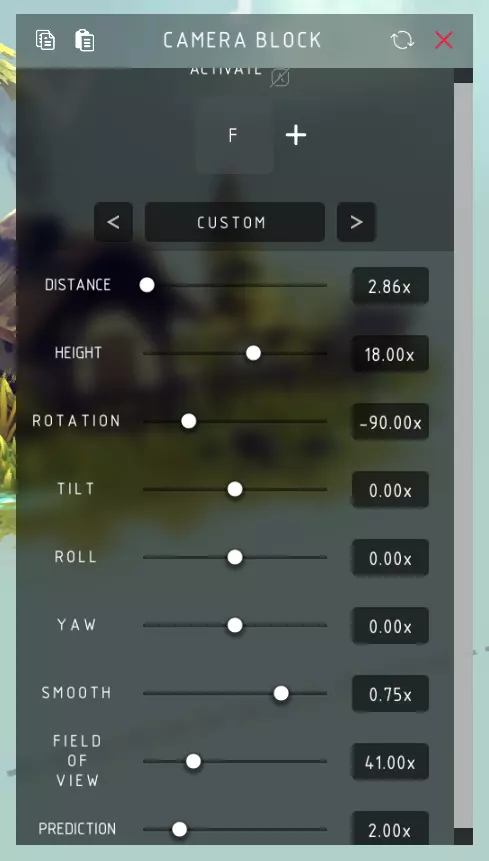相机模块 激活: > 切换至相机视角。若多个相机模块设置了相同的控制键,按下该键可循环切换。 预设: 直立视角: > 基础跟随相机视角,包含距离、高度、旋转、倾斜、翻滚、偏航和平滑度设置。 精准追踪: > 基础跟随相机视角,在机器转弯时跟随更紧密,包含距离、高度、倾斜、翻滚、偏航和平滑度设置。 第一人称: > 直接位于相机模块上方的相机,随机器实时精确转向,包含距离、高度、旋转、倾斜、翻滚、偏航和视野设置。自定义: > 垂直摄像机,可调整距离、高度、旋转、倾斜、侧倾、偏航、平滑度、视野和预测。 高级选项: > 切换是否能编辑侧倾、偏航和平滑度。 距离: > 摄像机与摄像模块之间的距离。 高度: > 摄像机围绕摄像模块沿垂直轴旋转(相对于摄像模块)。 旋转: > 摄像机围绕摄像模块沿水平轴旋转(相对于摄像模块)。 倾斜: > 摄像机相对于自身进行上下倾斜。 侧倾: > 摄像机相对于自身进行左右侧倾。偏航: > 围绕相机自身的水平轴左右转动相机。 平滑度: > 使相机移动更加平滑,避免抖动、颠簸和突然转向。 视野: > 相机视角的视野范围。减小此值可以让相机从更近的距离放大远处目标。 预测: > 我已尝试在游戏中测试此设置,但不清楚其具体作用。