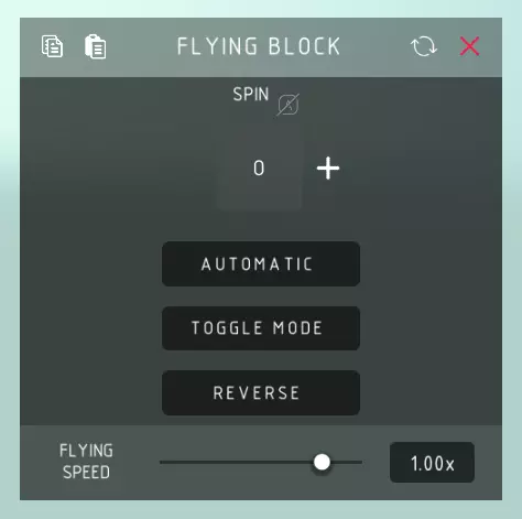 飞行方块 旋转: > 旋转飞行方块。 自动: > 自动旋转飞行方块。 切换模式: > 允许你开启或关闭飞行方块。 反转: > 反转旋转方向,从而反转飞行方向。 飞行速度: > 飞行方块的旋转速度,以及飞行方块飞行的速度和力度。