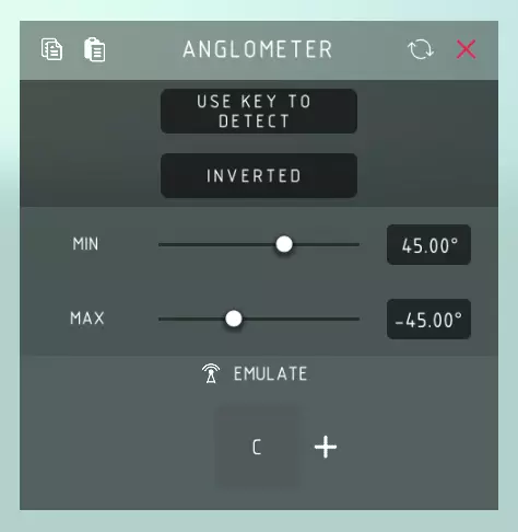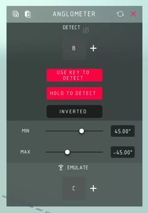角度仪 检测: > 按住控制键以检测当前角度。 使用按键检测: > 启用控制键检测角度,而非角度仪自动持续检测角度。 按住检测: > 允许按住控制键以持续检测角度。 反转: > 反转角度仪的触发条件,当角度仪不在设定角度范围内时模拟控制键。 最小值: > 角度仪需逆时针倾斜的最大角度(度),达到此角度时激活模拟按键。 最大值: > 角度仪需顺时针倾斜的最大角度(度),达到此角度时激活模拟按键。模拟: > 模拟按键操作,相当于为你按下控制键。