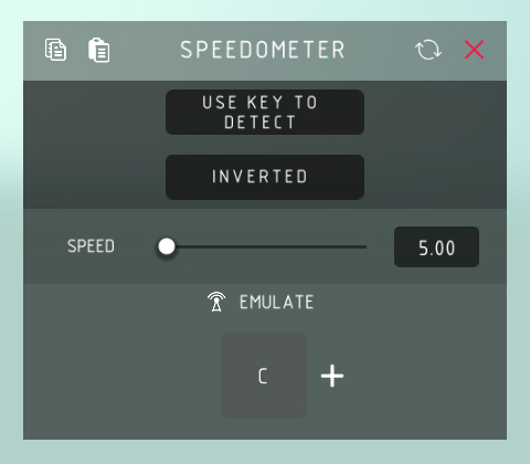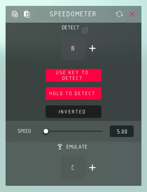 速度表检测: > 控制键用于检测当前速度。 使用检测键: > 启用控制键来检测速度,而非速度表自动持续检测速度。 按住检测: > 允许按住控制键以持续检测速度。 反转: > 反转速度表的触发条件,当未达到设定速度时模拟控制键操作。 速度: > 速度表需要达到的激活速度值。 模拟: > 模拟按键操作,自动帮你按下控制键。