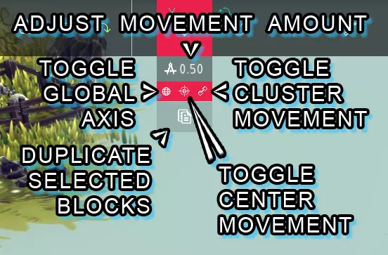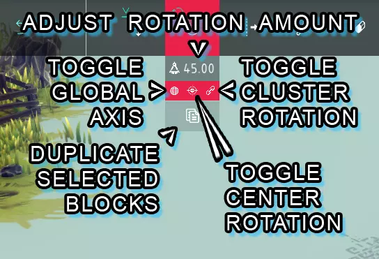 调整移动量: > 图标类似绘图圆规的旁边有数字输入框,用于更改所选方块的移动距离增量。默认值为0.50,即0.5个方块。 切换全局轴: > 图标类似带网格的圆形按钮,用于在移动工具的本地轴和全局轴之间切换。 复制所选方块: > 底部类似两张纸/文件的按钮可复制所选方块。复制出的方块会生成在与原方块相同的位置,因此复制后需要移动它们。切换集群移动: > 类似链条链接的按钮可将移动工具切换为按集群移动方块,可通过快速设置下的集群按钮查看集群。 切换中心移动: > 类似十字准星的按钮可将移动工具切换为从方块中心而非附着点移动方块。 高级编辑旋转工具菜单