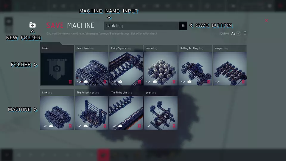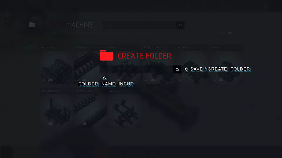 机器名称输入: > 在此文本框中输入你的机器名称。这是你加载机器时需要查找的名称,同时也是游戏文件中存储机器信息的文件名。 保存按钮: > 使用此带有软盘图标的按钮来保存你的机器。 新建文件夹: > 使用文件夹图标创建新文件夹。创建新文件夹的界面如下。 机器: > 每台机器都有一张显示机器预览的小图片及其名称。双击图片可加载该机器。 文件夹: > 文件夹外观类似机器,但颜色更深且顶部有标签,使其看起来像文件夹。双击文件夹可进入其中。 新建文件夹菜单