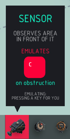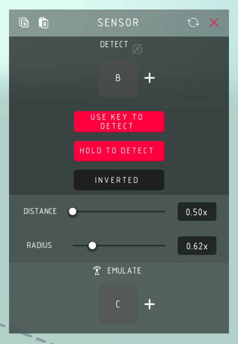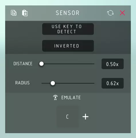 传感器检测: > 启用传感器以检测物体。 使用按键检测: > 切换是否通过控制键激活传感器的功能。 按住检测: > 按住控制键进行检测的功能,否则控制键用于切换传感器开关。 反转: > 反转传感器的模拟条件,仅在未检测到物体时模拟控制键。 距离: > 传感器可感知物体的最远距离。 半径: > 传感器检测圆柱的检测半径宽度。 模拟: > 模拟按键按下,相当于自动帮你按下控制键。