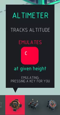 高度计 检测: > 检查高度。 使用按键检测: > 将高度计更改为仅在激活控制键时检测高度。 按住检测: > 允许按住控制键以持续检测高度。 反转: > 反转高度计的模拟要求,仅当不在设定高度范围内时才模拟控制键。 高度: > 高度计检测的高度值。 模拟: > 模拟按键操作,相当于为你按下控制键。