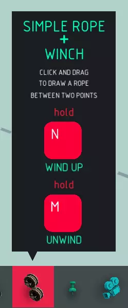 名称 简易绳索+绞盘 尺寸 可变 可破坏?可切割 易燃?是 【简易绳索+绞盘】是一种非固体绳索线,类似于【支架】。绳索+绞盘通过控制键收放绳索,从而有效延长和缩短绳索。与【可收缩弹簧】和【支架】类似,无论两端位于何处或绳索中间处于何种状态,绳索+绞盘在其两端之间始终保持直线状态。